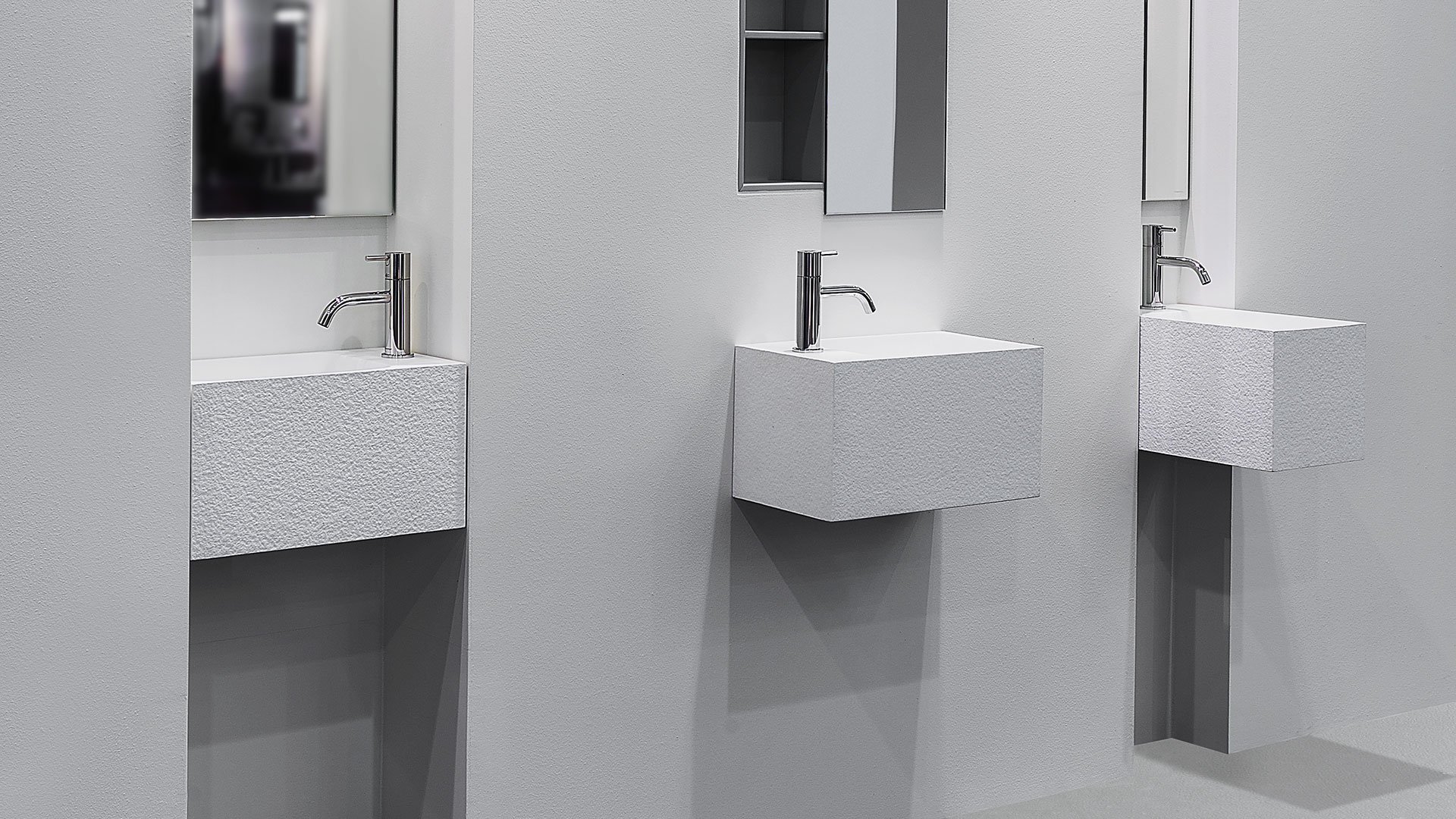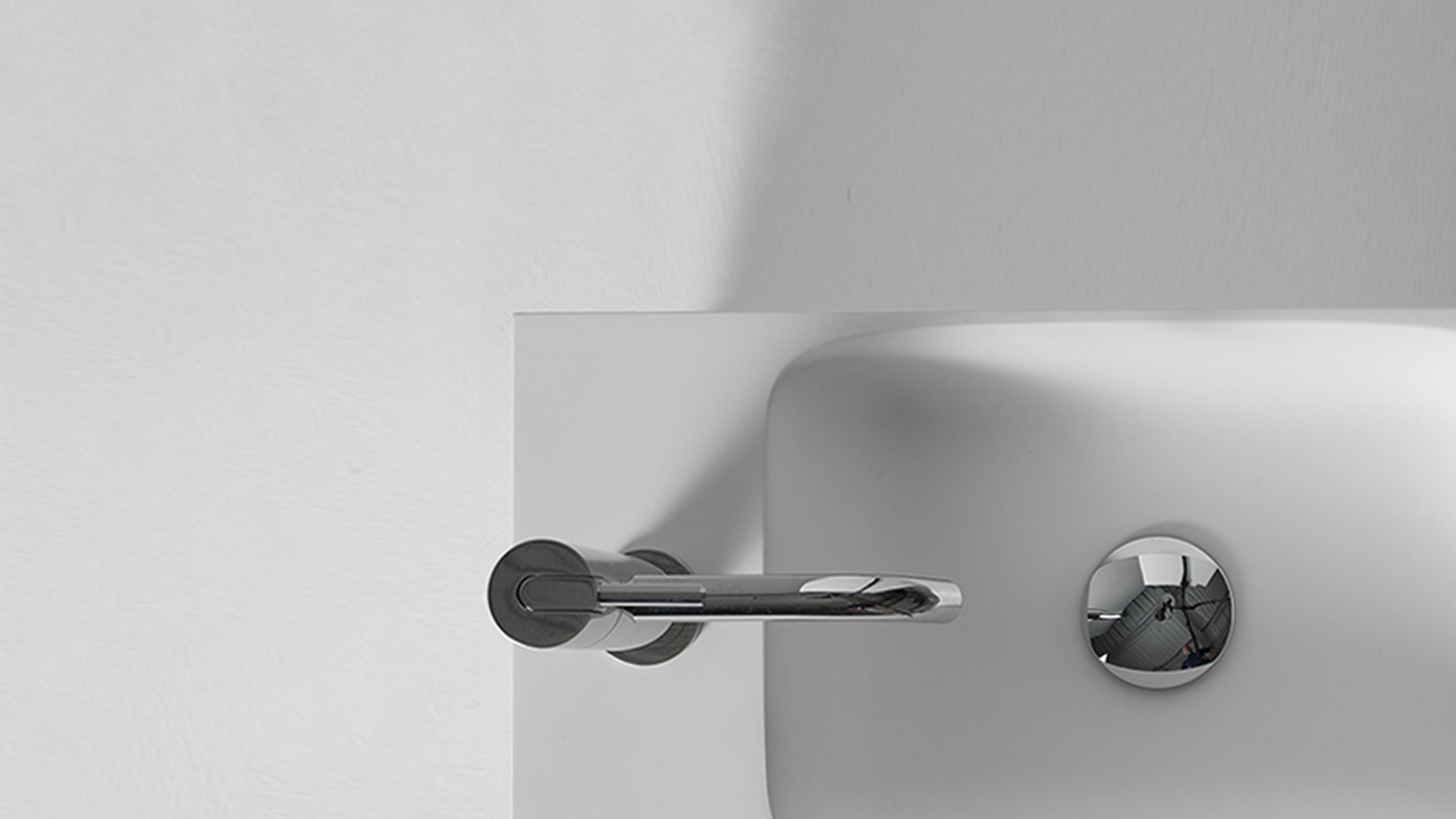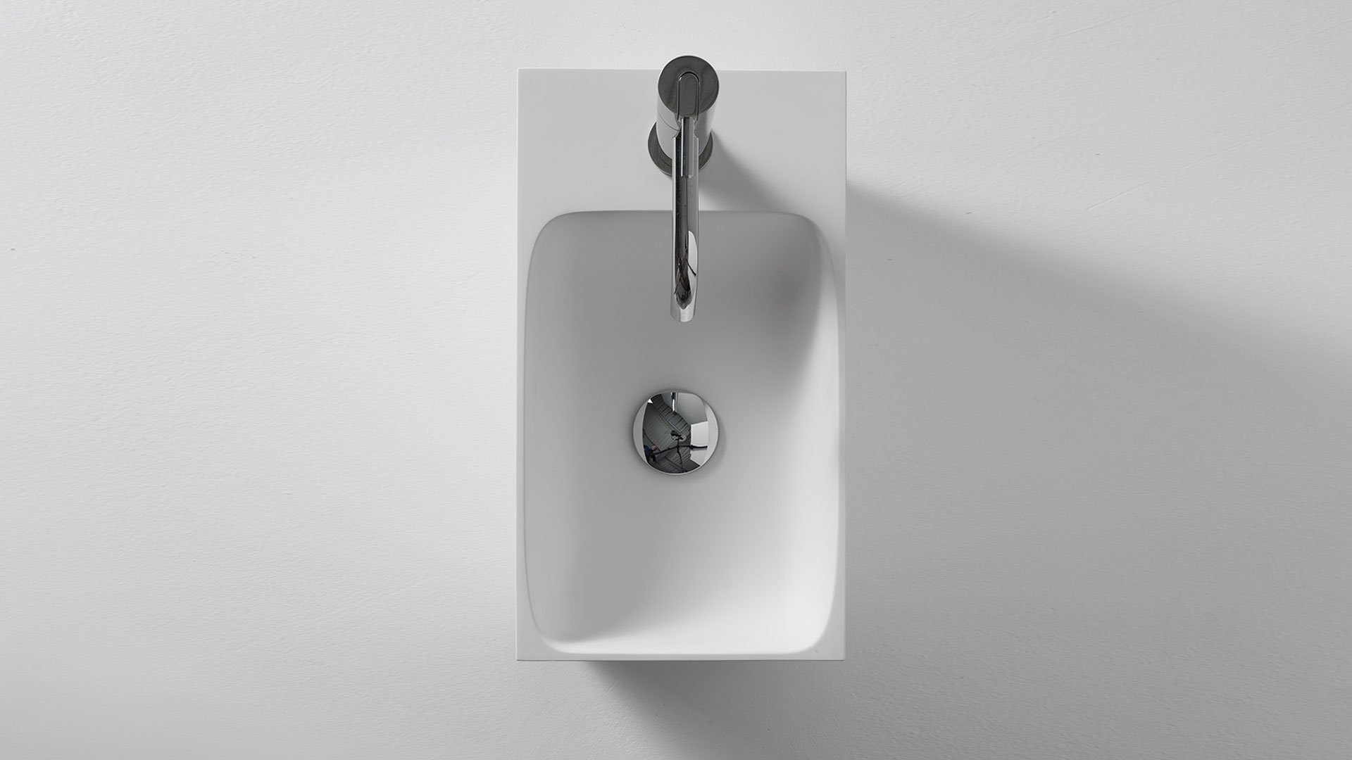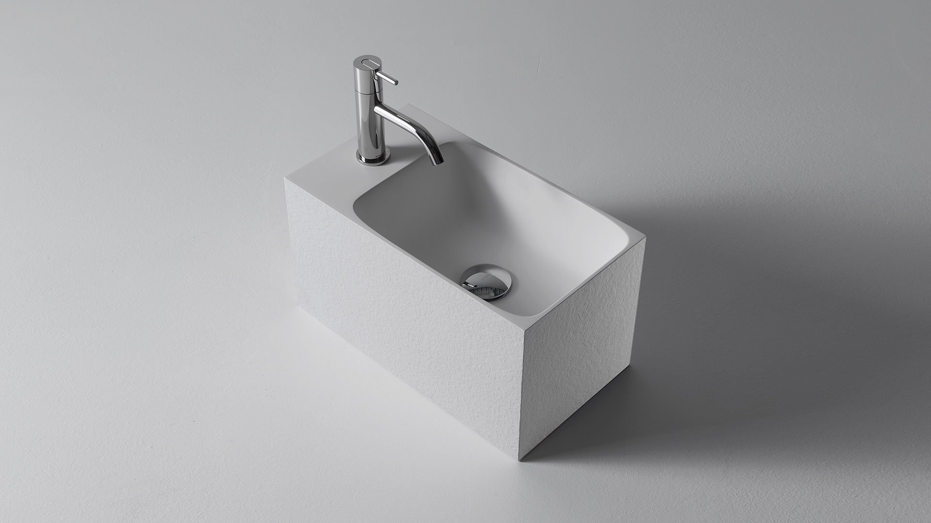 Rectangular wall mount Flumood? sink texture finish, right or left version, complete with drain pipe fitting and open plug.