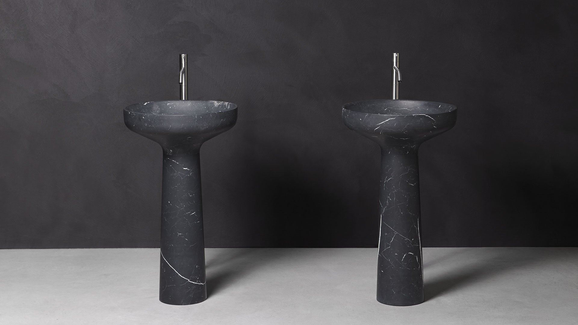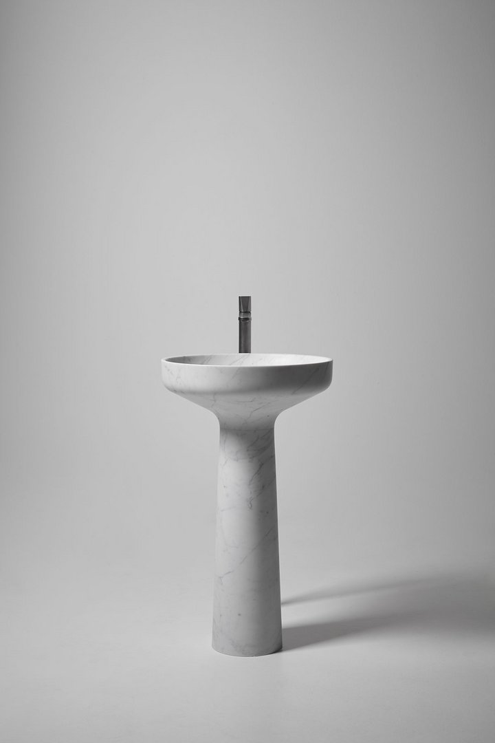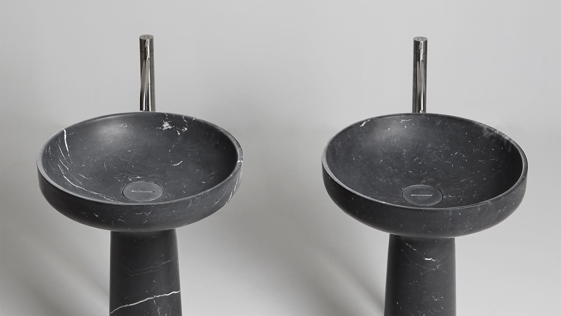 Freestanding stone sink complete with drain pipe fitting and plug, trap and flexible hose.