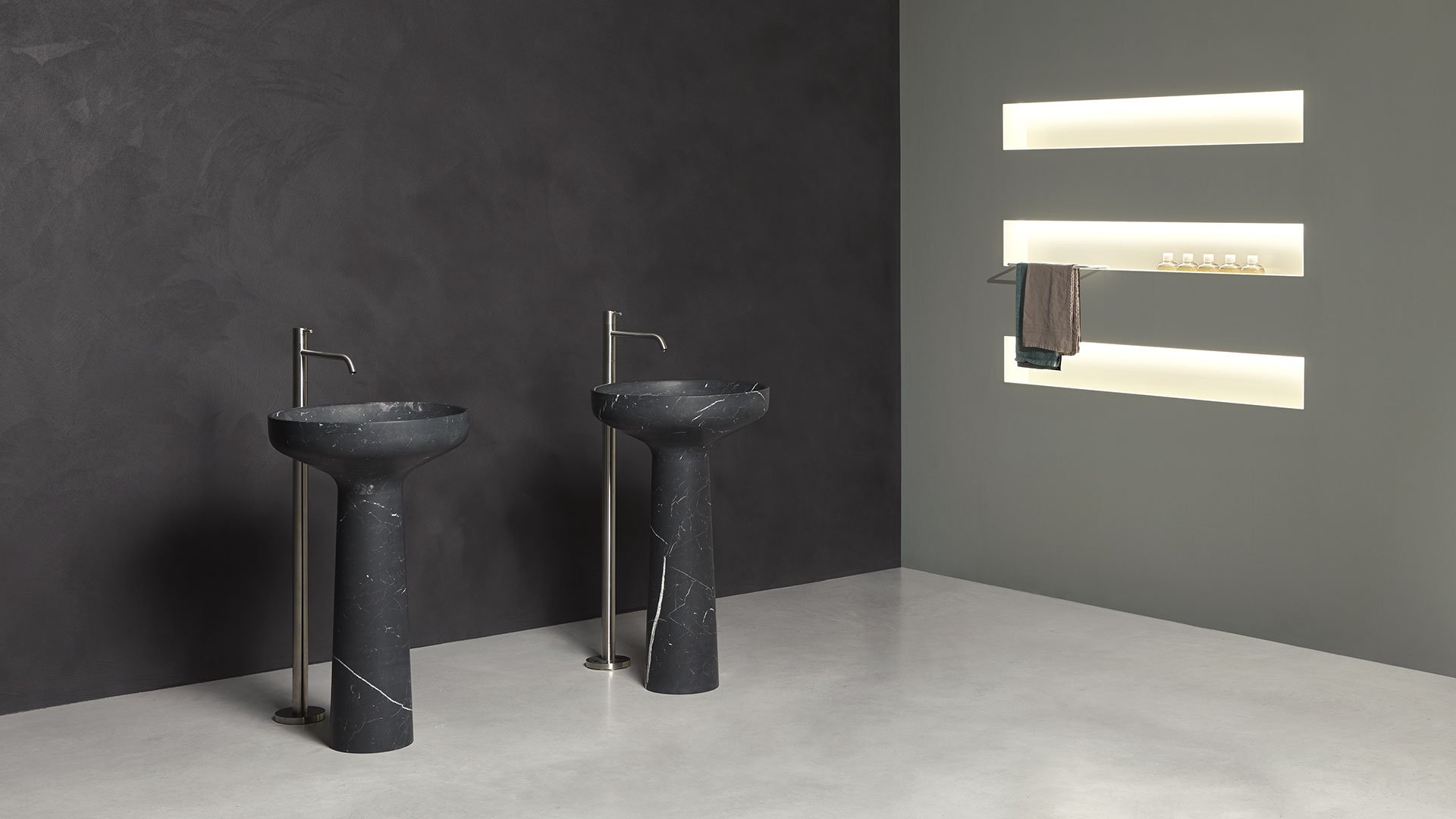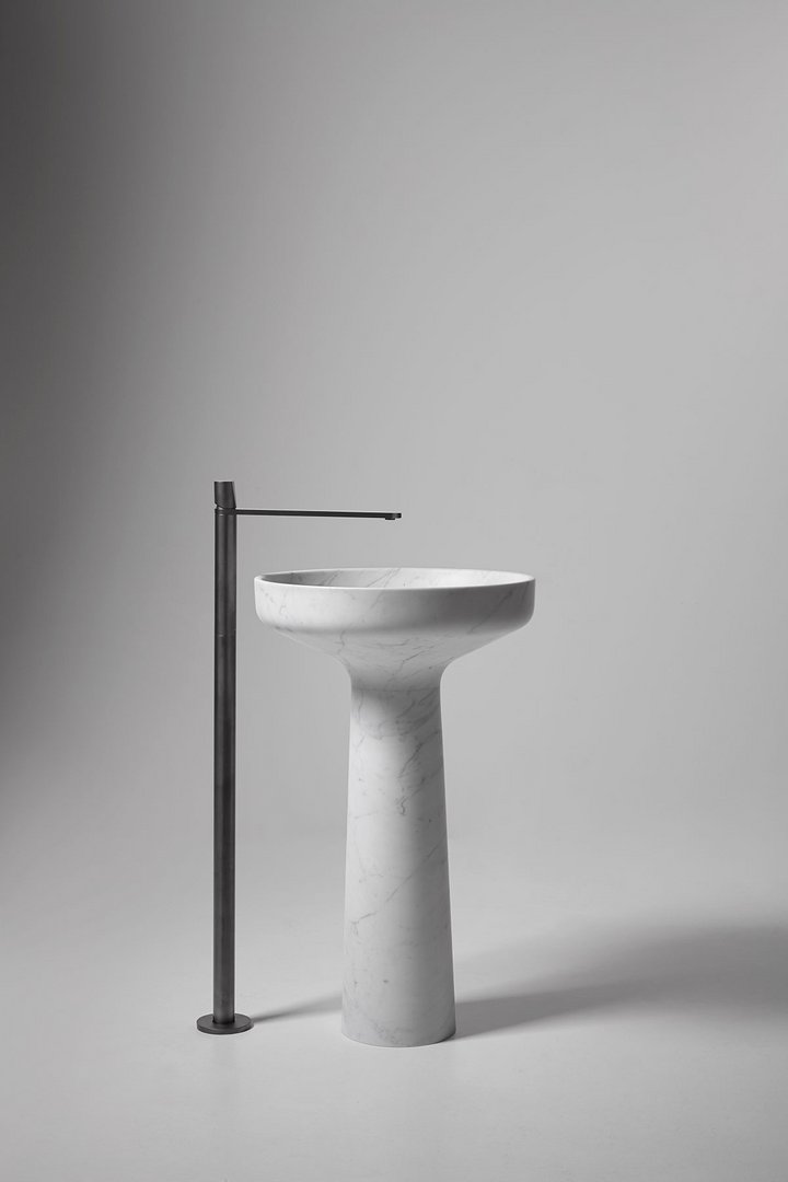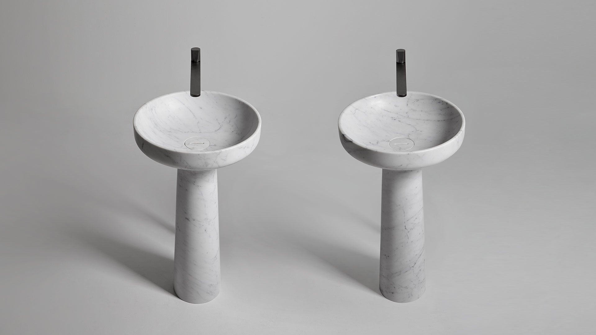Freestanding stone sink complete with drain pipe fitting and plug, trap and flexible hose.