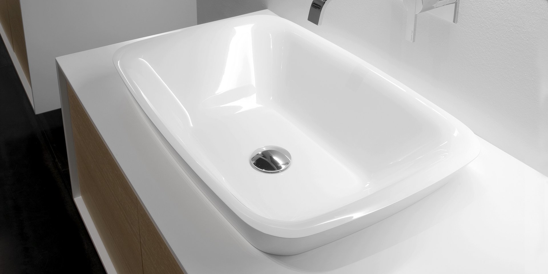 Rectangular encased Ceramilux sink, complete with drain pipe fitting and open plug.