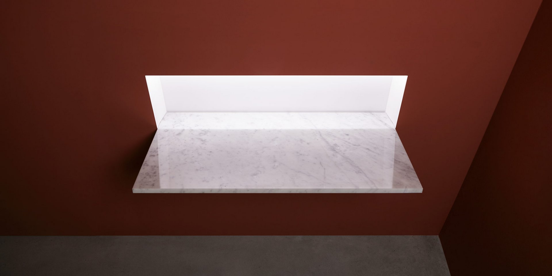 Encased Corian sink with or without led lighting, complete with taps, inspectable drain, siphon and flexible hose. Available with glass or Carrara marble surface.