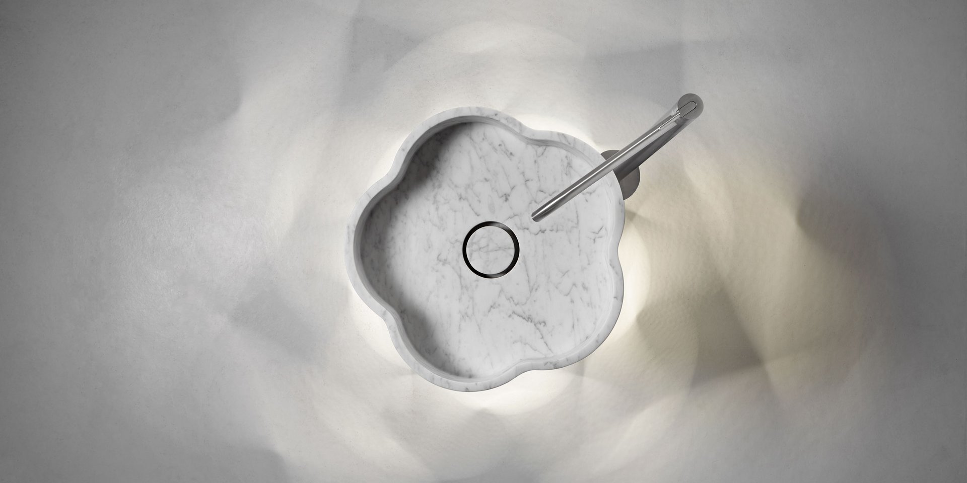 Freestanding stone sink with floor drainage complete with open plug, siphon and rigid hose.