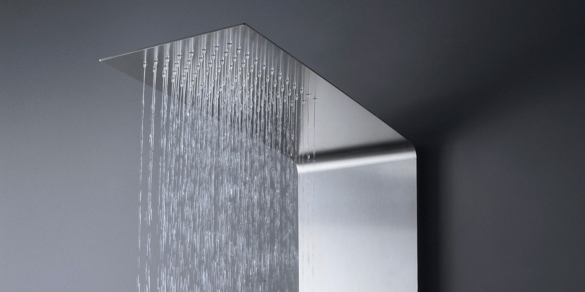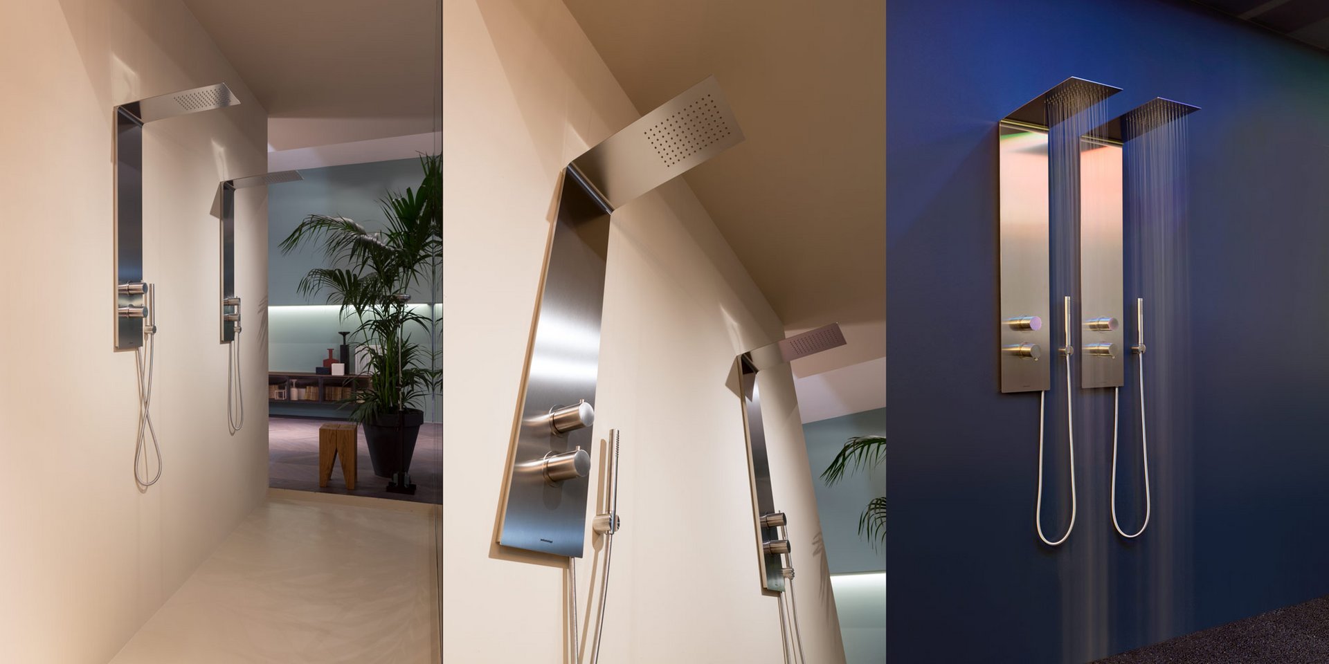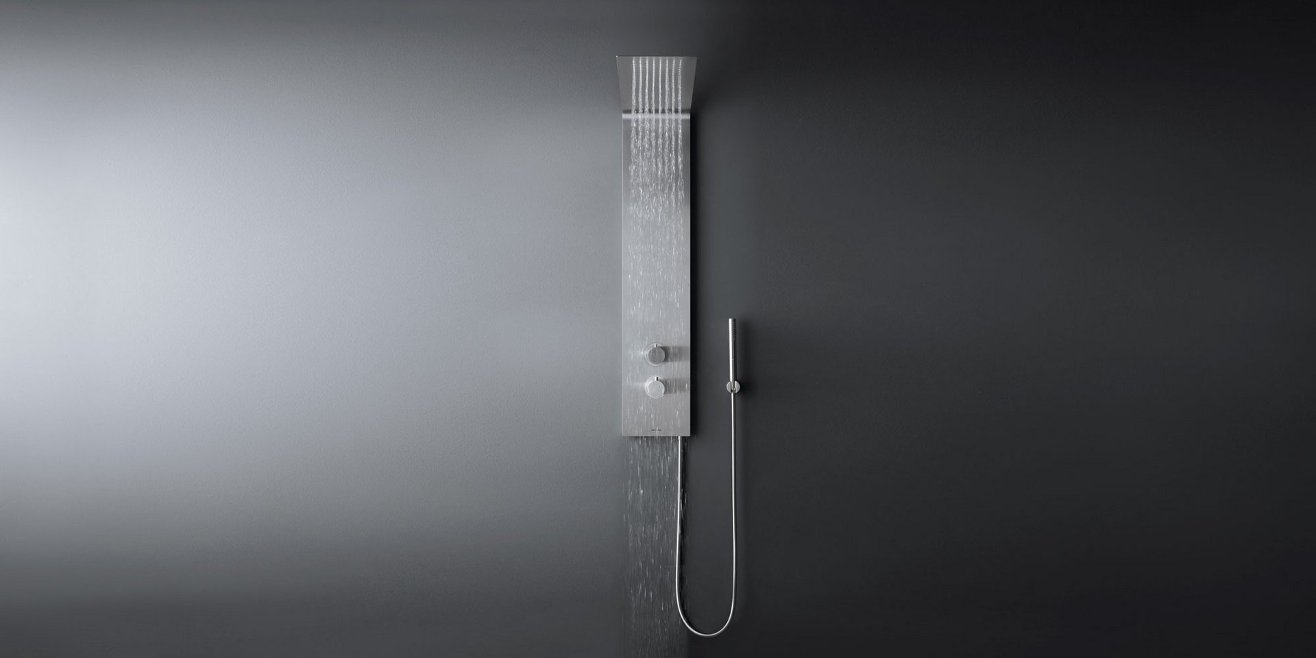 Showerhead column in stainless steel complete with thermostatic mixer, command handle with 2-way diverter and hand shower with hose 150 cm.