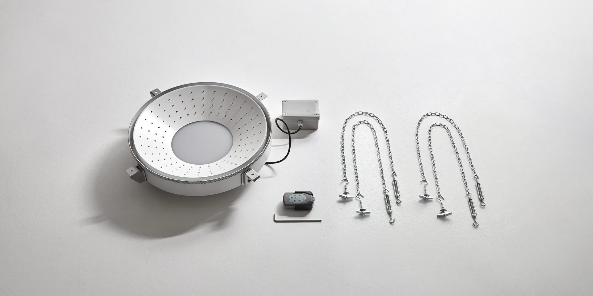 Ceiling encasing structure in AISI 304 lacquered white with LED RGB lighting complete with waterproof remote control.