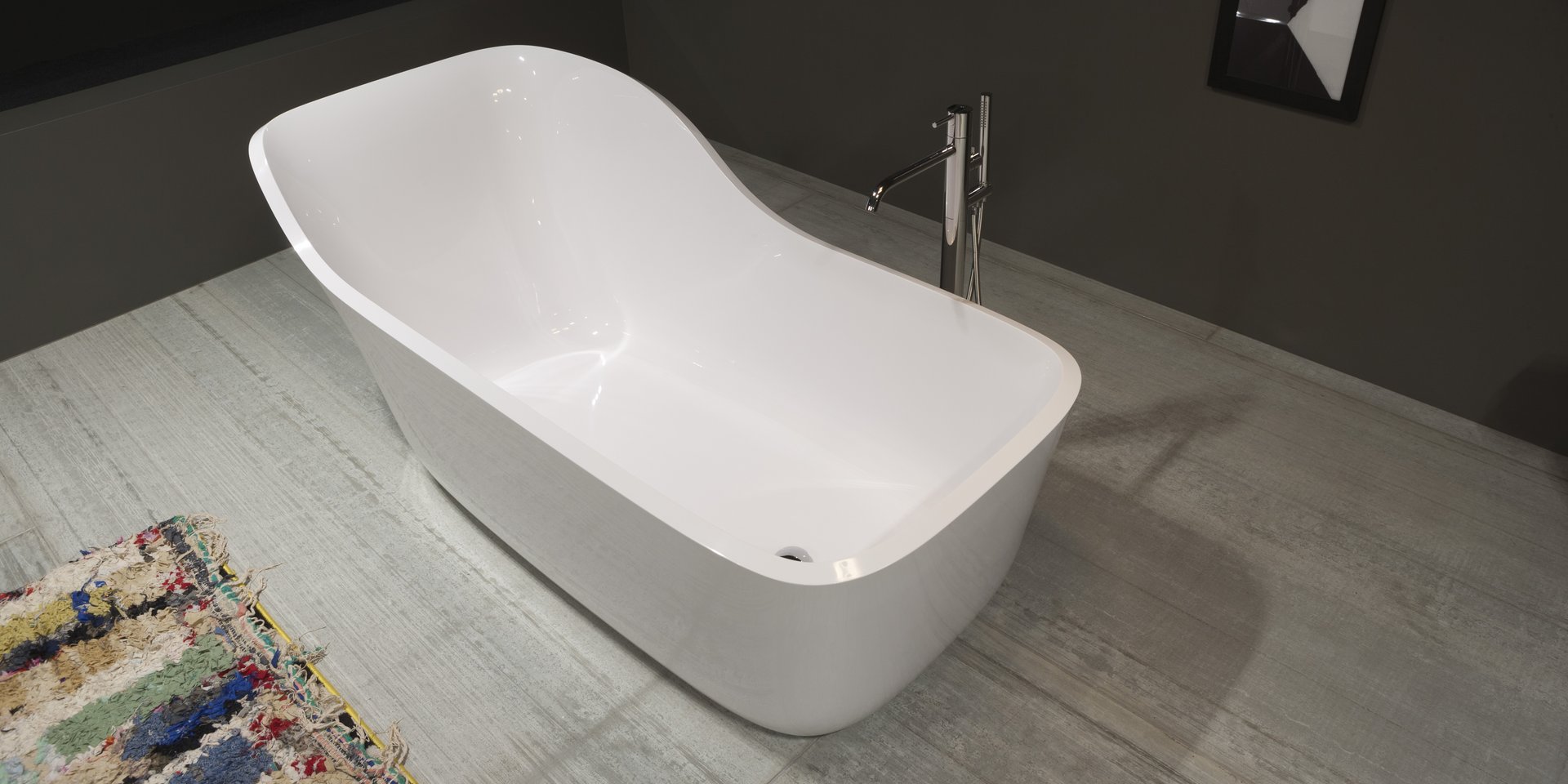 Vasca da bagno edizione limitata in pietra Stone Grey, completa di piletta con sistema di scarico a pressione click-clack, peso 1.600 kg, capacità 400 l.