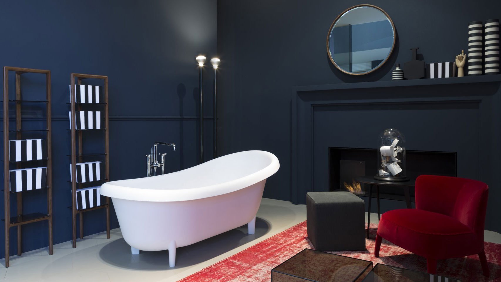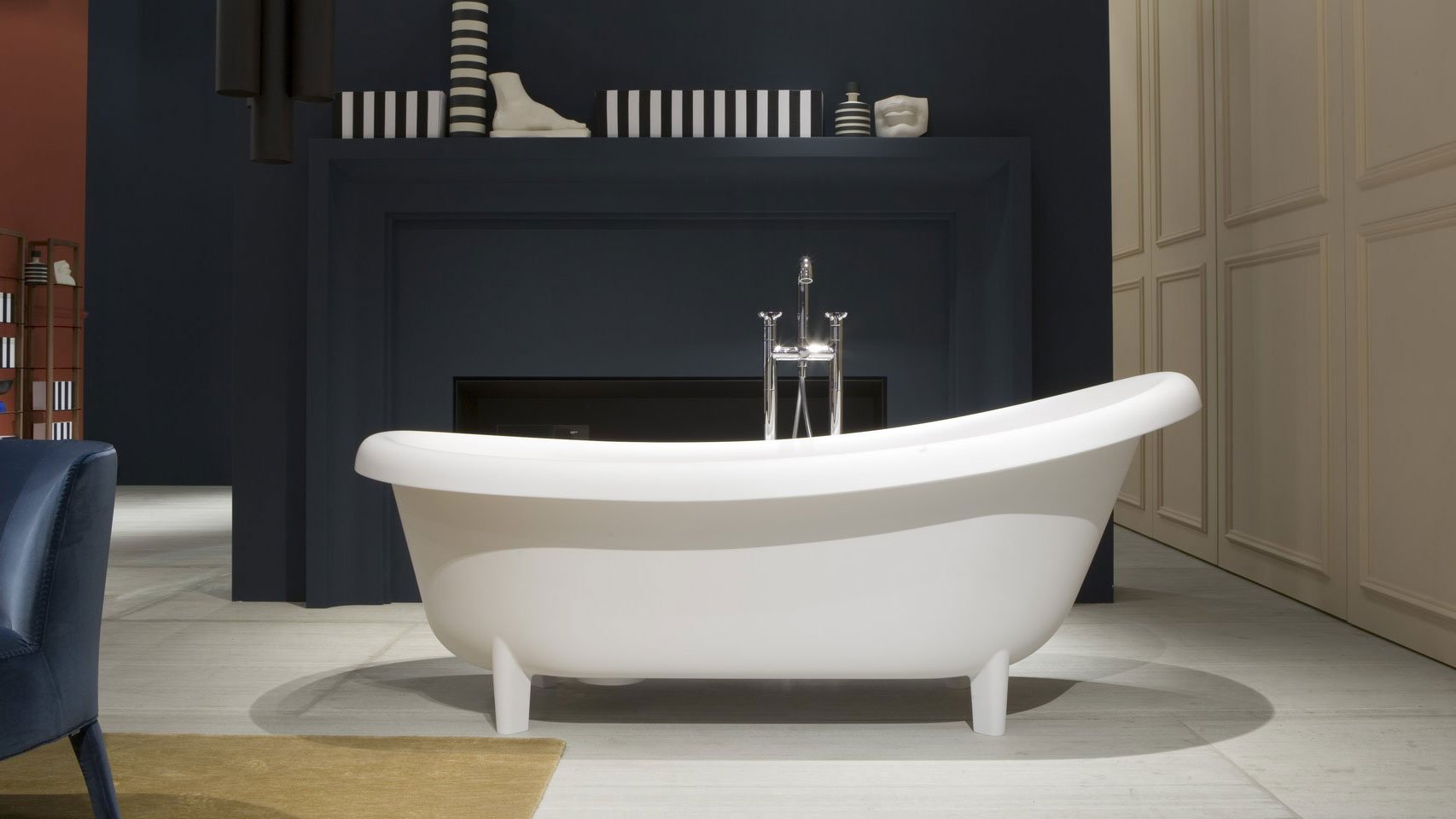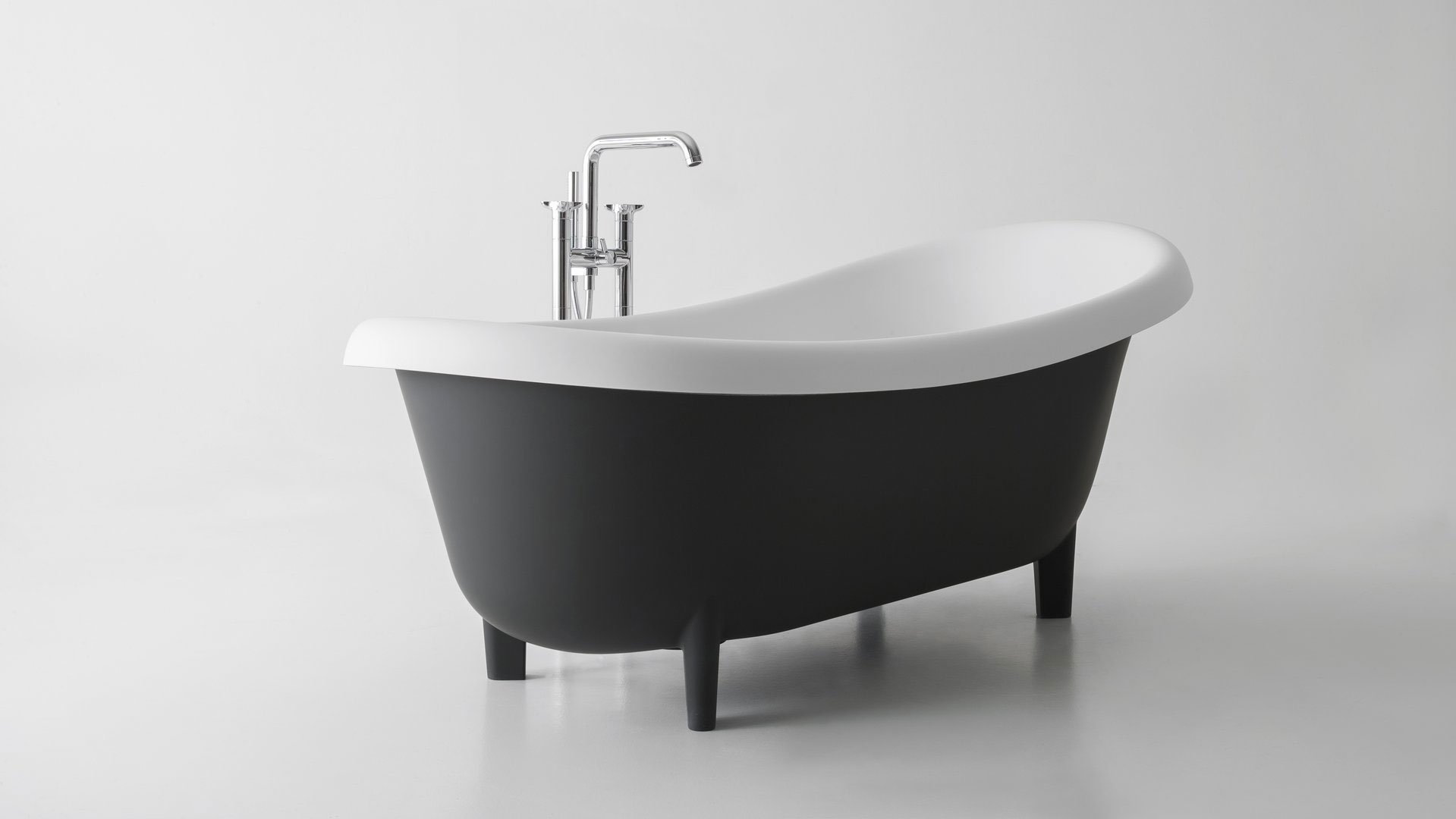 Oval biobased Cristalplant bathtub with feet, complete with drain and pressure plug, siphon and flexible hose, that can be lacquered externally.