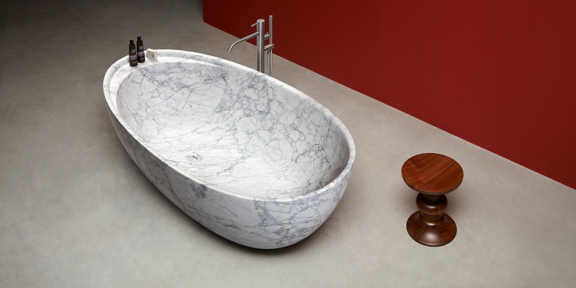 Oval bathtub in Carrara Marble complete with drain pipe fitting and pressure plug, siphon and flexible hose