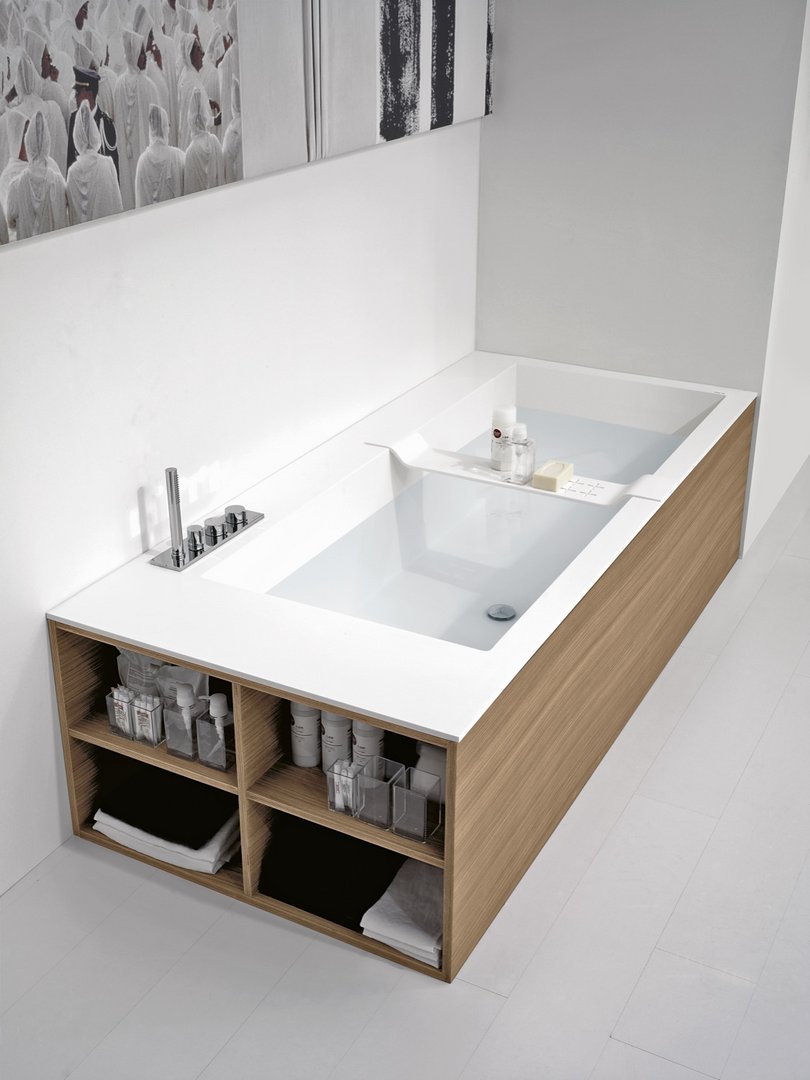 BIBLIO15 :Rectangular Corian bathtub, covered on 4 sides with plywood panels veneered with wood essence complete with regulating feet and drain with pressure plug.Dimensions cm 180 x 80 x 53,5
