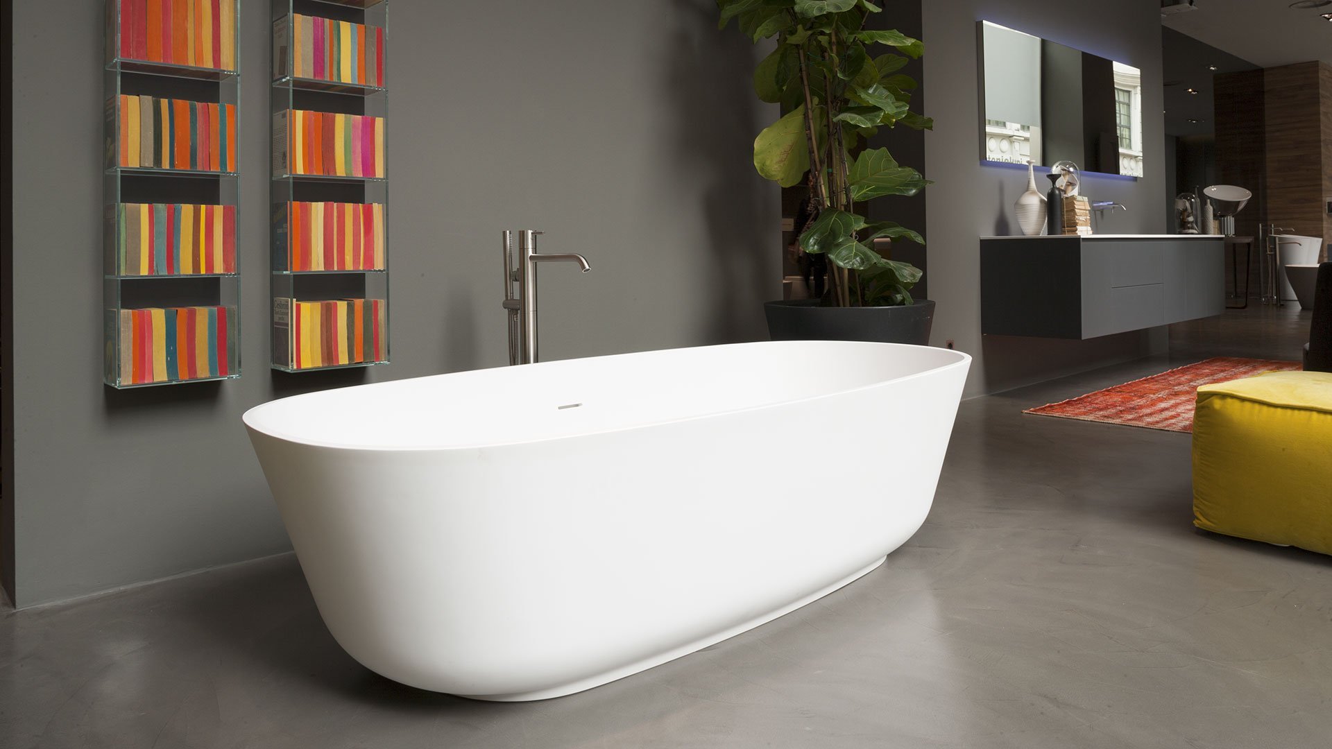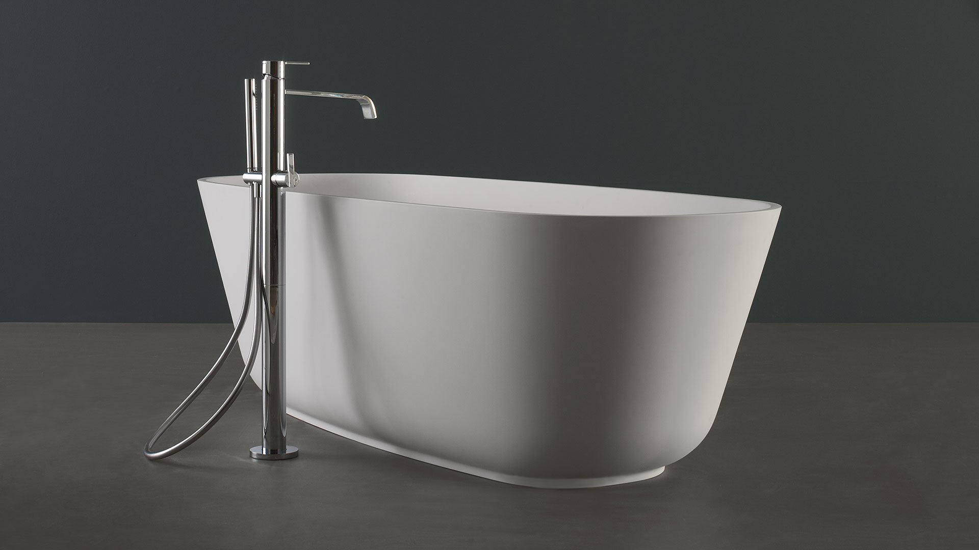 Oval Cristalplant bathtub complete with drain pipe fitting and pressure plug, siphon and flexible hose, that can be lacquered externally.