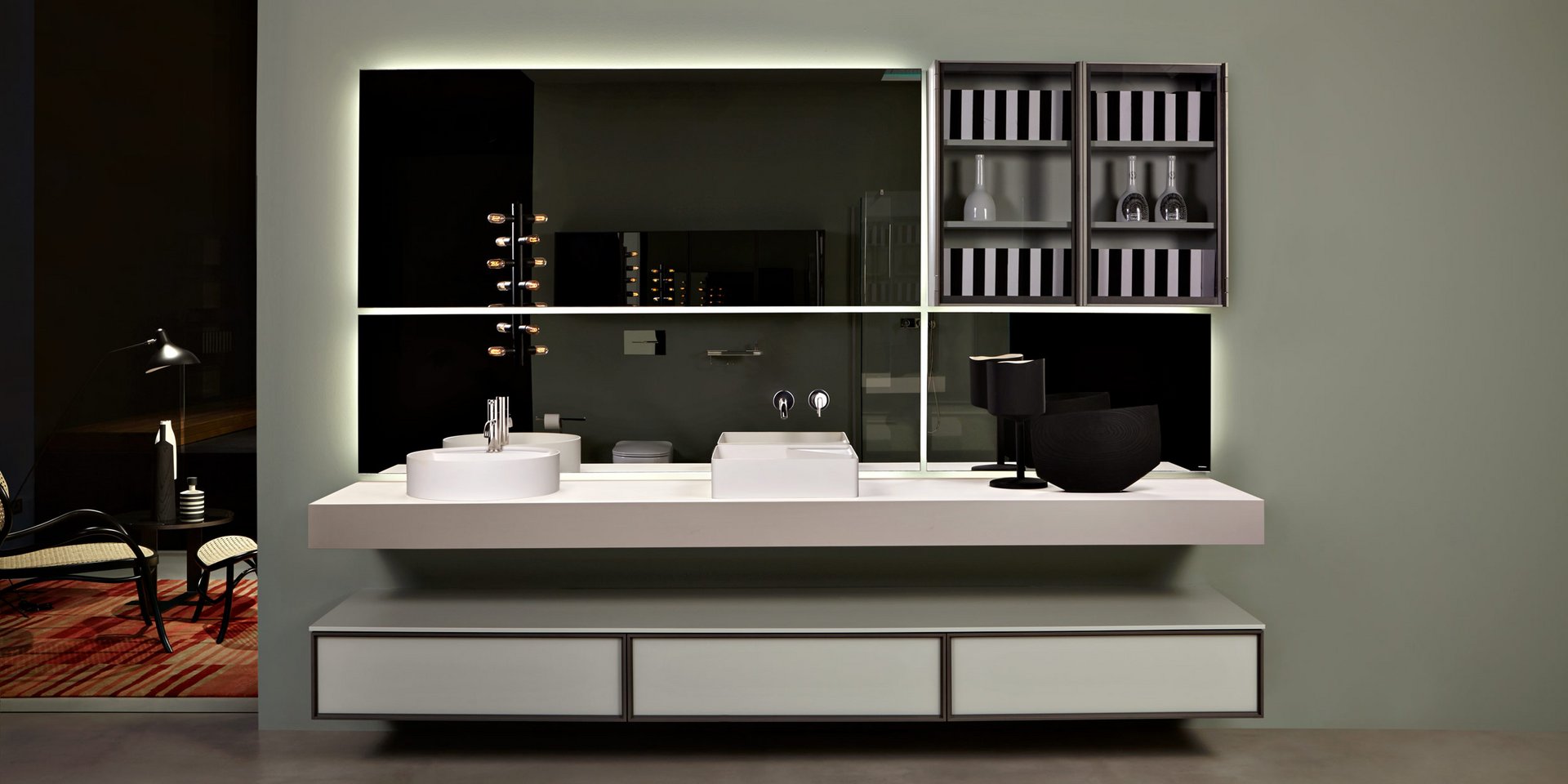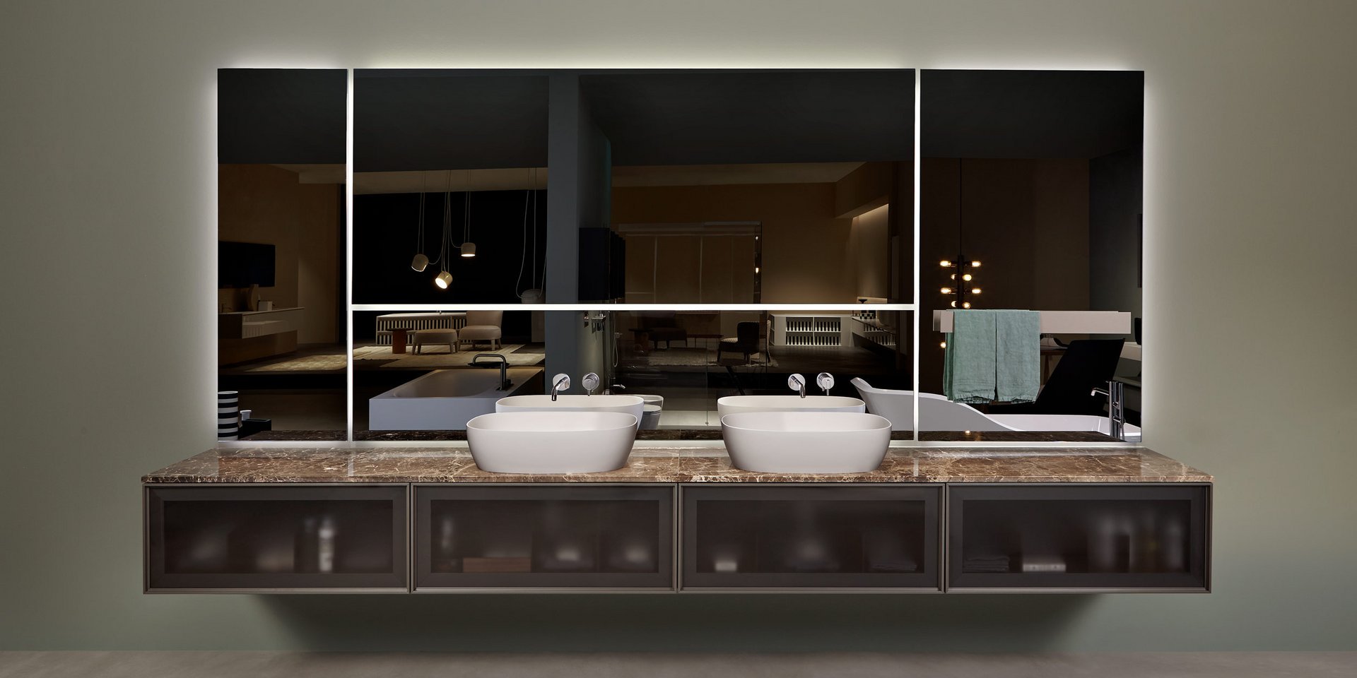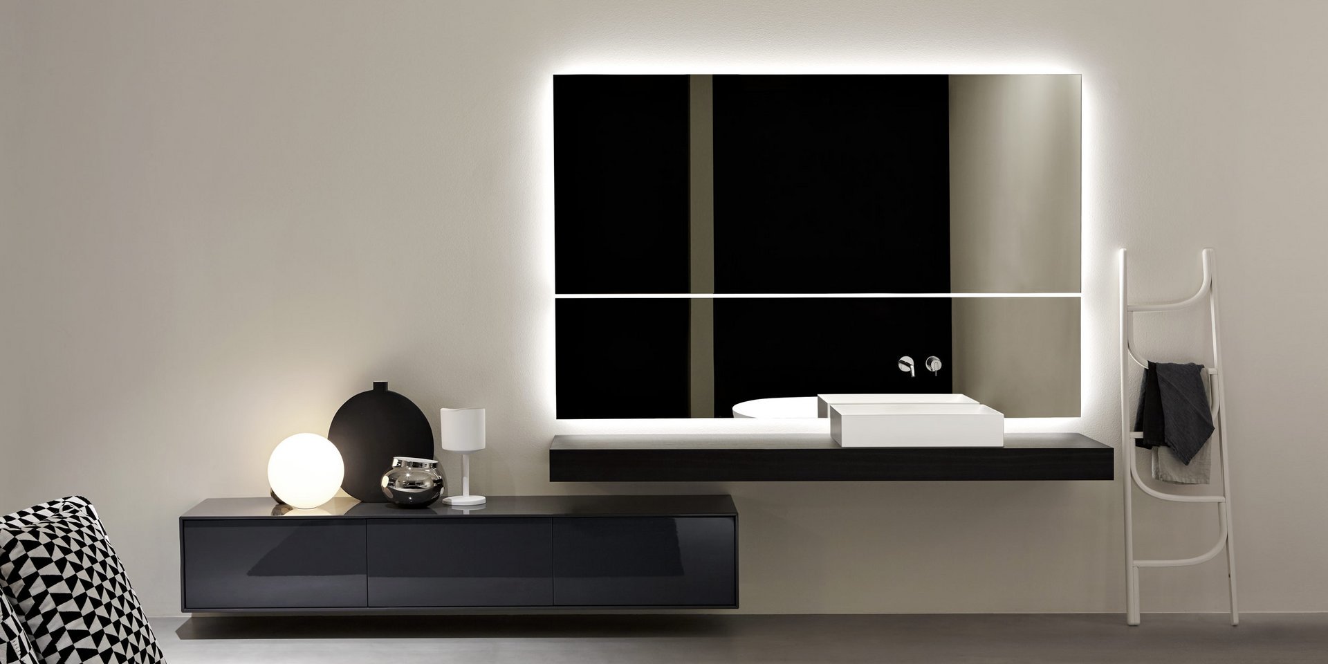 Polished edge mirror mounted horizontally or vertically complete with frame and white led lighting prepared for concealed valves Art. SP201INSA, Art. SP201INLU and/or towel rail Art. RETTA