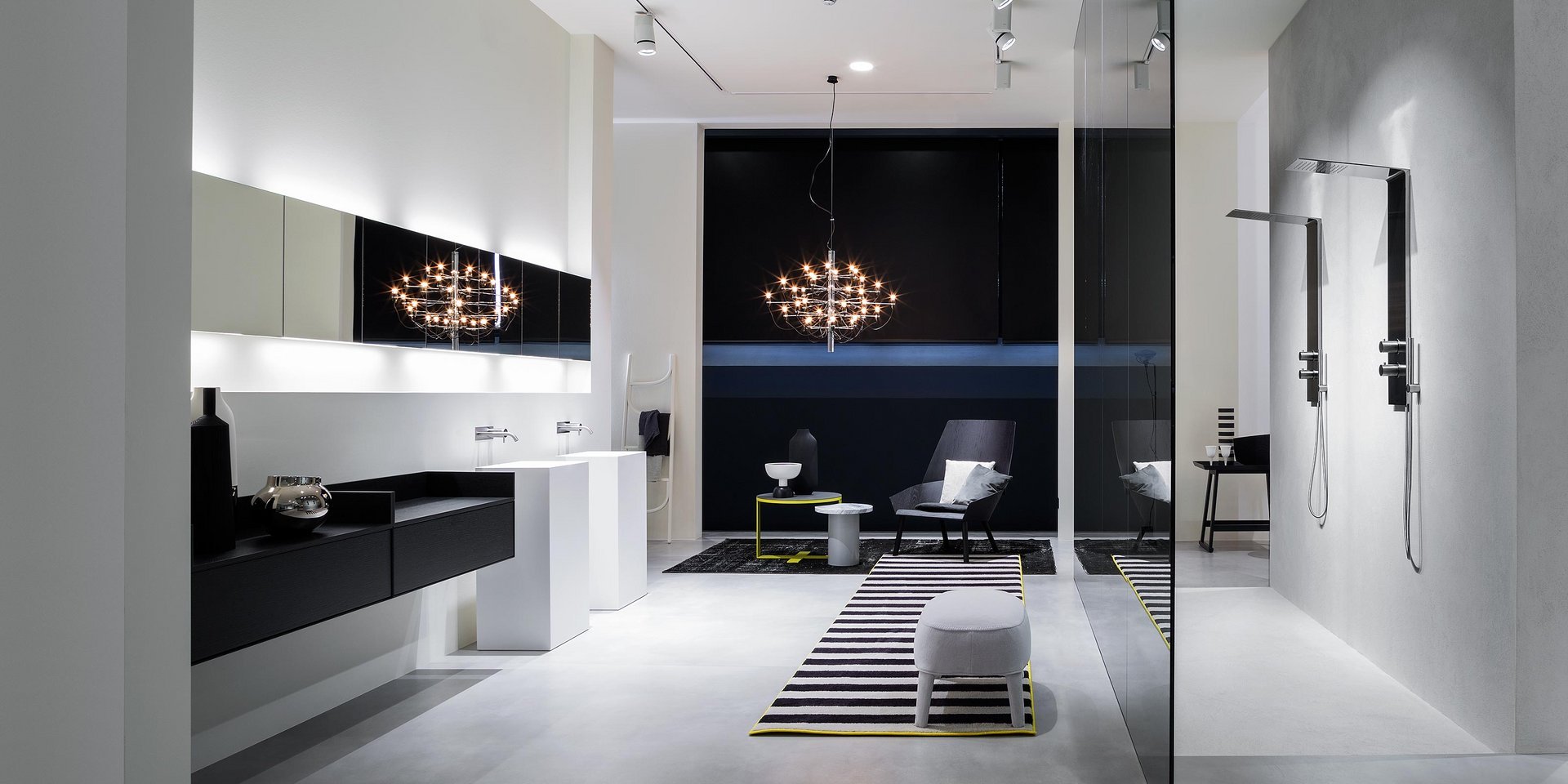 Right or left wall cabinet with 1 double face mirrored door and 1 internal shelf for H 50 cm or with 2 internal shelves for H 75 and H 90 cm.