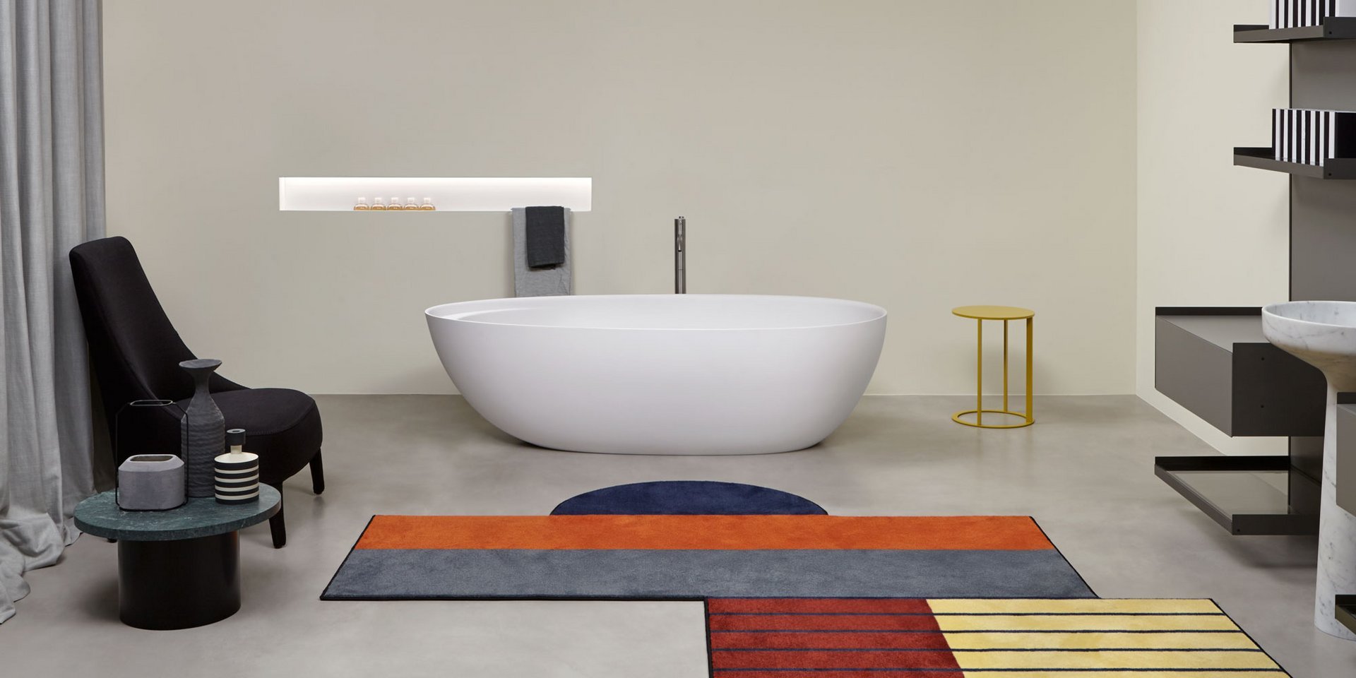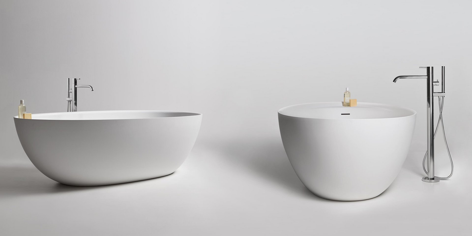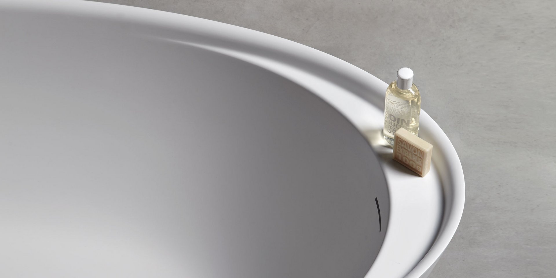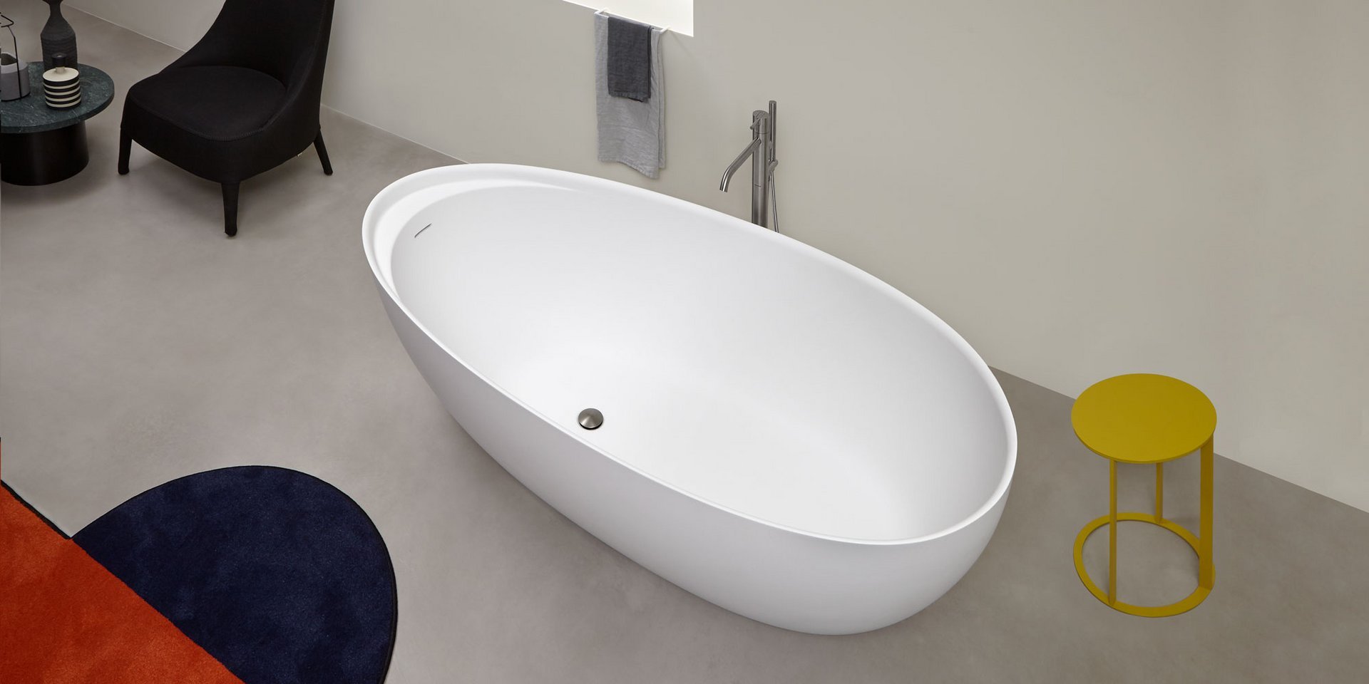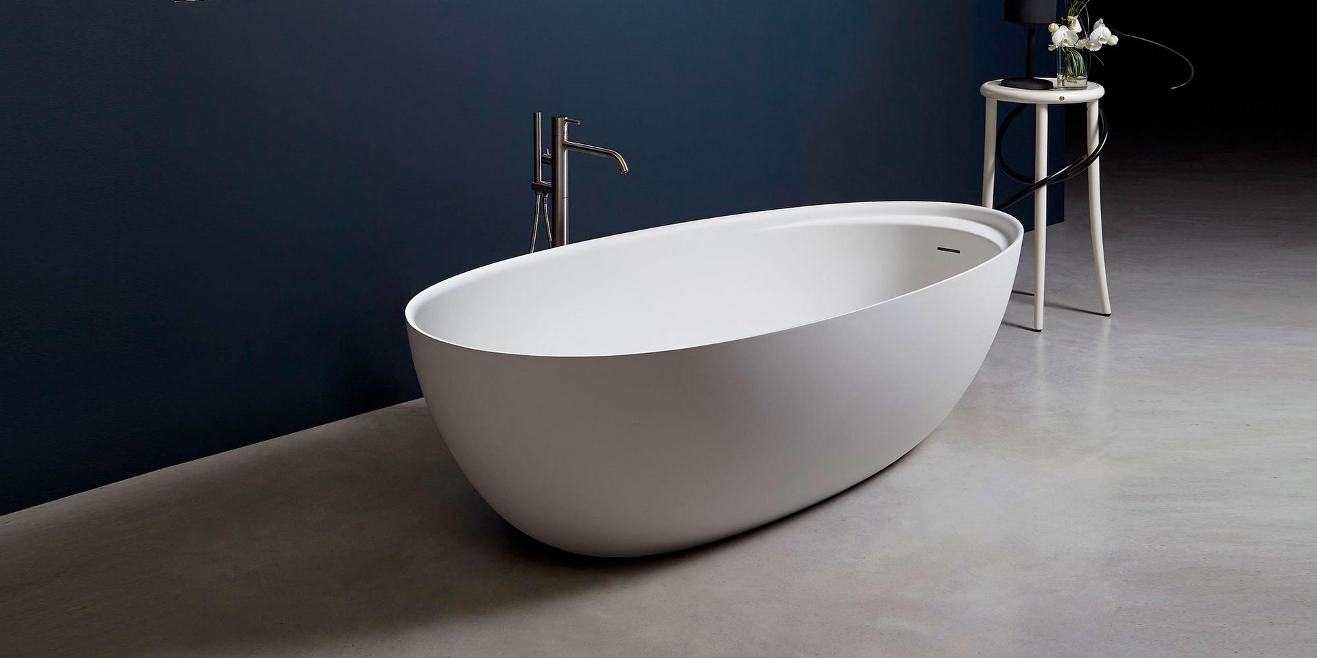 Oval Cristalplant bathtub complete with drain pipe fitting and pressure plug, siphon and flexible hose, can be externally lacquered.