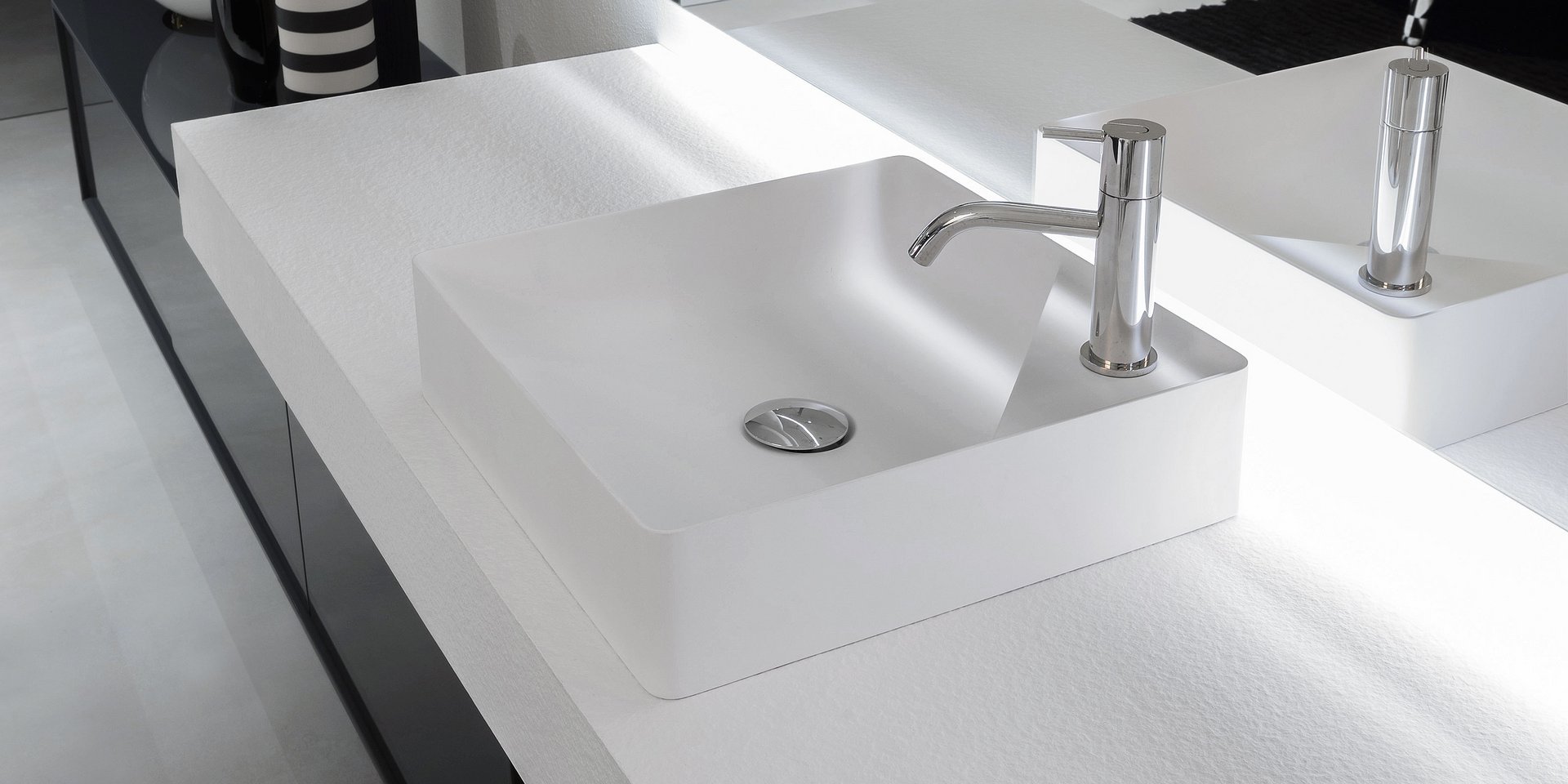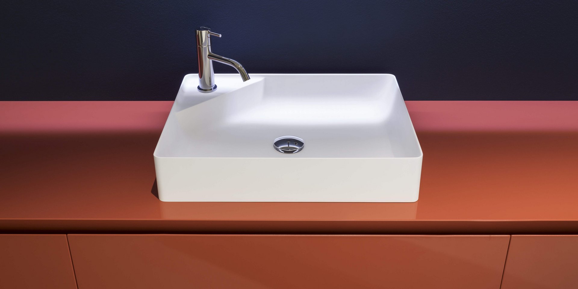 Rectangular top mount Flumood? sink complete with drain pipe fitting and opening plug. Can be lacquered externally.
