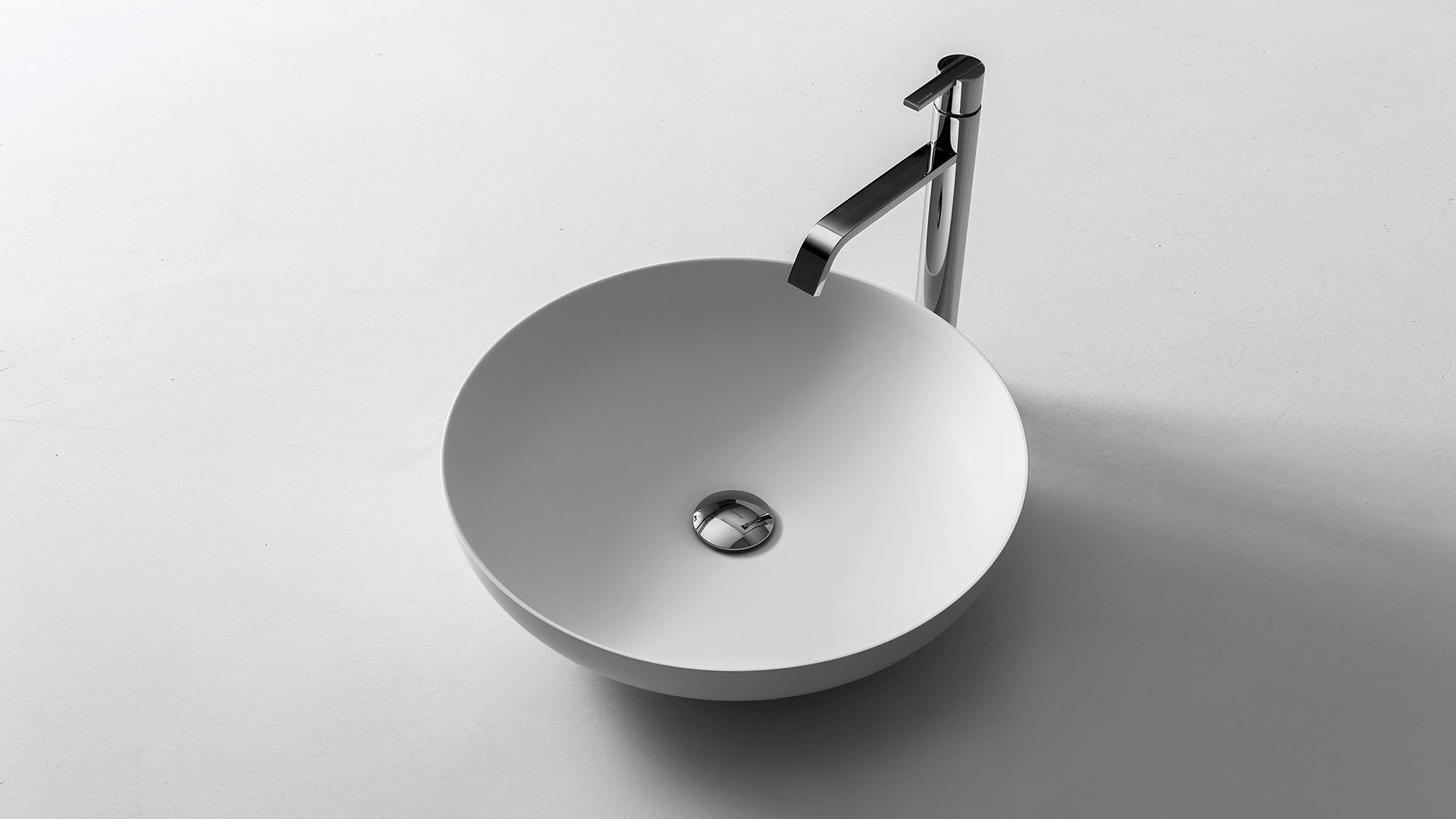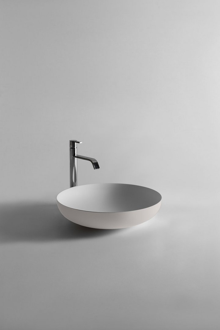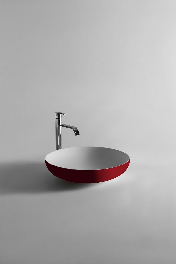 Round top mount Flumood? sink, complete with drain pipe fitting and open plug, that can be lacquered externally.