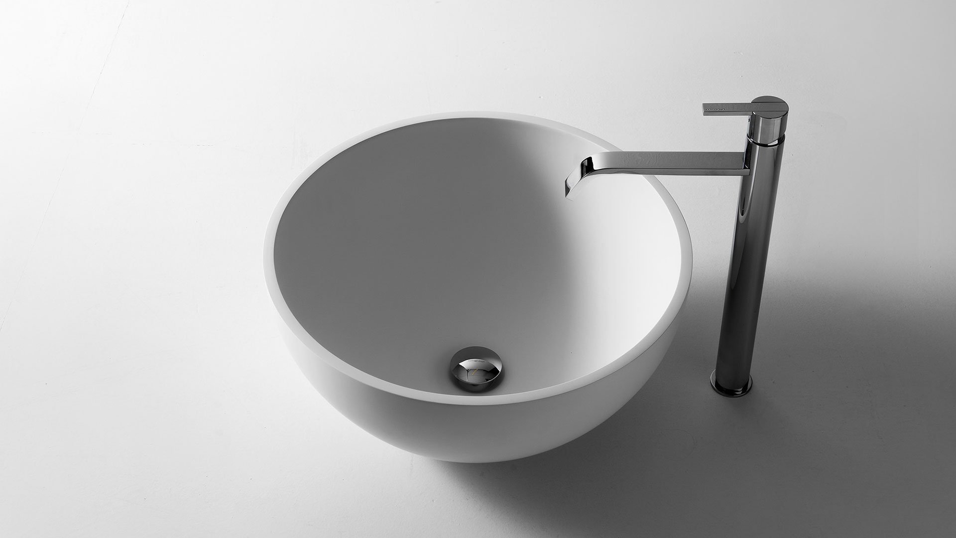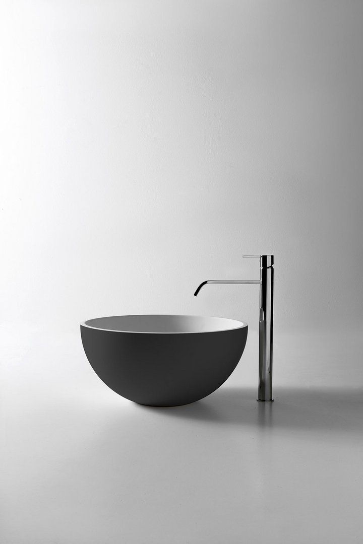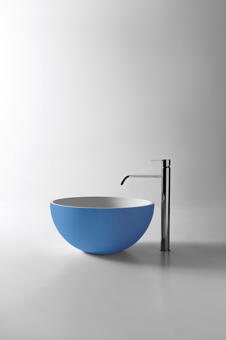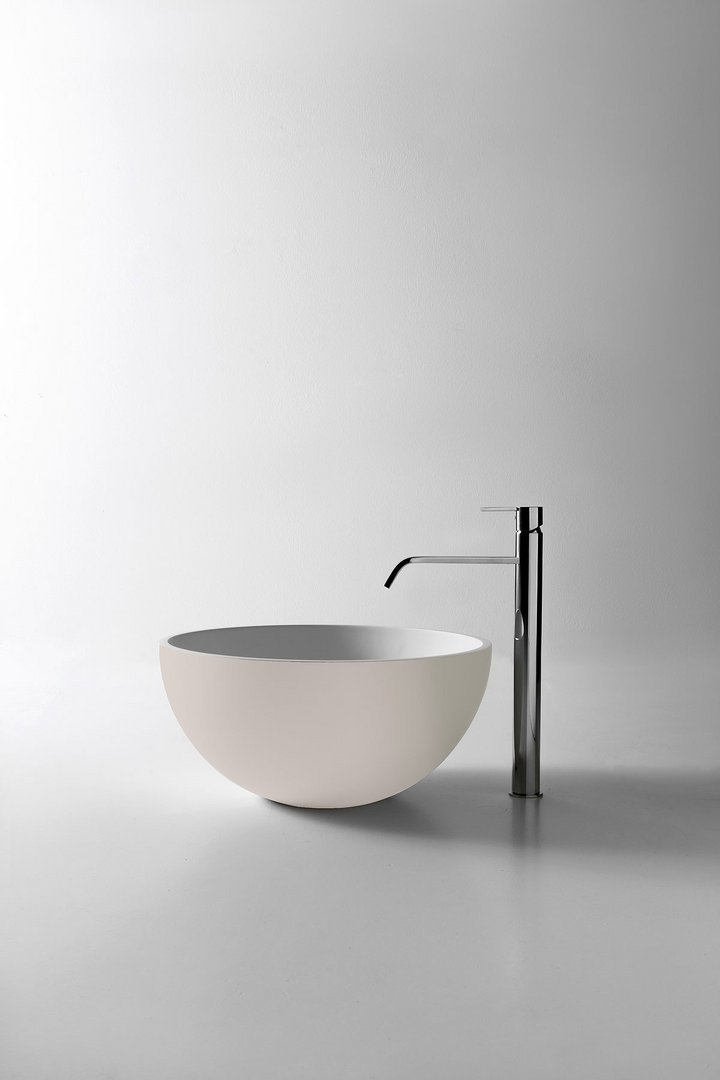 Round top mount Flumood? sink complete with drain pipe fitting and open plug, that can be lacquered externally.
