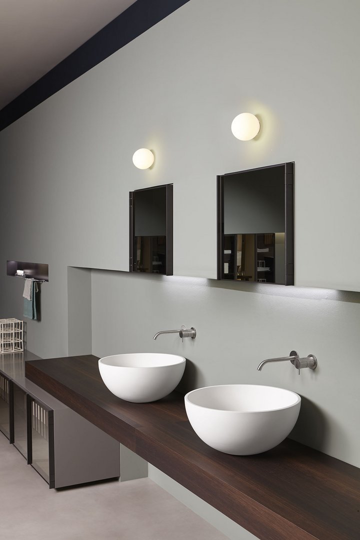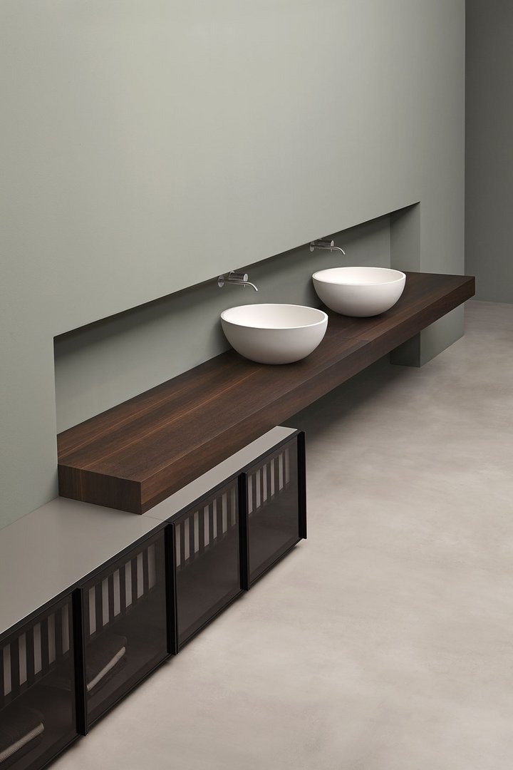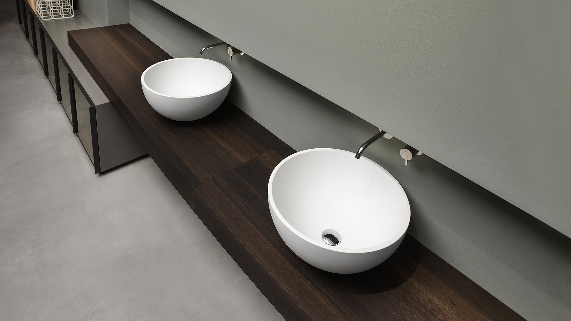 Round top mount Flumood? sink complete with drain pipe fitting and open plug, that can be lacquered externally.