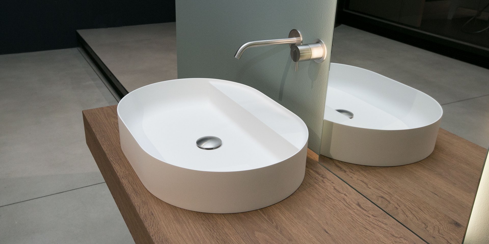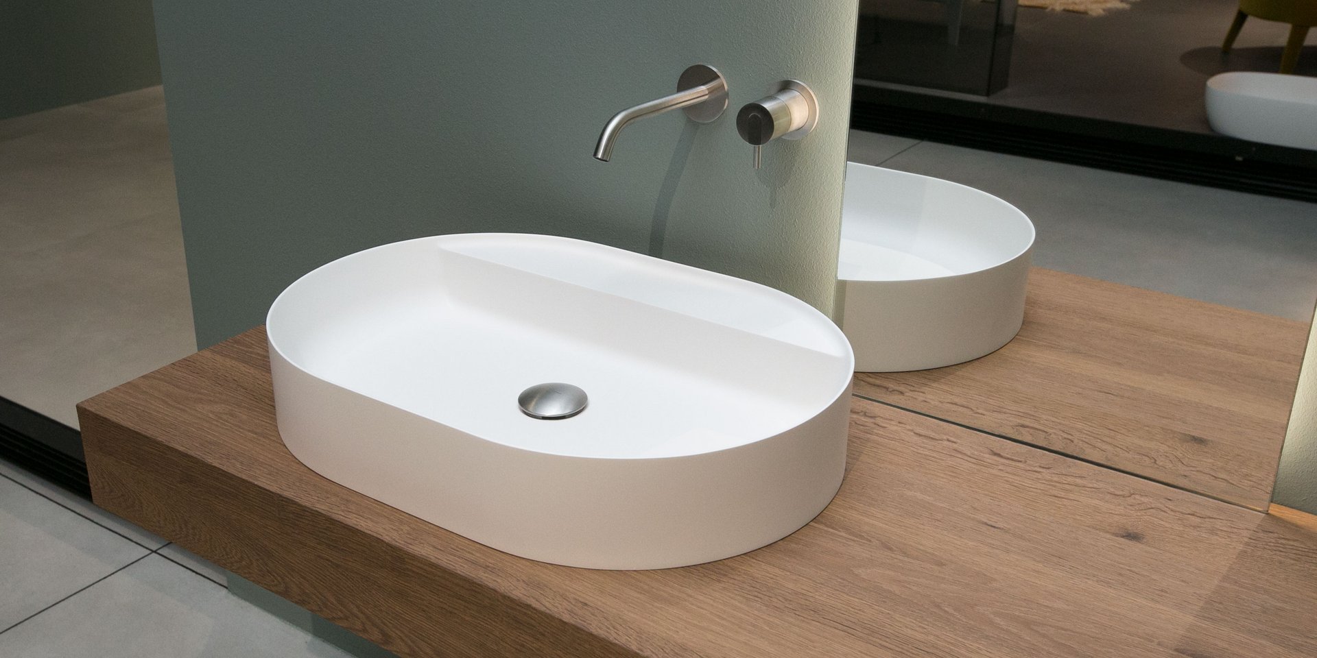 Oval top mount Flumood? sink, complete with drain pipe fitting and open plug. Can be lacquered externally.