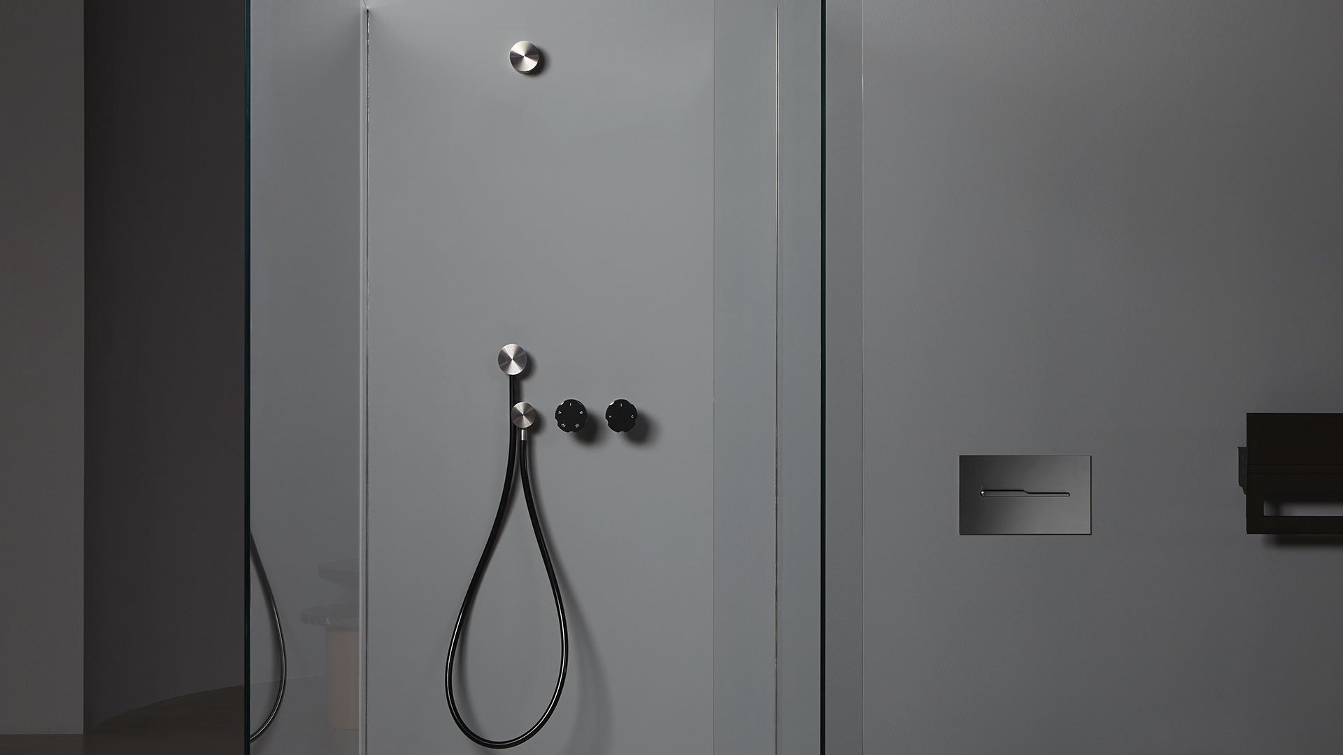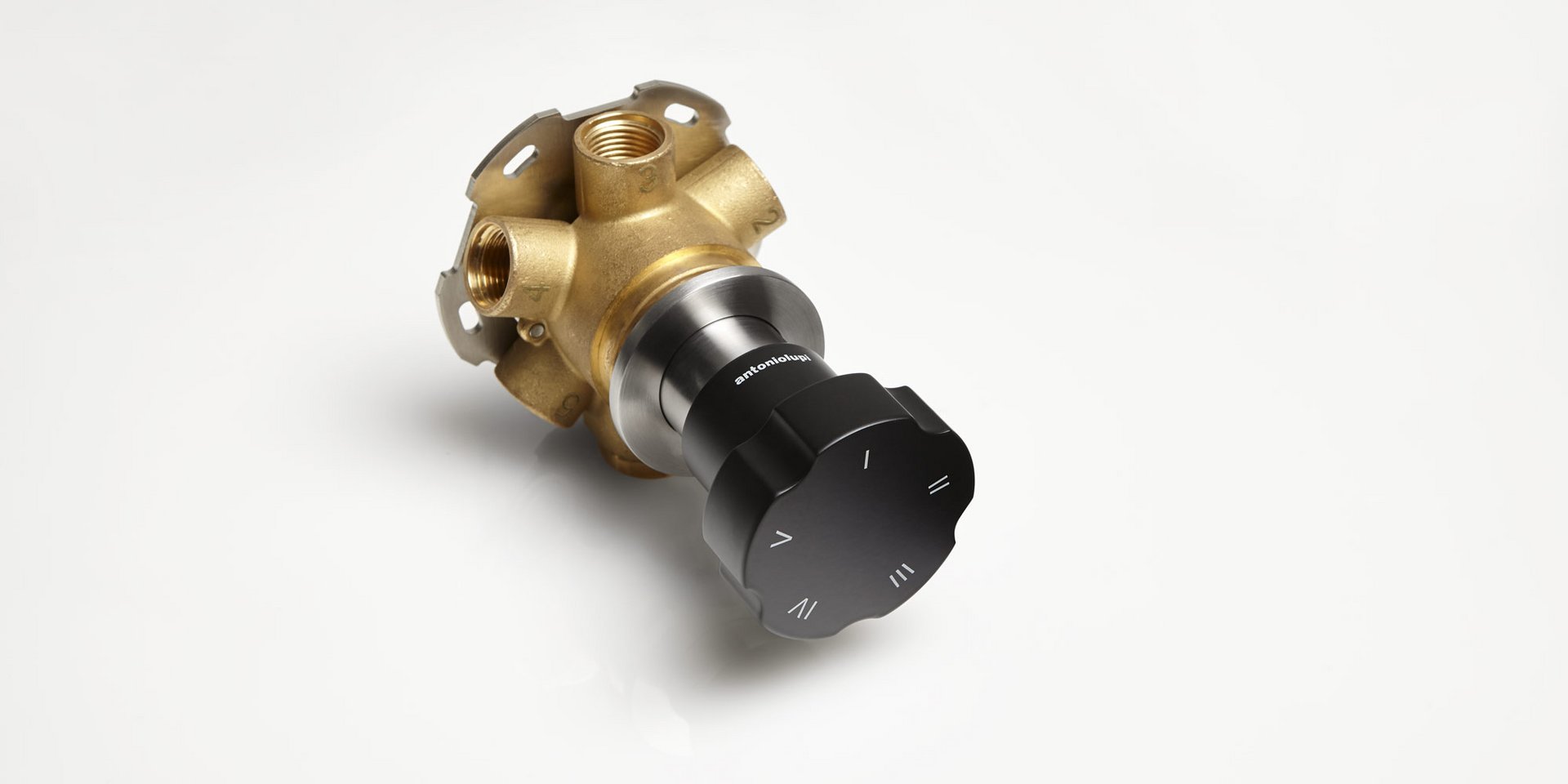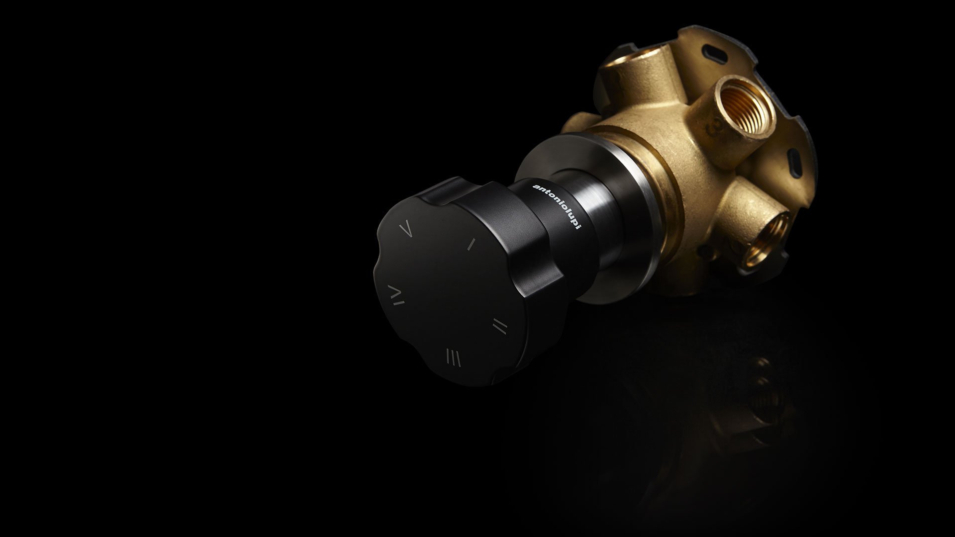 Encased 2, 3, 4 or 5 way diverter, with a brass lacquered handle in matt black complete with concealed valve