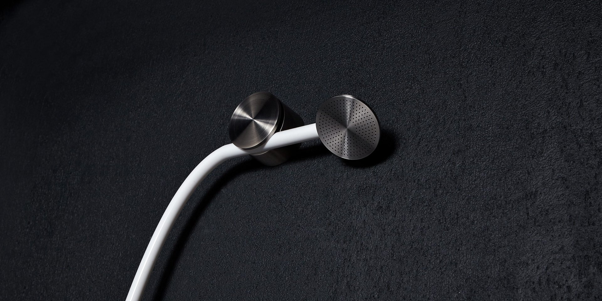 Hand shower in satin or polished stainless steel or graphite finish complete with wall support and water outlet, flexible hose 150 cm in silicone colored white, black or grey.