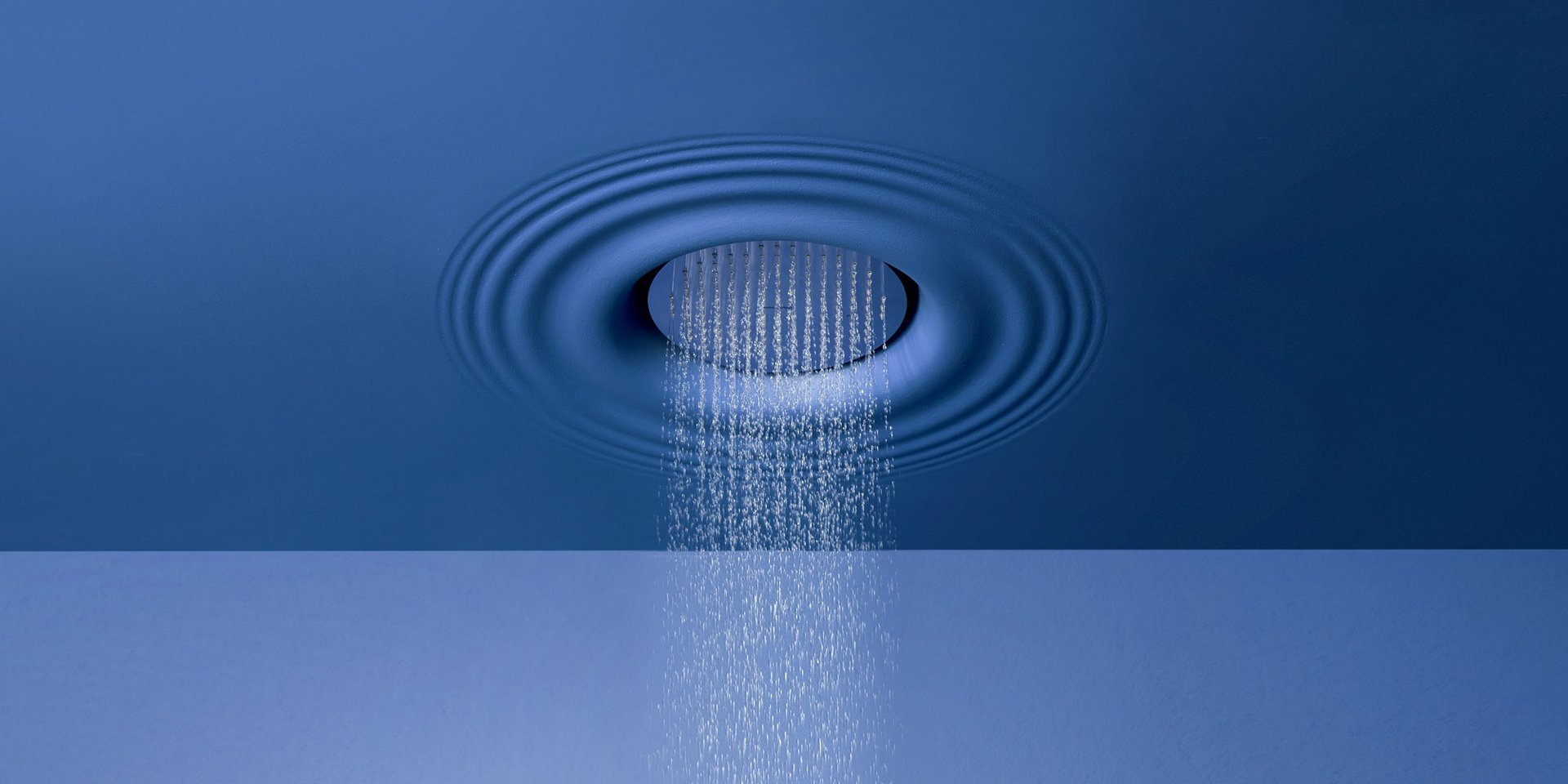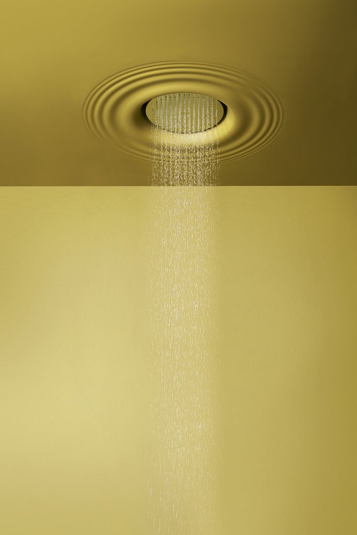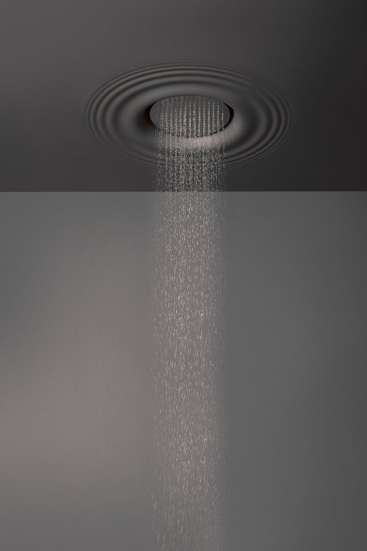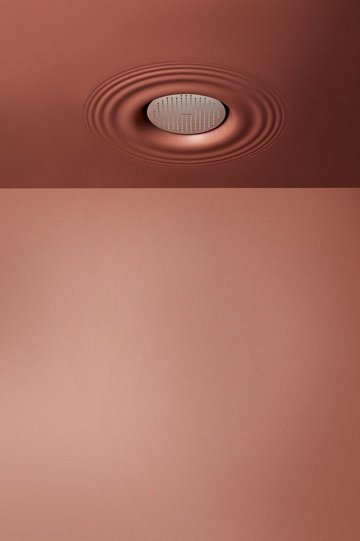 Ceiling encased Flumood frame with satin stainless steel AISI 304 showerhead.