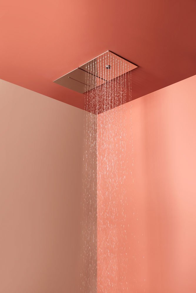 Encased modular showerhead with waterfall in polished stainless steel AISI 304.