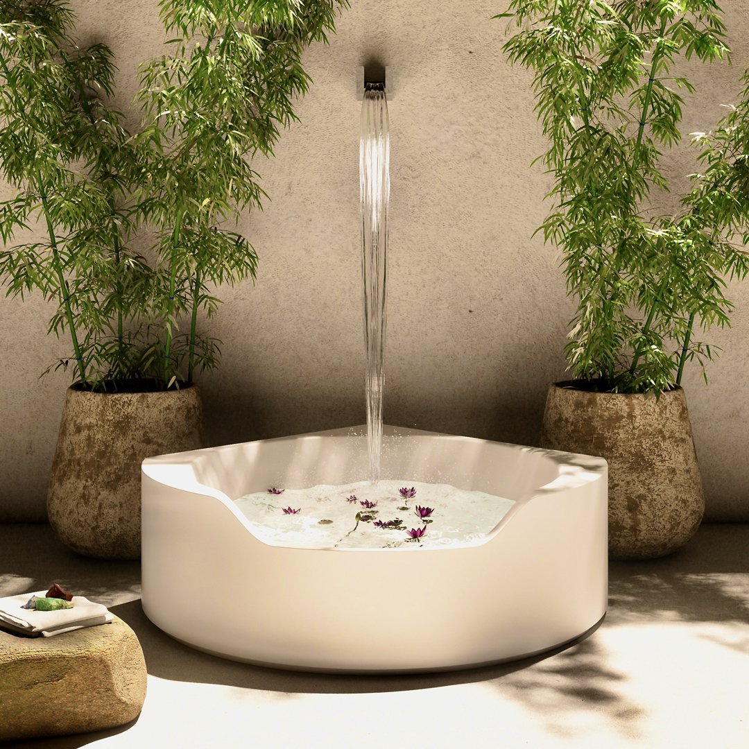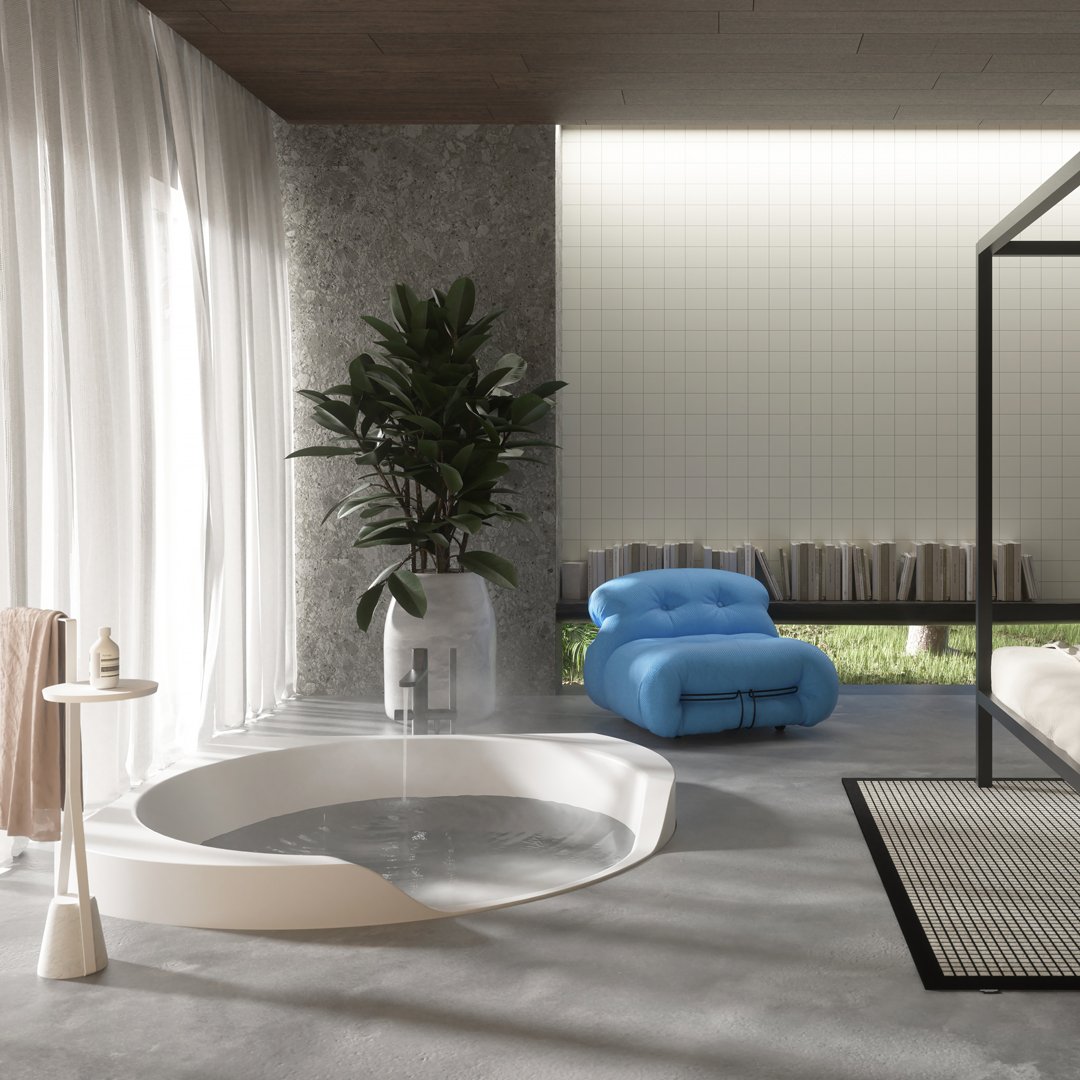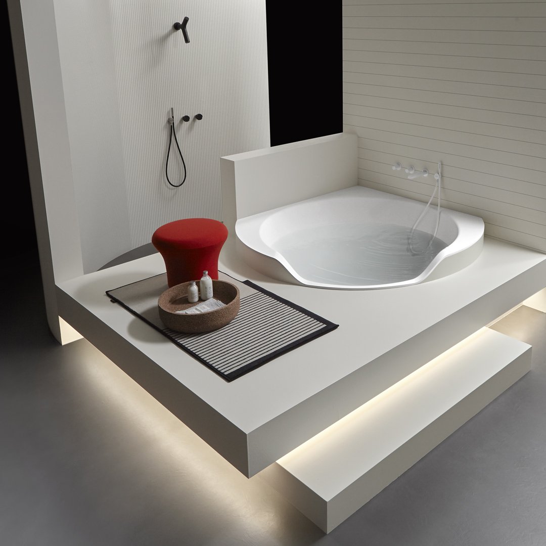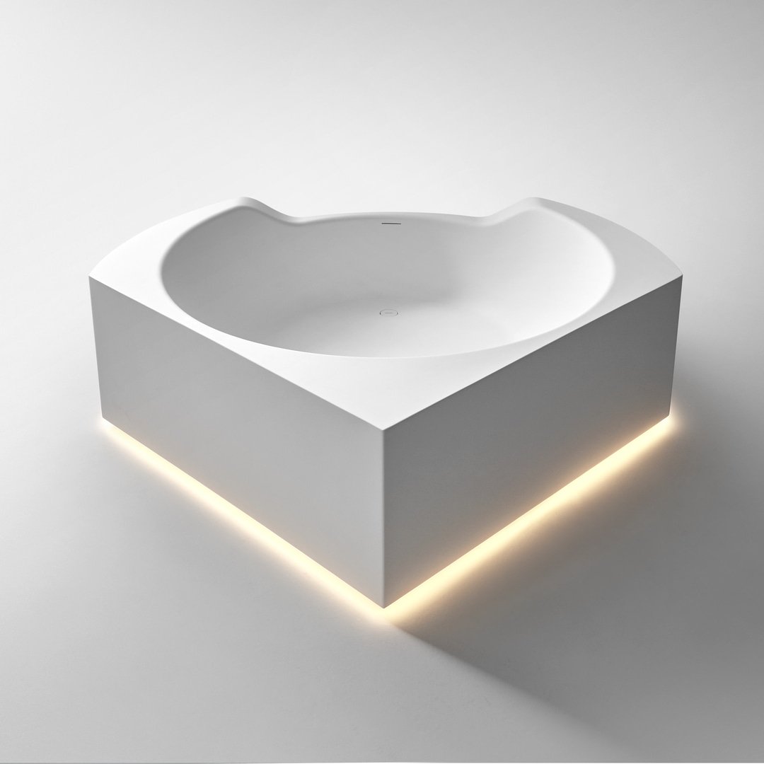 Ofuro 是一款嵌入式或獨立式浴缸,源自對 1970 年代項目的現代改造。一個塑料模型、一個大型雕塑、一個浴缸,它們似乎是由一塊塊制成的,經過加工、手工切割或被水的自然力侵蝕。直線和鋒利的邊緣與柔軟的形狀和曲面的共存使構圖變得有價值,也允許考慮它的角落位置。