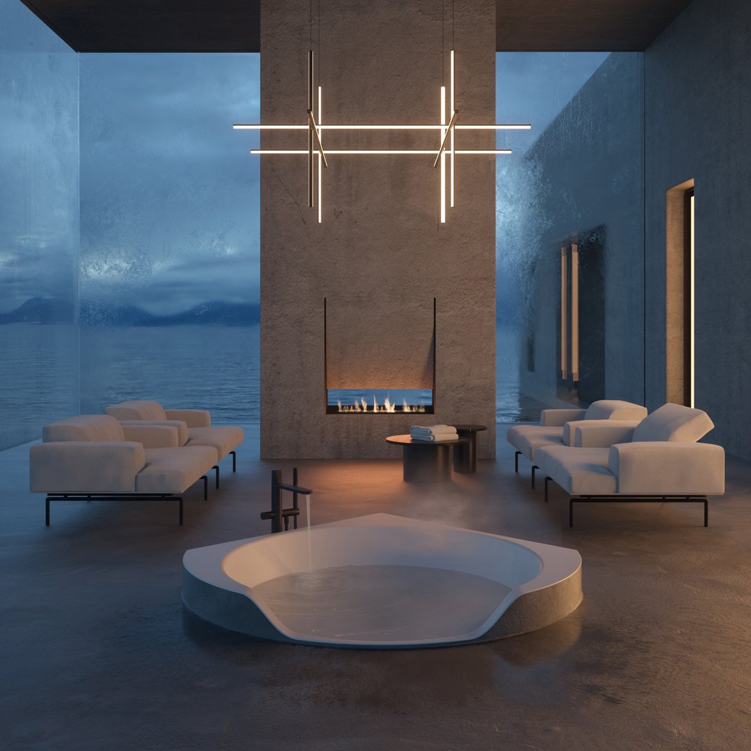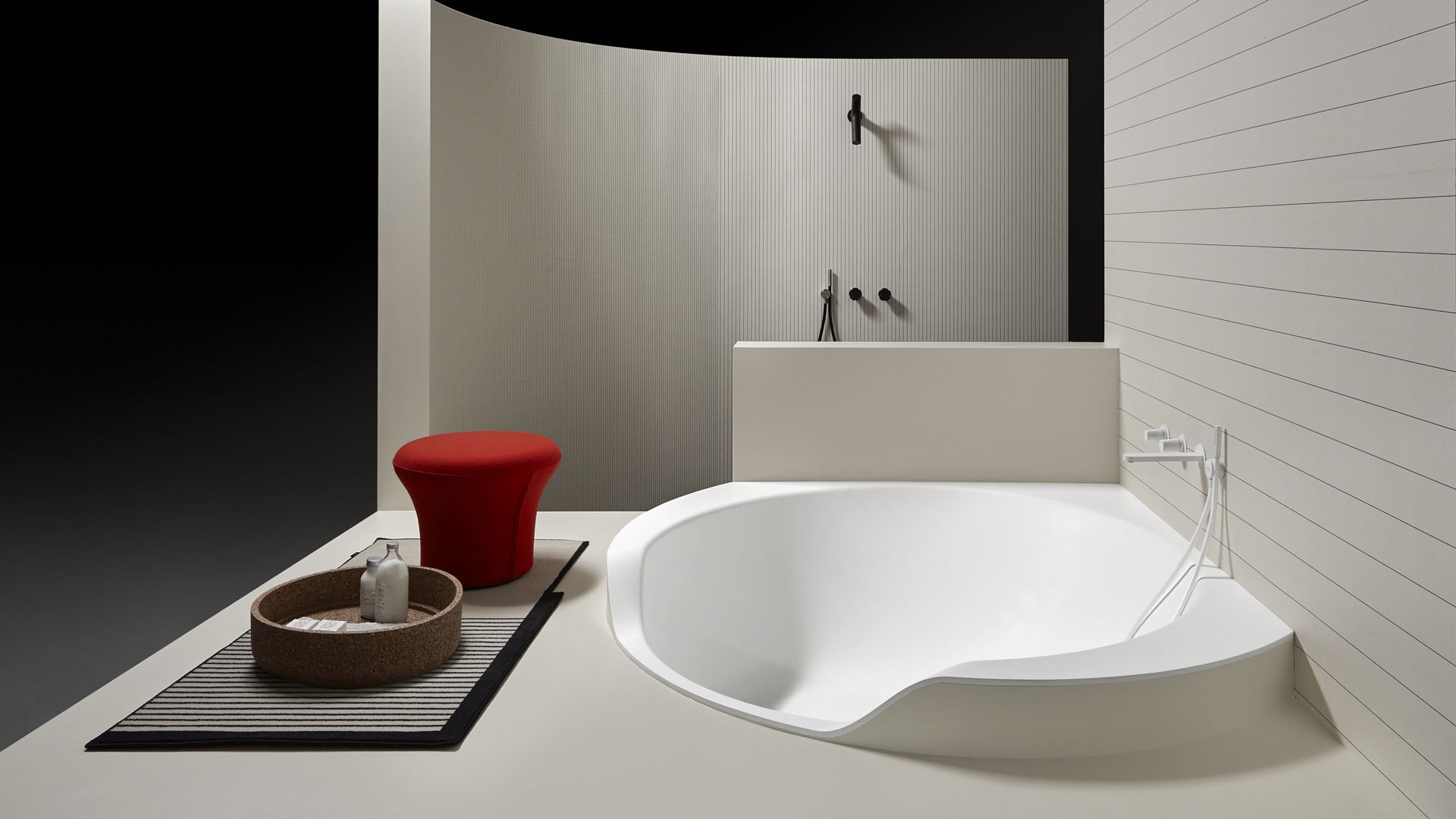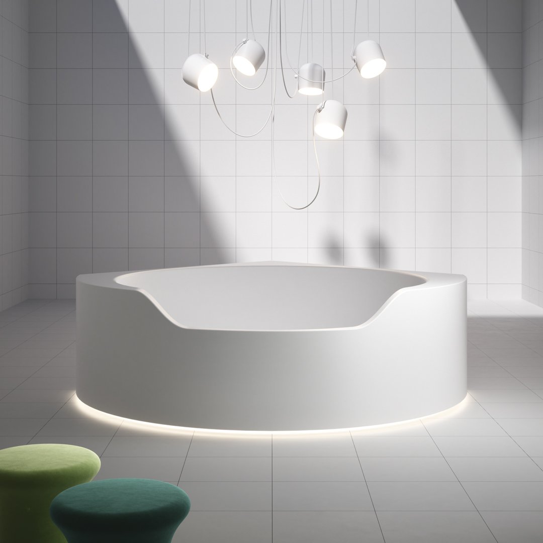 Ofuro 是一款嵌入式或獨立式浴缸,源自對 1970 年代項目的現代改造。一個塑料模型、一個大型雕塑、一個浴缸,它們似乎是由一塊塊制成的,經過加工、手工切割或被水的自然力侵蝕。直線和鋒利的邊緣與柔軟的形狀和曲面的共存使構圖變得有價值,也允許考慮它的角落位置。