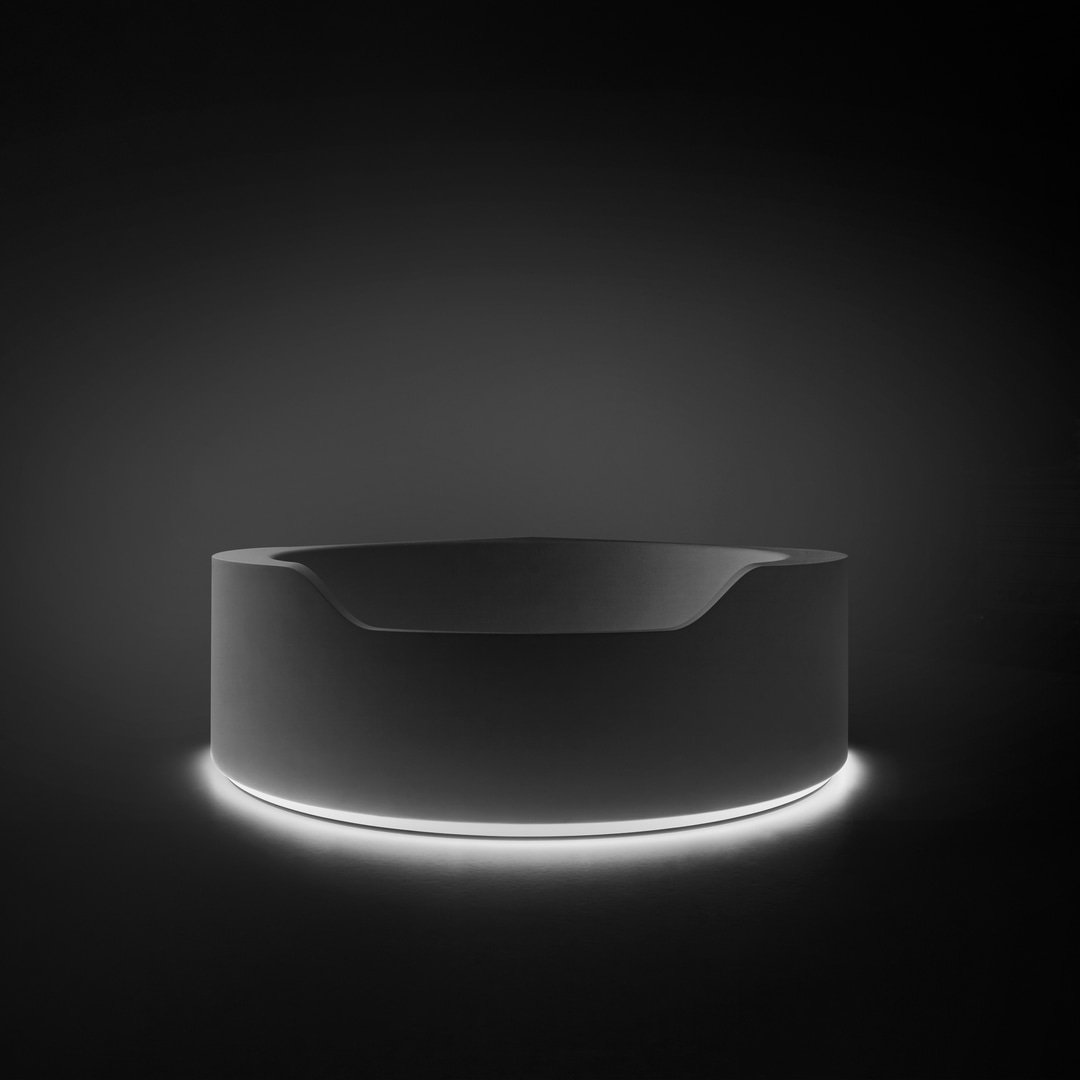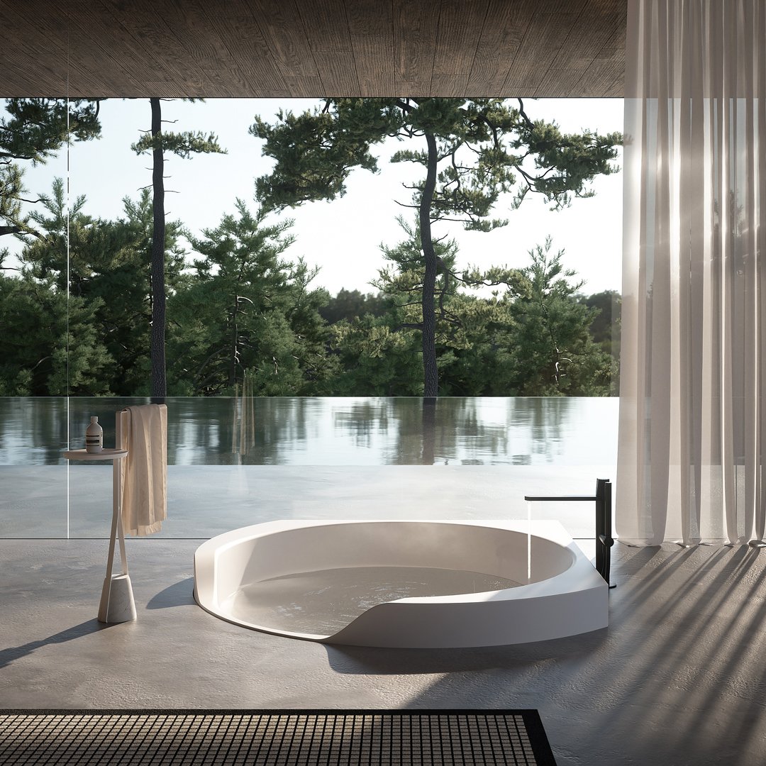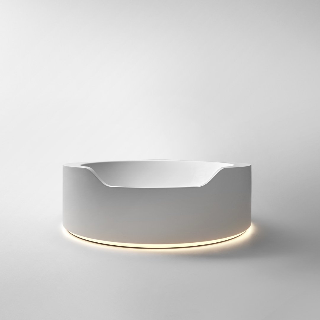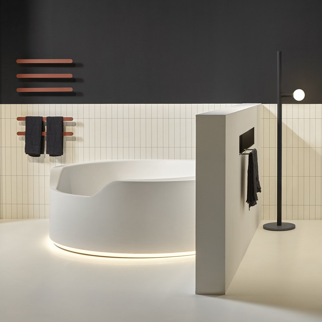 前面較低的邊緣邀請您進入,讓您完全沉浸在獨立式版本中,當它凹進地板并呈現一桶天然水的形象時。Ofuro 由 Flumood 制成,邊緣厚度可變,某些部分較寬,因此可以支撐物體和身體護理產品,其他部分較薄以減輕氣勢磅礴的體積。浴缸可以配備集成在底座上的 LED 燈,營造出優雅、輕盈和懸浮的感覺。