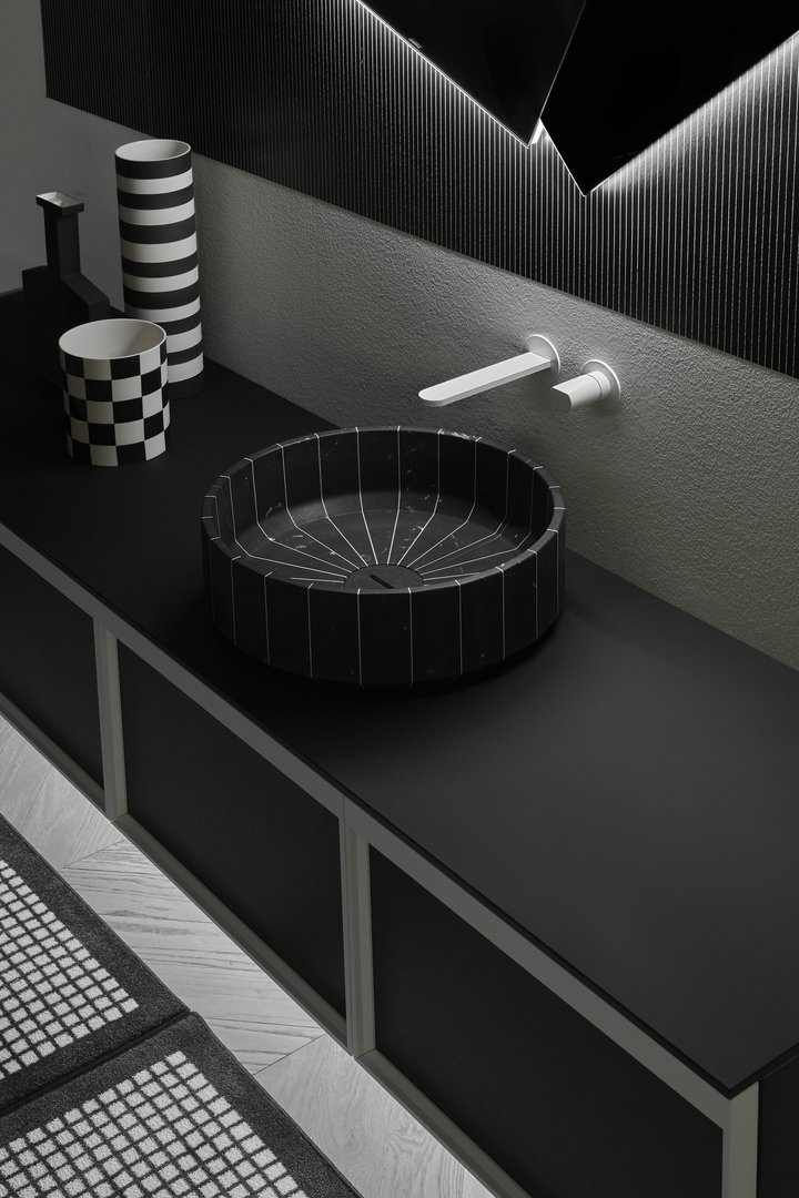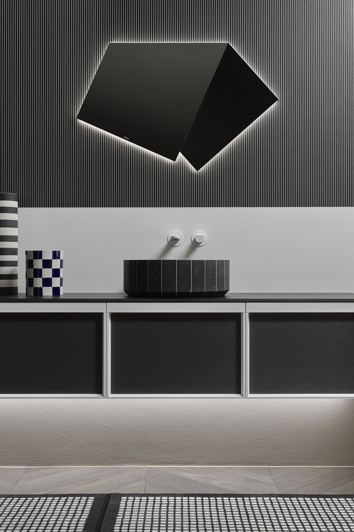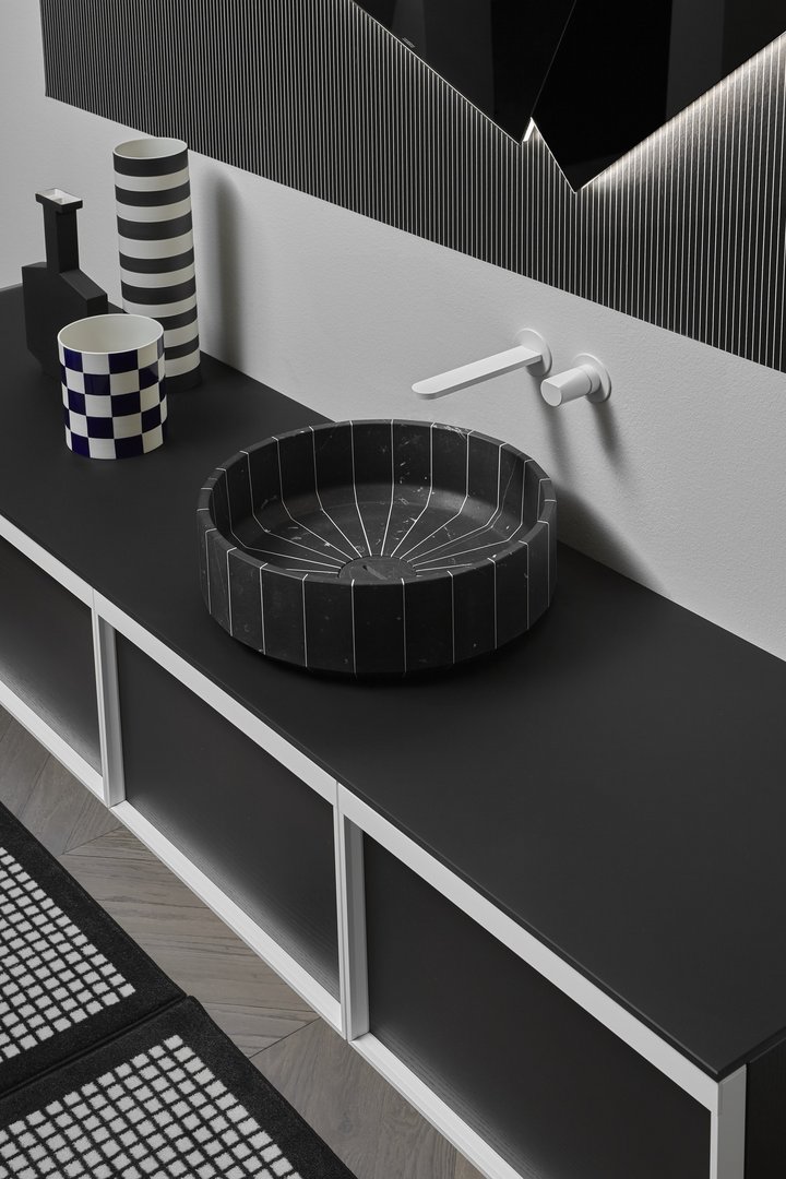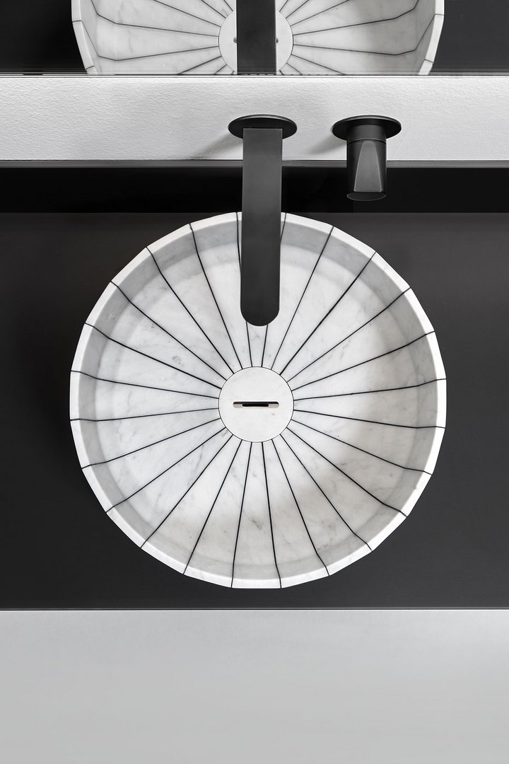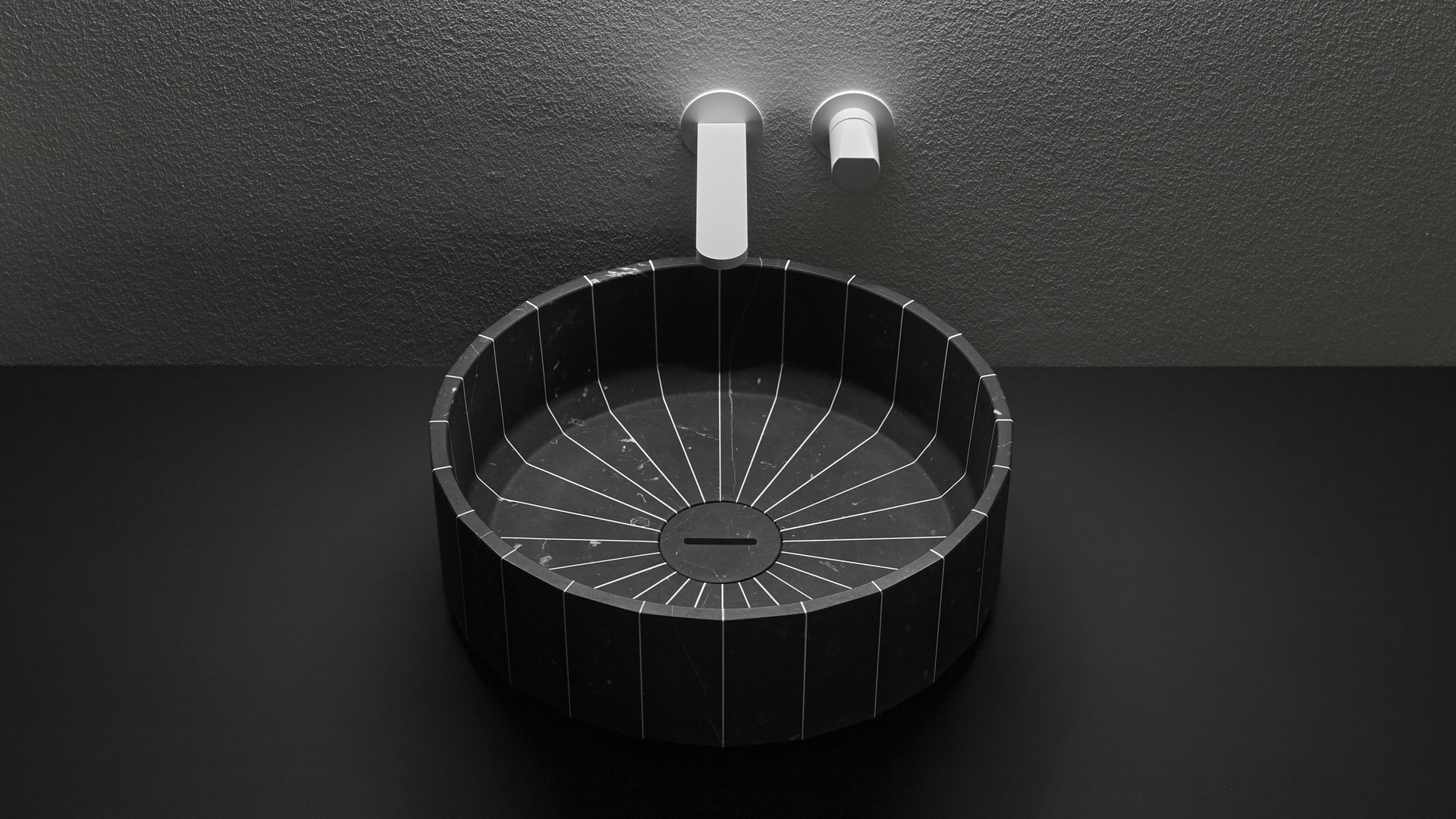它的形象堅固而雕像般,就像一塊刻在石頭上并用水打磨過的石塊。它的體積是由黑色或白色樹脂夾在中間的各個部分的組裝產生的。由直線段序列生成的圓形指的是過去的圖像,將我們帶回到原始的凈化儀式。工藝的完美使得通過最大限度地減少浪費來獲得形狀成為可能,從而創造出裝飾空間的元素,同時尊重環境及其非凡的財富。