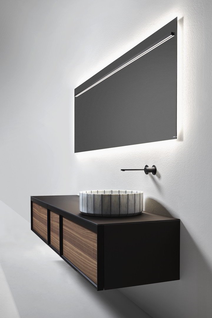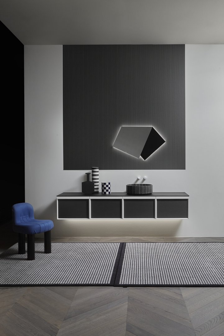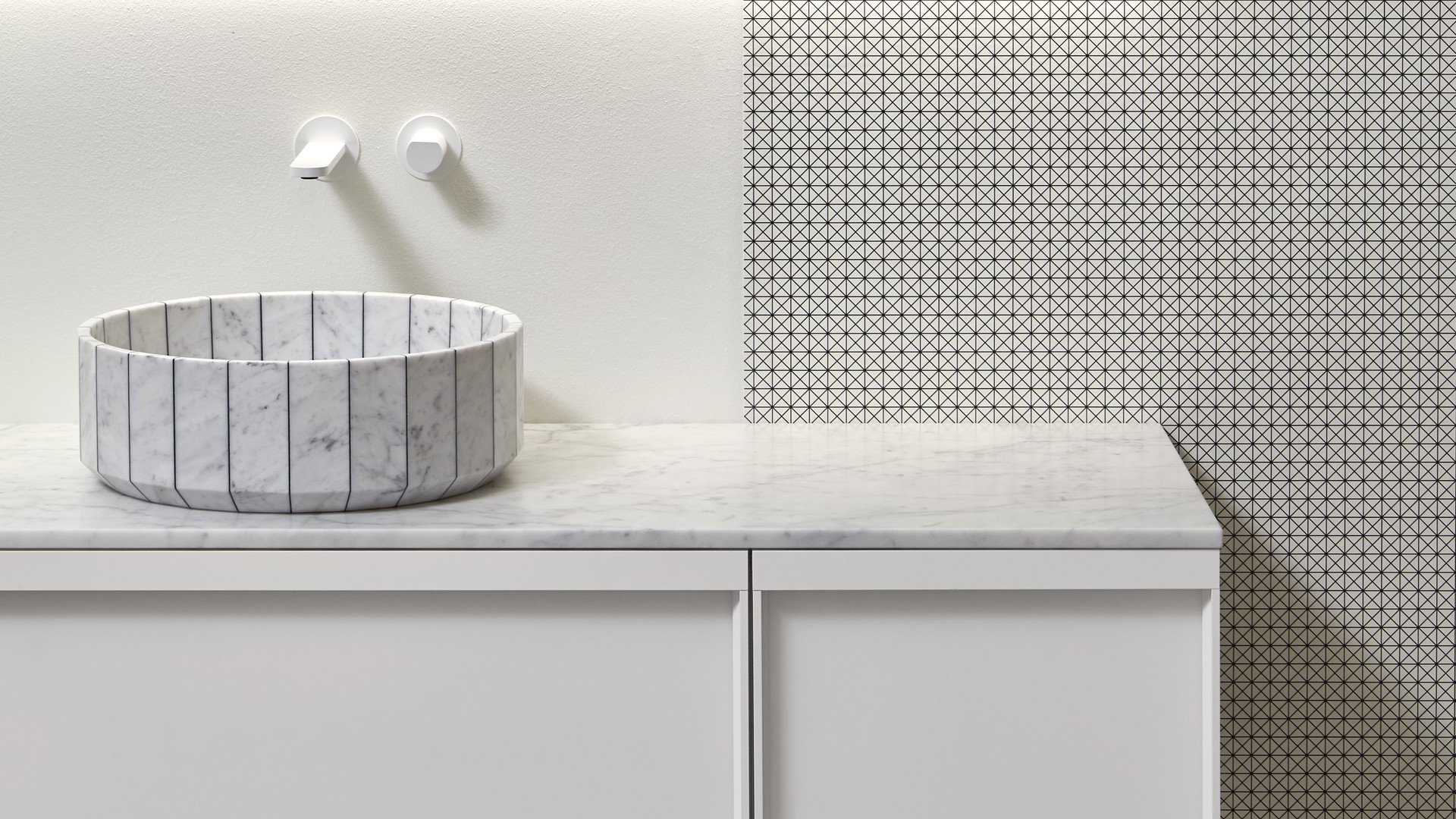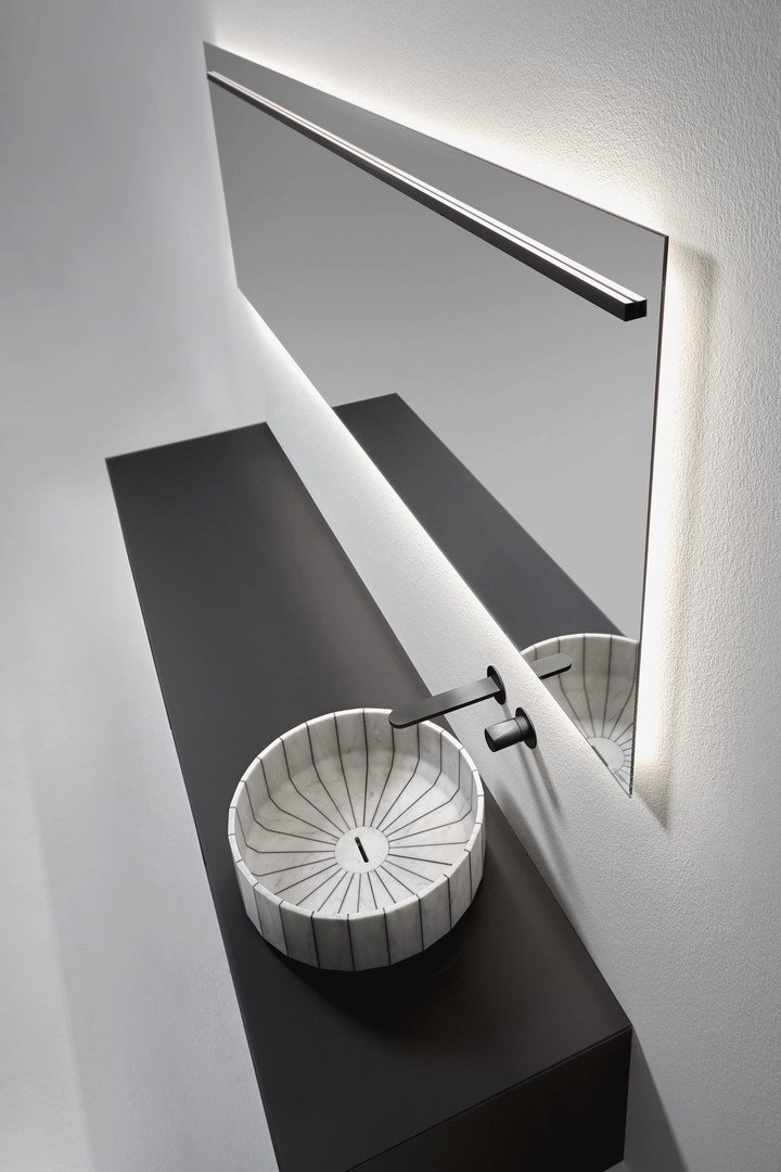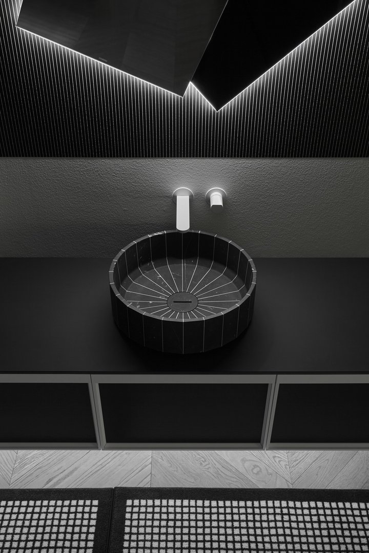 它的形象堅固而雕像般,就像一塊刻在石頭上并用水打磨過的石塊。它的體積是由黑色或白色樹脂夾在中間的各個部分的組裝產生的。由直線段序列生成的圓形指的是過去的圖像,將我們帶回到原始的凈化儀式。工藝的完美使得通過最大限度地減少浪費來獲得形狀成為可能,從而創造出裝飾空間的元素,同時尊重環境及其非凡的財富。