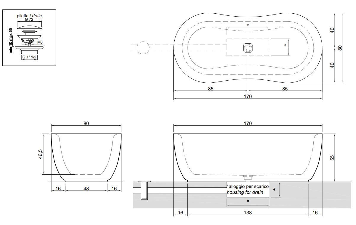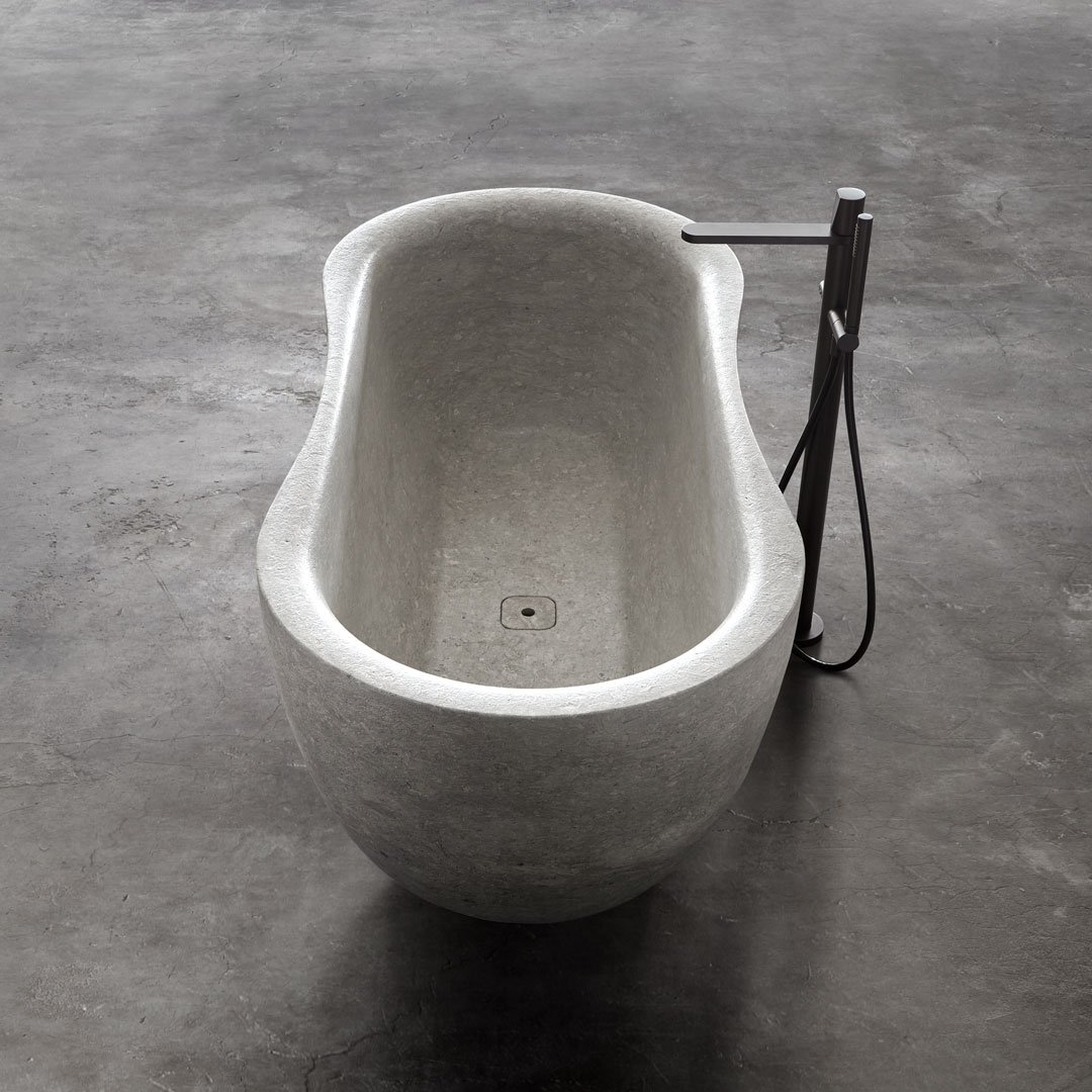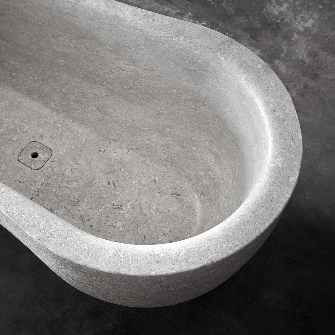 Fida 浴缸的靈感來自大自然。Fida 是一座真正的雕塑,由拉絲的維琴察灰色阿爾卑斯石整塊雕刻而成。具有典型淺灰色的材料以大型化石的存在為特征,為 Fida 浴缸提供了材料與功能之間的現代相遇。外部線條從河流樹林的有機形式中汲取靈感,賦予作品一種流動感。邊緣圓潤,線條流暢。浴缸內部是符合人體工學且精心設計的環境,傳達安全與舒適。