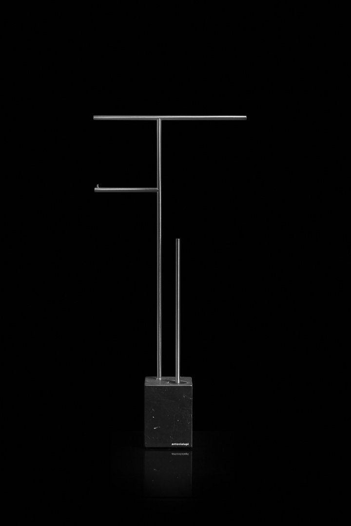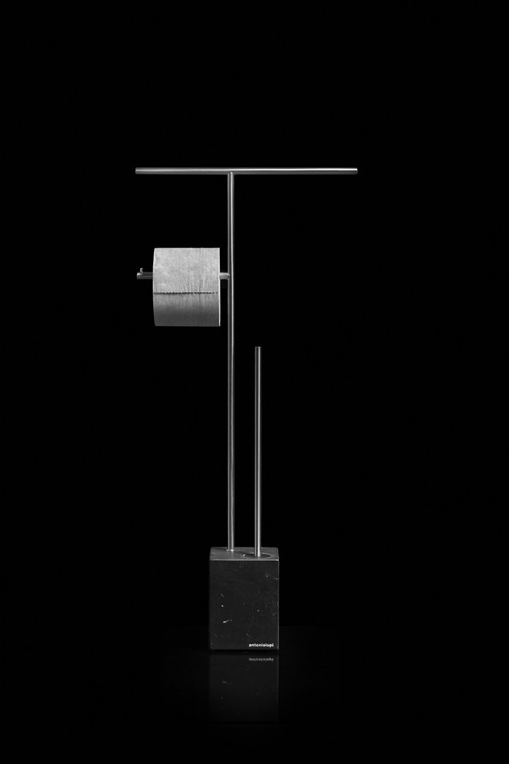 Bivio 系列有一個圖形和嚴謹的標志,插入黑色硅膠刮刀刷架,確保完美的衛生并賦予物品一個創新的概念。Carrara Marble 或 Nero Marquinia 的立方體底座,指的是地球的寶貴遺產,金屬結構采用黃銅和緞面鋼飾面,可根據要求提供各種顏色。