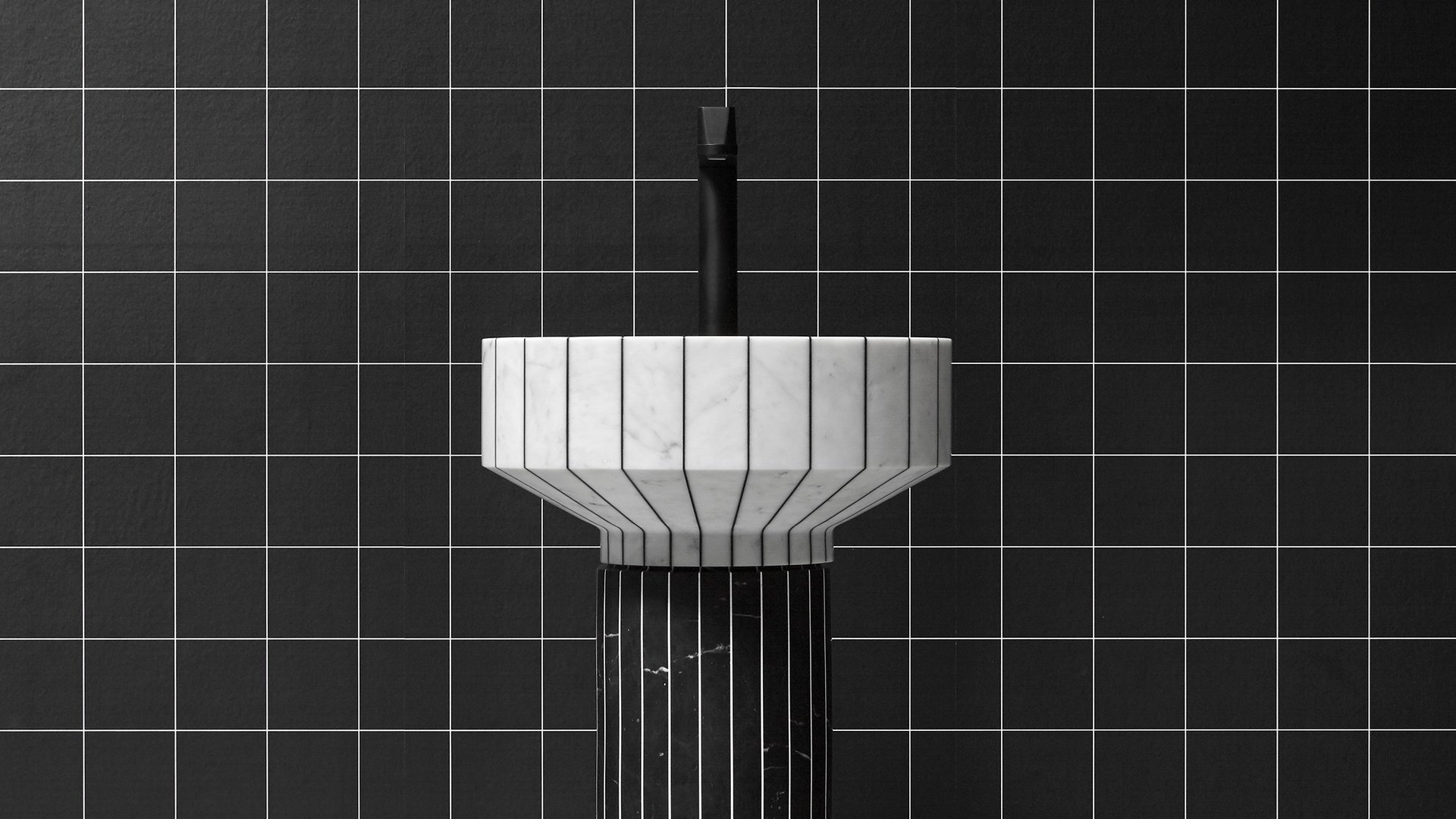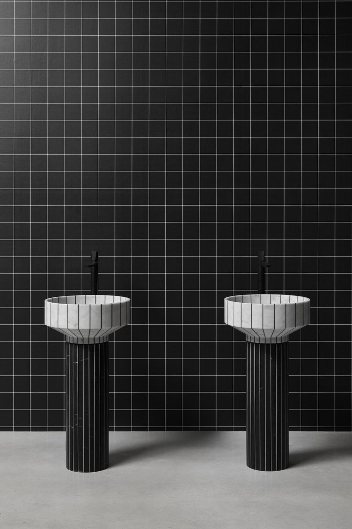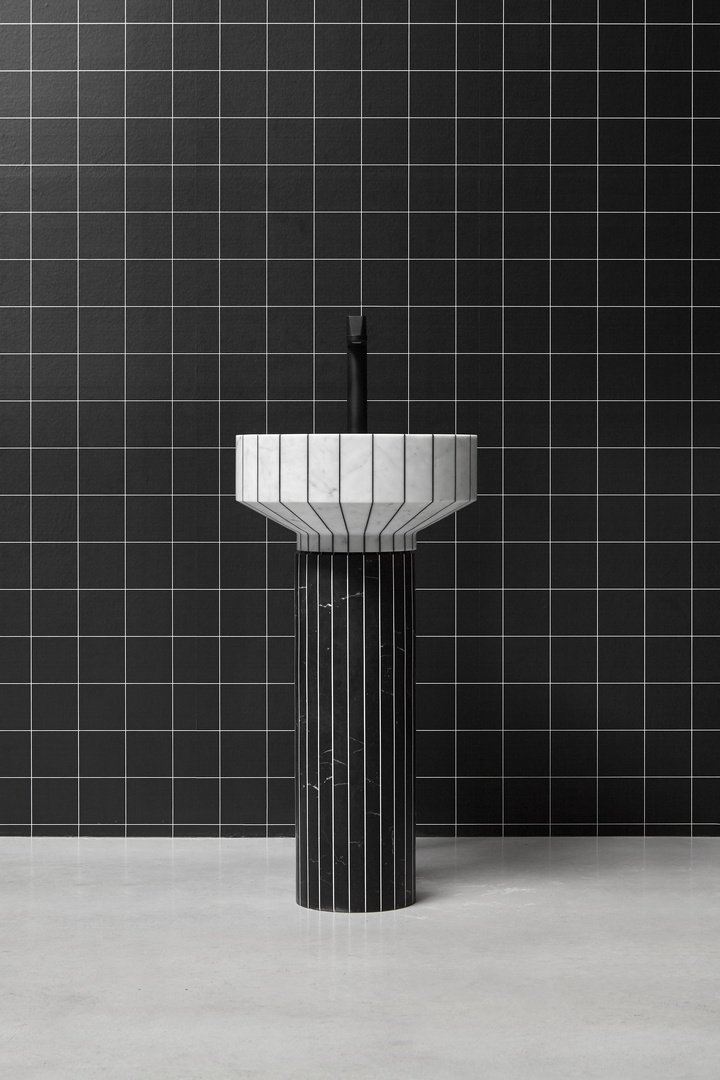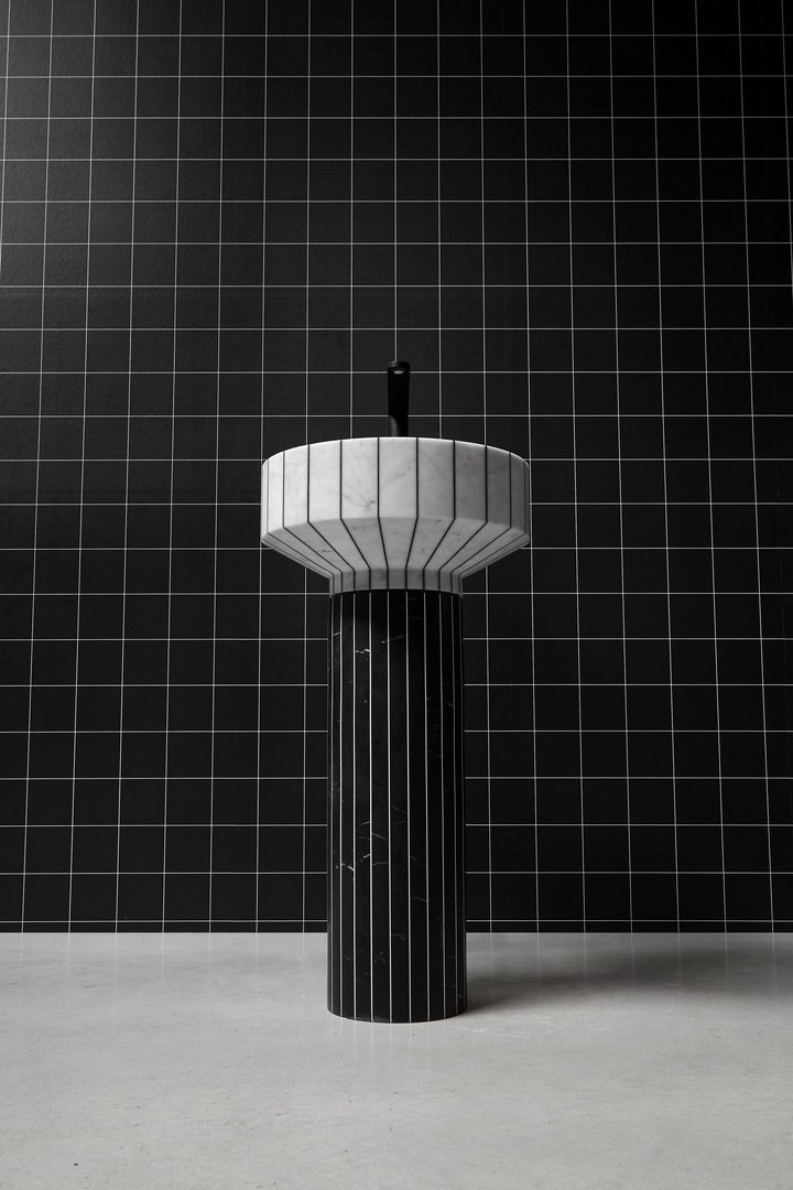 水槽的盆是用卡拉拉大理石和黑色樹脂制成的,相比之下,柱子是用黑色樹脂和白色樹脂制成的。這會產生一種色彩平衡,在不影響整體和諧的情況下改變體積的感知,減輕和“拉長”它們。