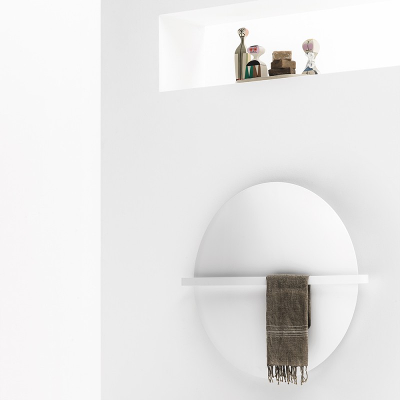 Saturn & Moon round radiators. A highly sculptural piece of Zen minimalism that is calm, contemplative and relaxing. Saturn features a towel holder handle (Saturn’s ring). When the towel holder is removed from Moon, it fits perfectly into any environment.