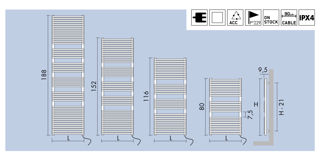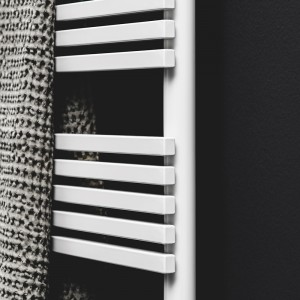 The name of the H_20 Bath electric towel warmer stems from the shape of its elements: rectangular elements with a cross-section measuring 20 mm across and 15 mm high. This distinguishing feature lends this model a sense of modern appeal, while retaining all the functionality of a regular towel warmer. The rectangular elements are then welded onto two manifolds which instead have a round shape and measure 35 mm in diameter.