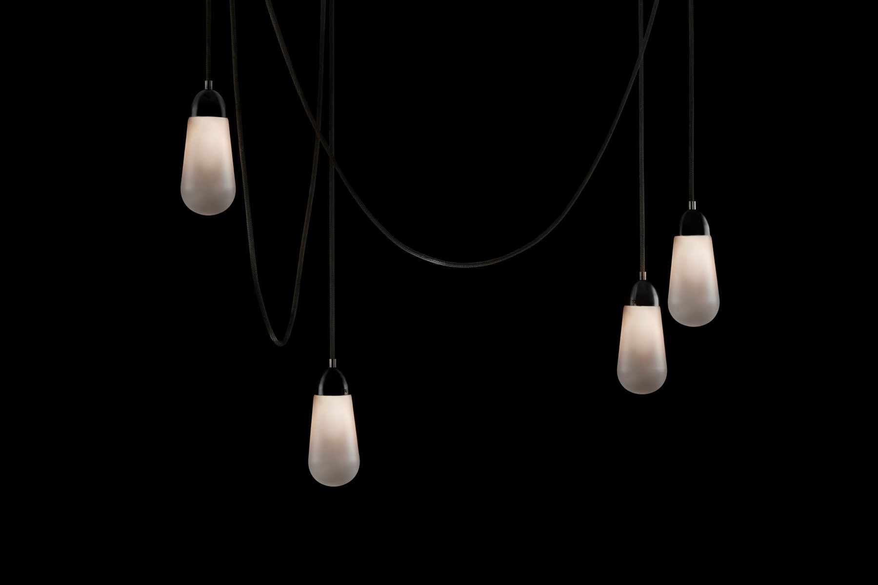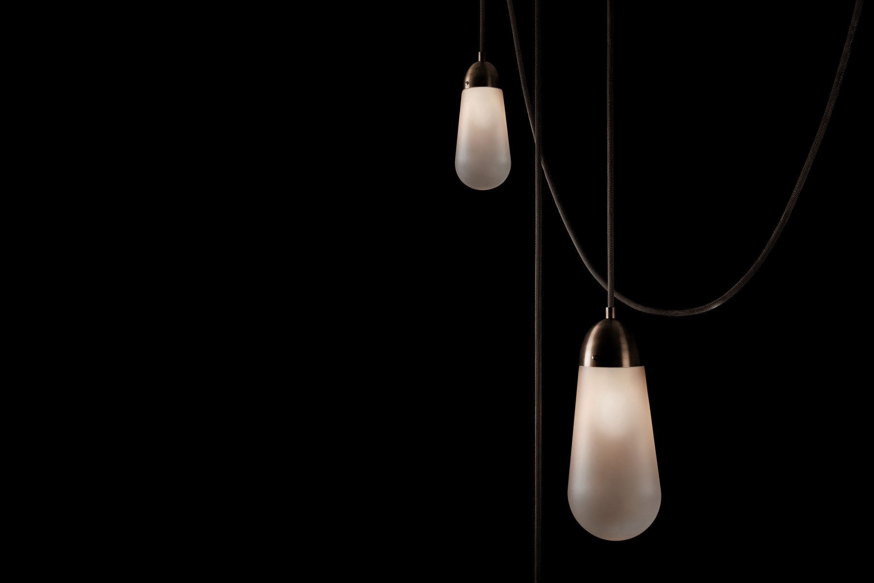 REMINISCENT OF FORMS FOUND IN JEWELRY, ETCHED GLASS TEARDROPS HANG FROM FINELY WOVEN BRASS MESH. TAUT LINES AND GRACEFUL SWAGS ARE WEIGHTED BY ELONGATED ORBS, ADDRESSING AN INTERSECTION OF GEOMETRY AND GRAVITY. CUSTOM INSTALLATIONS ARE DESIGNED BASED ON DESIRED DIMENSIONS AND NUMBER OF PENDANTS. SCONCES AND INSTALLATIONS ARE AVAILABLE WITH LARGE PENDANT OR SMALL PENDANT.
