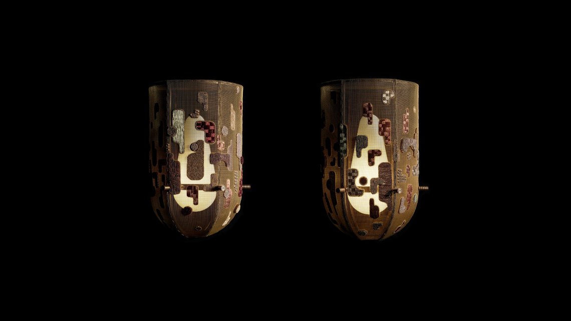 HAND-EMBROIDERED BRASS MESH CREATES A DELICATE CAGE SUSPENDED AROUND AN ILLUMINATED ALABASTER CORE. THE DIMENSIONAL BEADING AND THREADWORK EVOKE SYNESTHETIC INTERPRETATIONS OF A MUSICAL SCORE, ORGANIC FORMS RECORDED ON A STRICT GRID. THE ROUNDED SILHOUETTE OF THE MESH CAGE FORMS A VEIL OVER THE GLOWING STONE, AN AIRY METALLIC CONTRAST TO THE WARMLY GROUNDED MATERIAL.