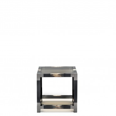 A masterpiece of contemporary design, the Alcamo side table is a refined combination of precious materials and organic geometries. Gunmetal brass detailing and appealing inlays in dark horn enrich its square structure in glossy black lacquered wood while offering a captivating textural contrast. Coming with a refined tabletop and lower shelf in tempered smoked glass, this side table will be a tasteful addition to your domestic setting.