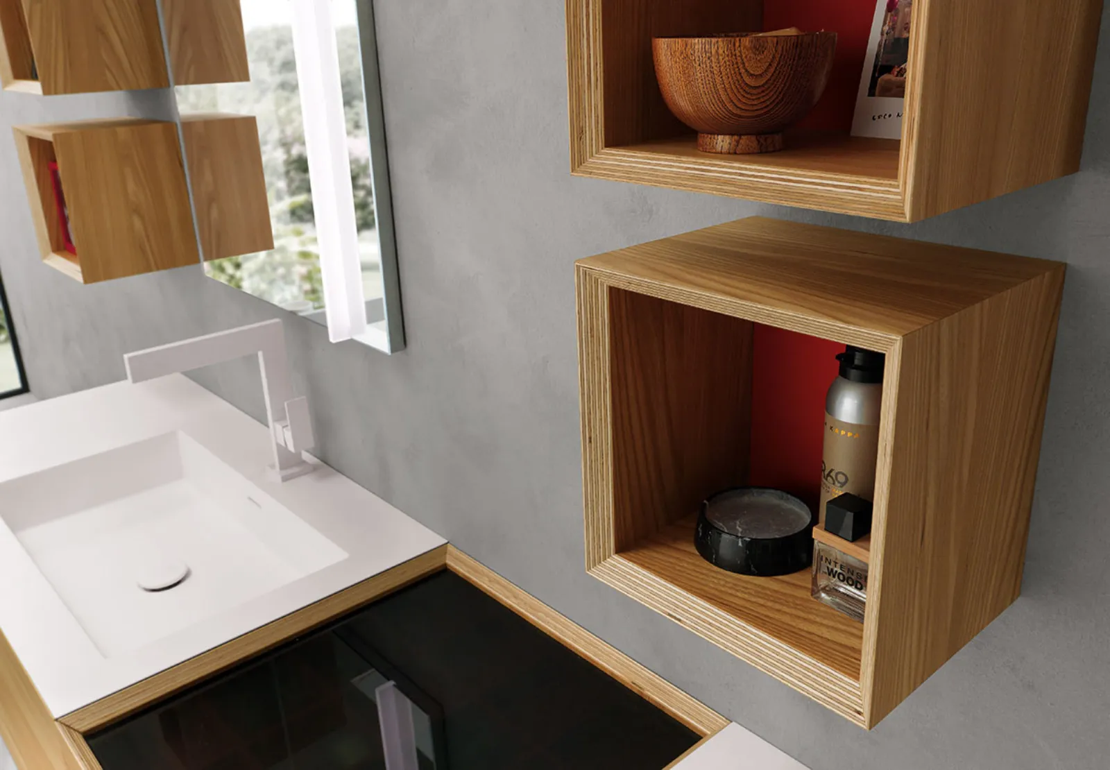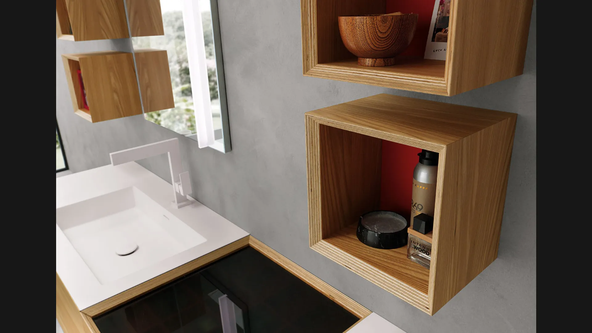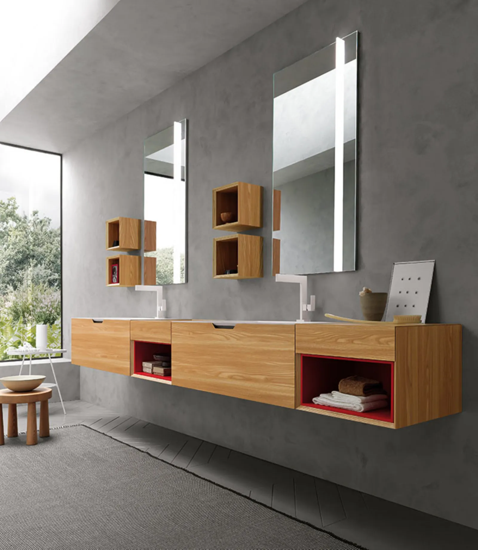 Olmo con particolari Laccato Rosso Opaco, lavabi monoblocco in Tecnoril e specchi Modular.