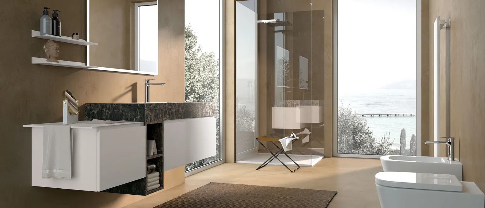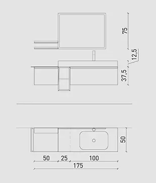 Laccato Bianco Opaco con base a giorno hpl Brown 425. Top hpl Brown 425 con vasca integrata “on” in Ocritech, specchio Luna.