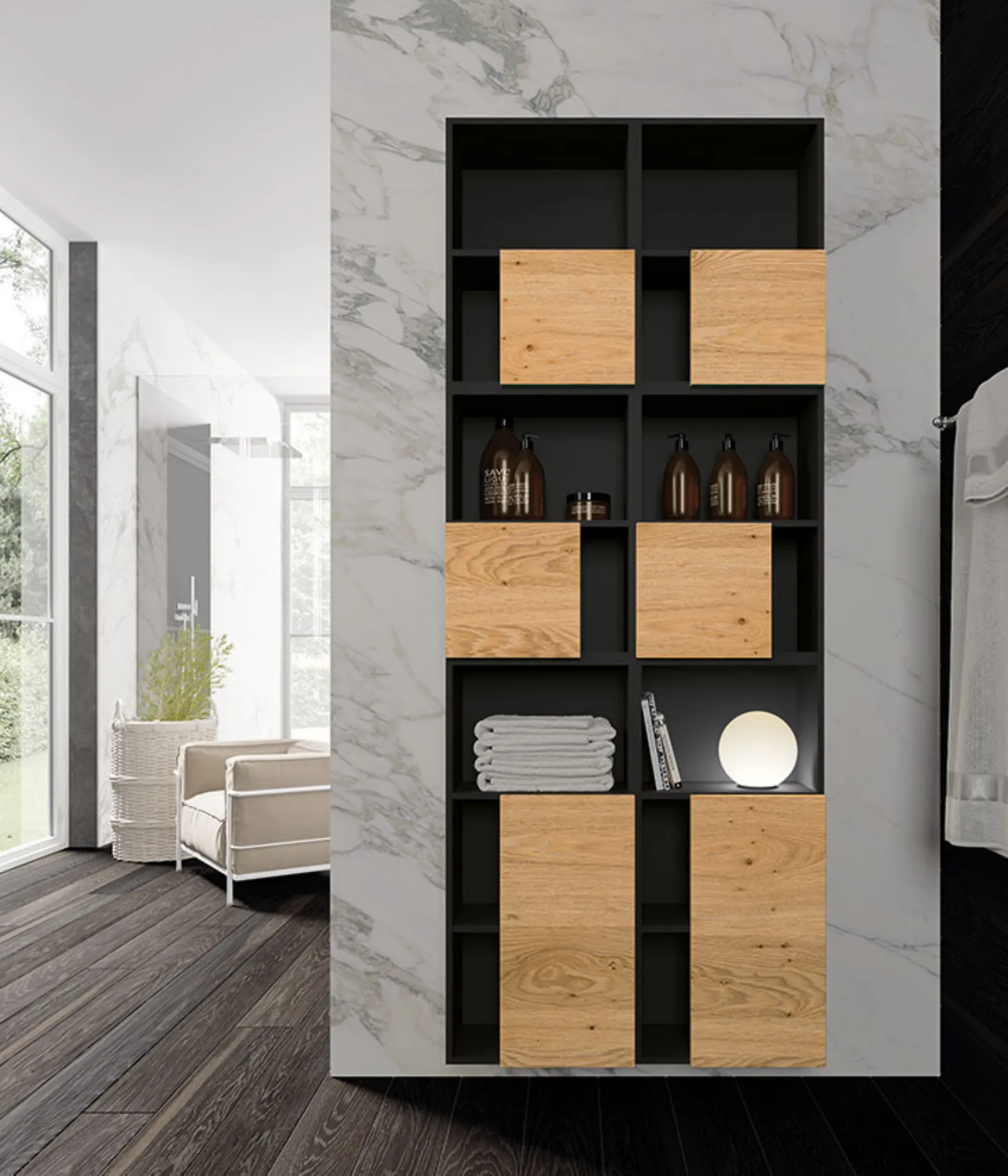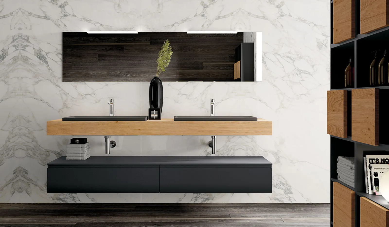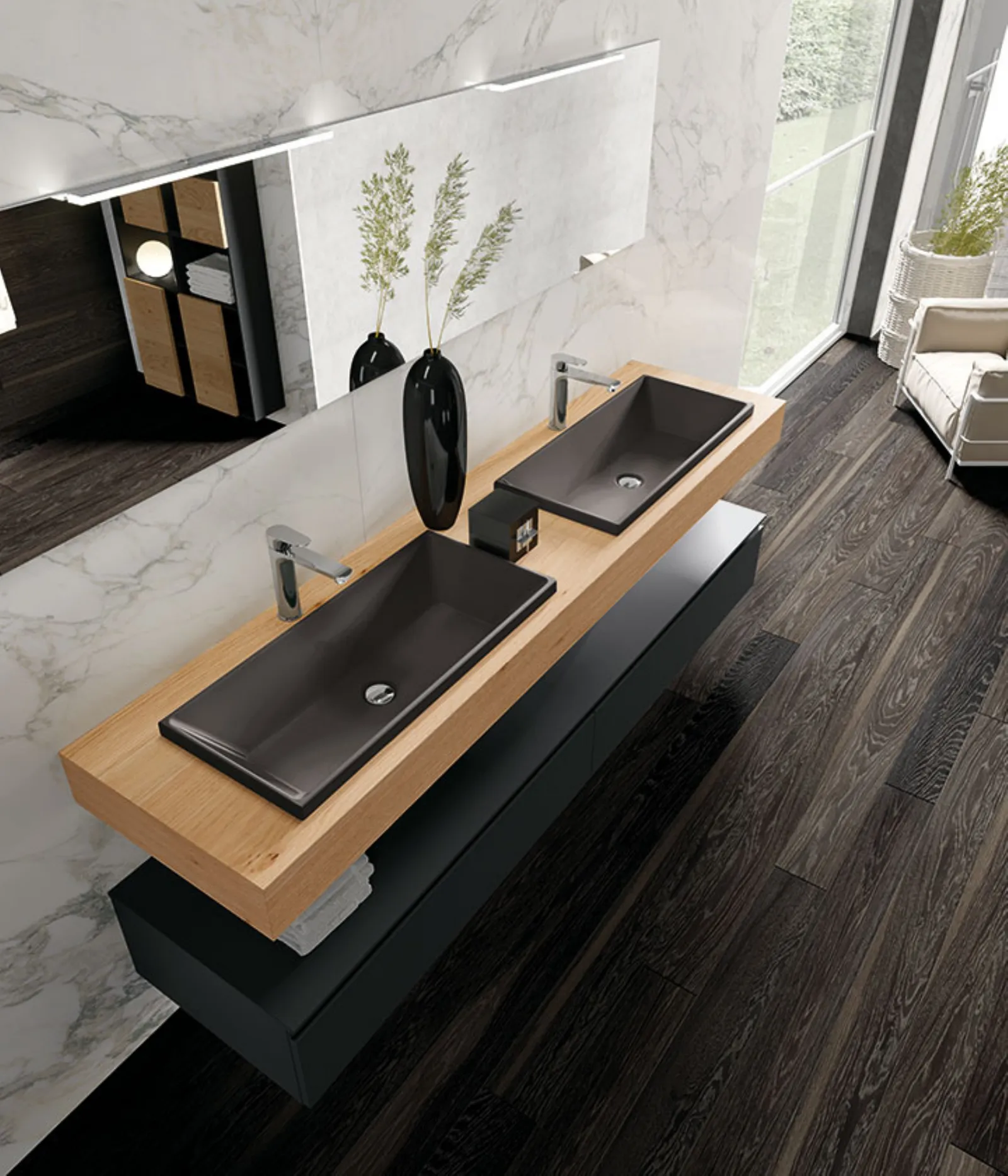Laccato Nero Opaco, top Nordico Naturale, lavabi Regolo in ceramica nera, specchio profilo alluminio e lampade Clio Slim.