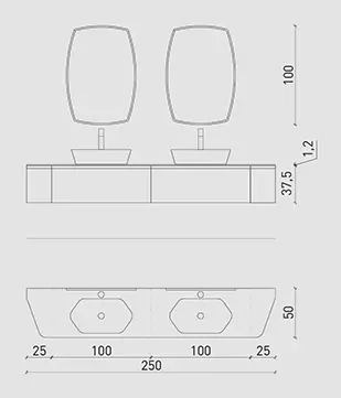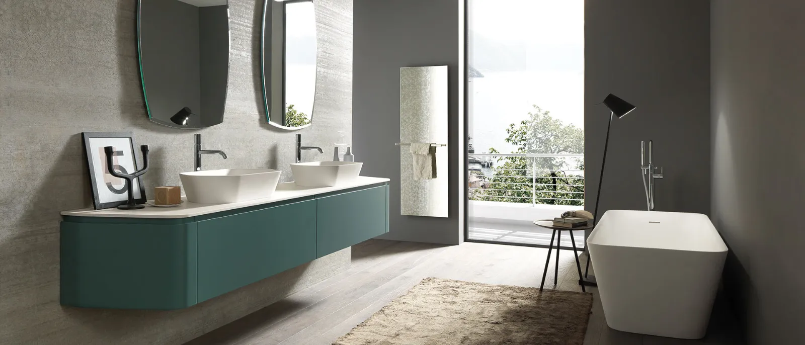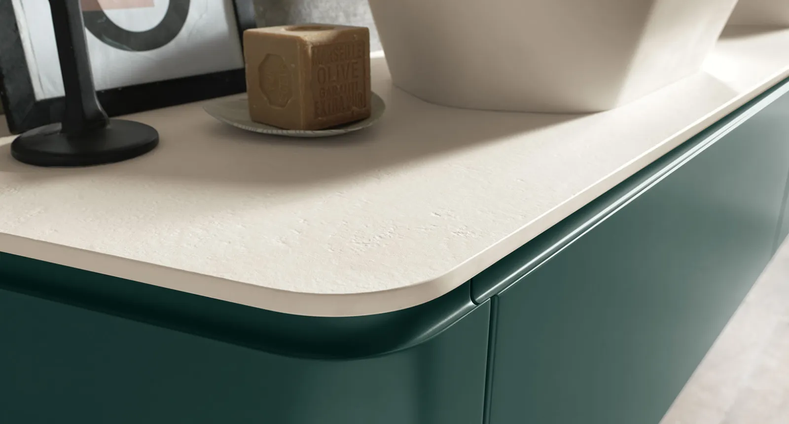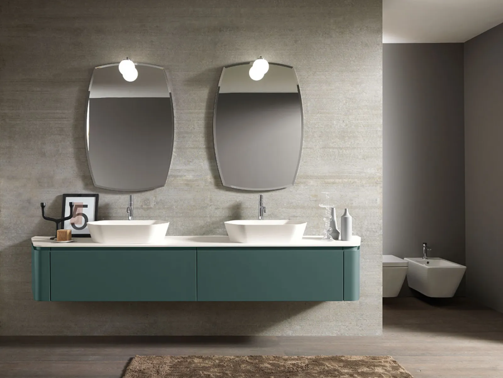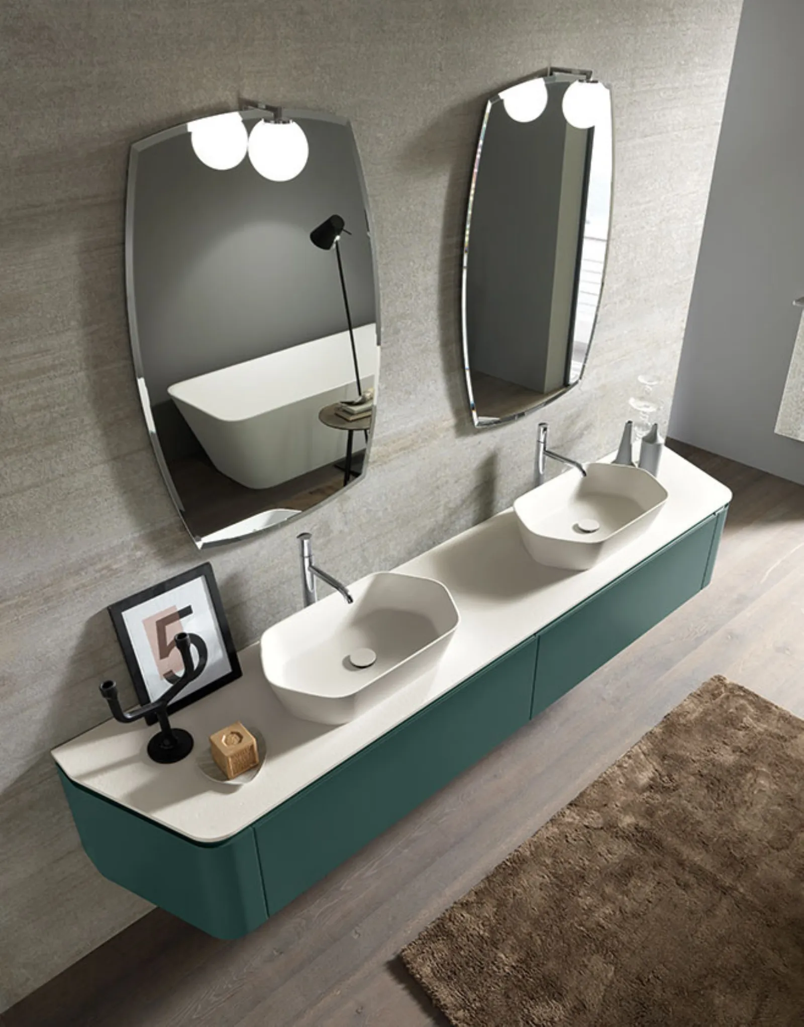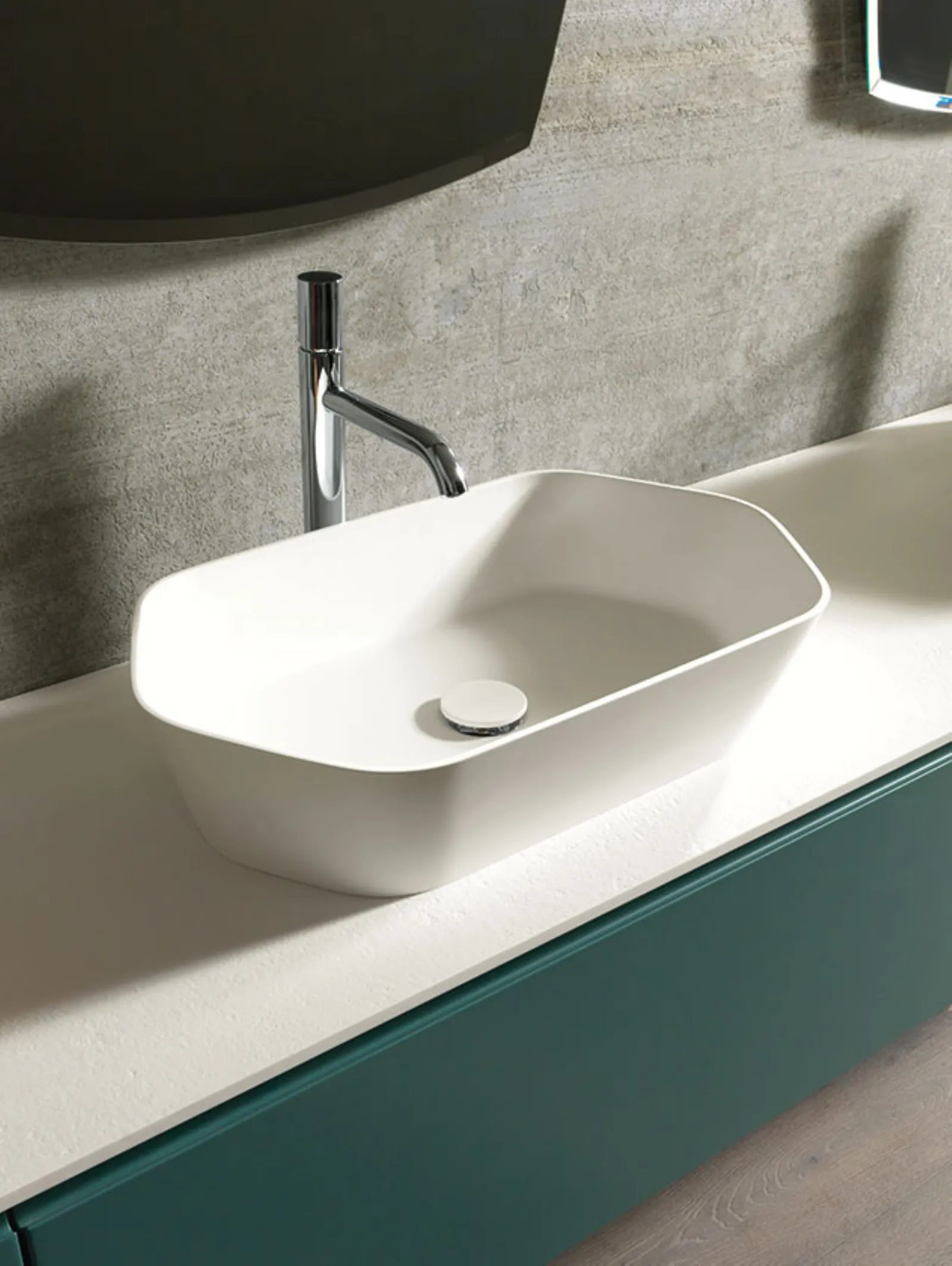 Laccato bosco opaco, top e lavabo Maya in Deimos stone texture bianco traffico. Specchio vintage con lampada sfera.
