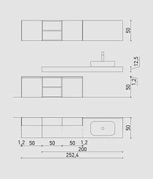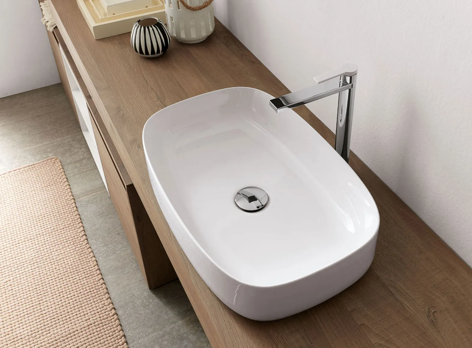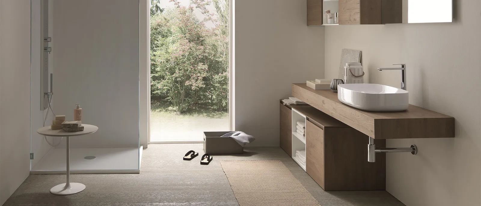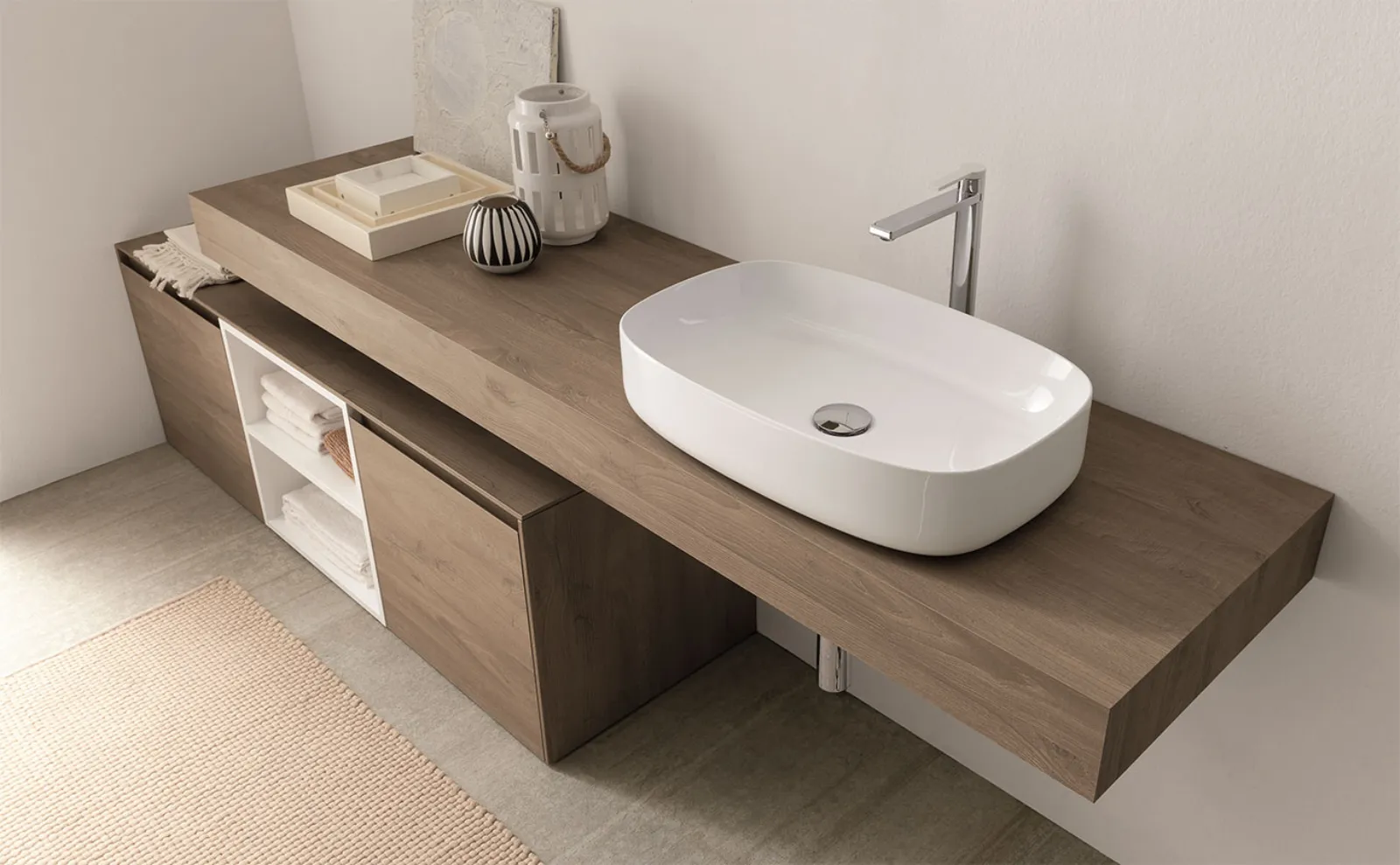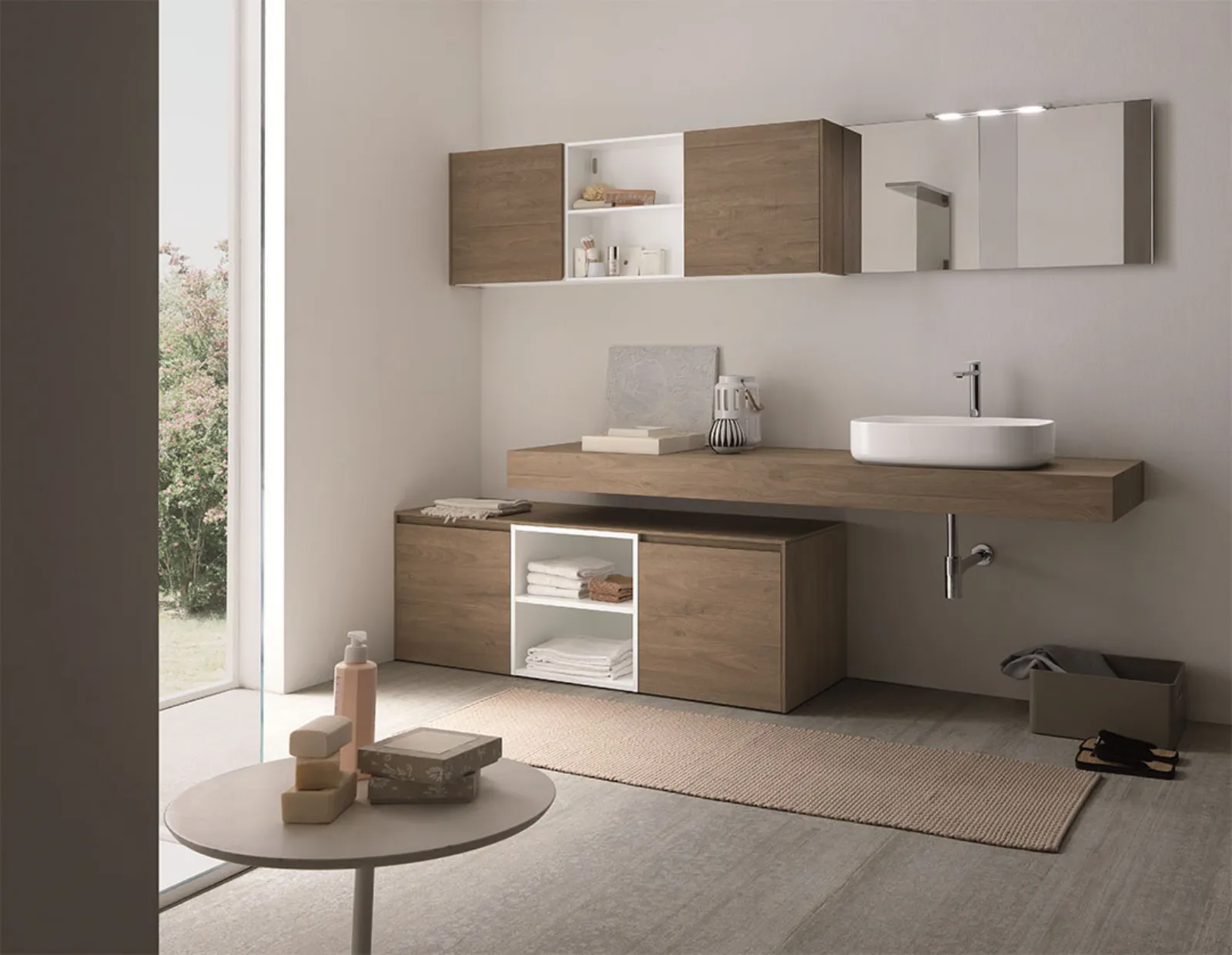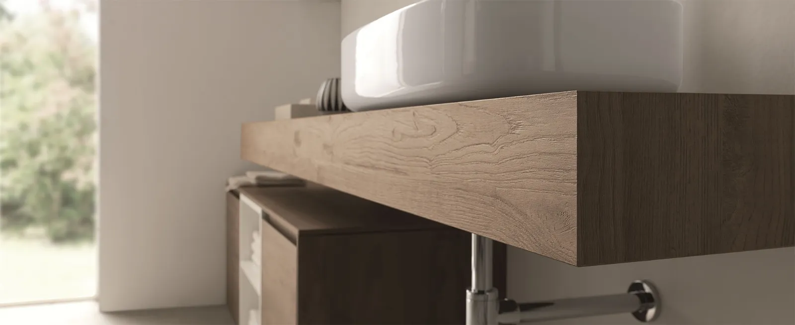 Nodato Savana e laccato Bianco opaco, top Nodato Savana con lavabo Elite, specchio e lampada Filo.