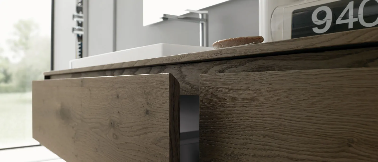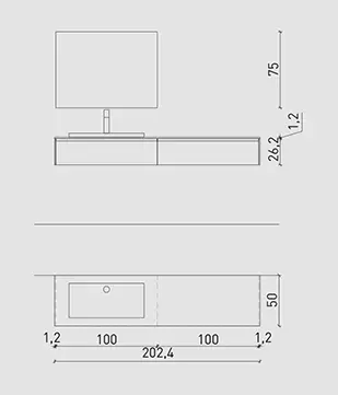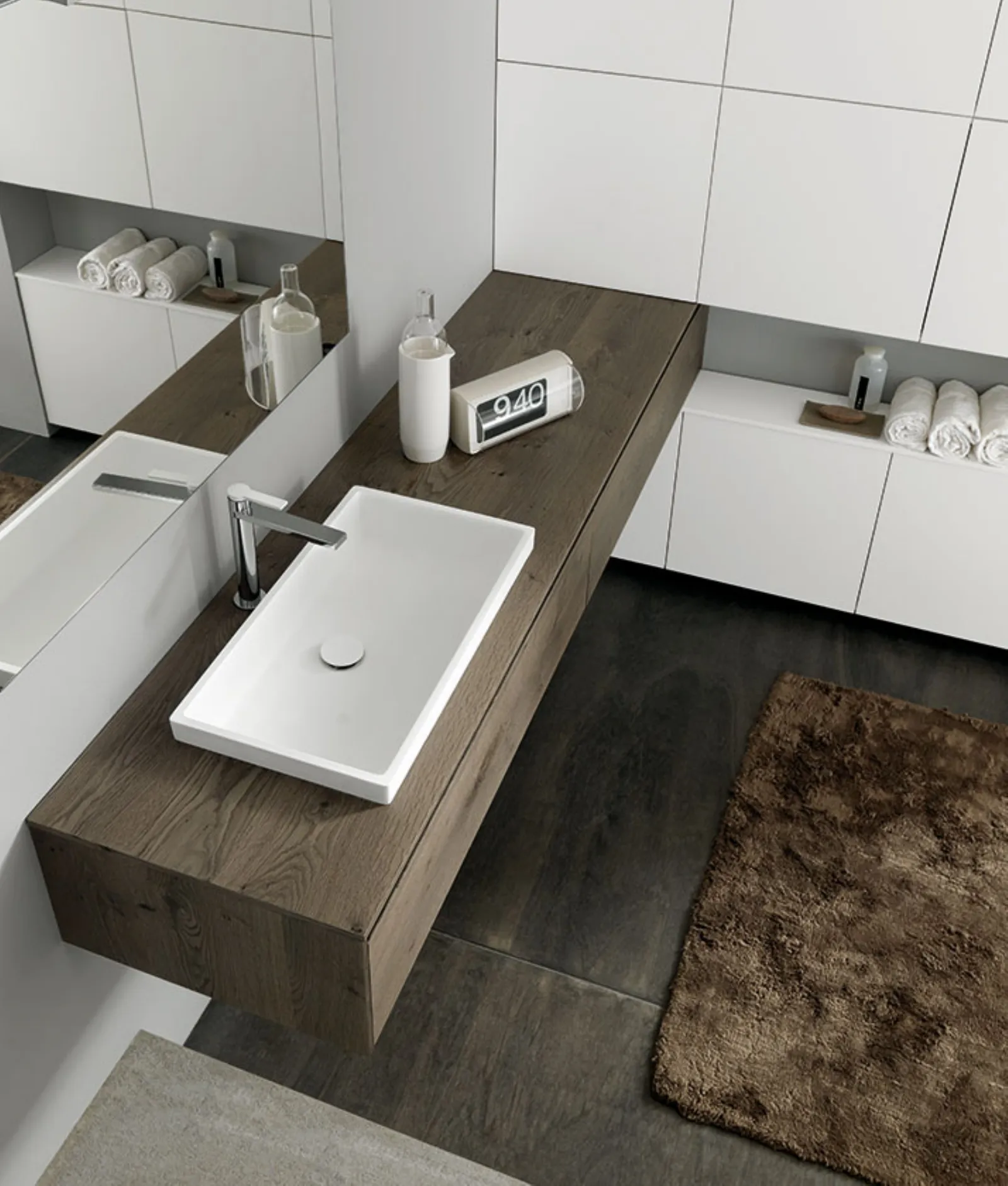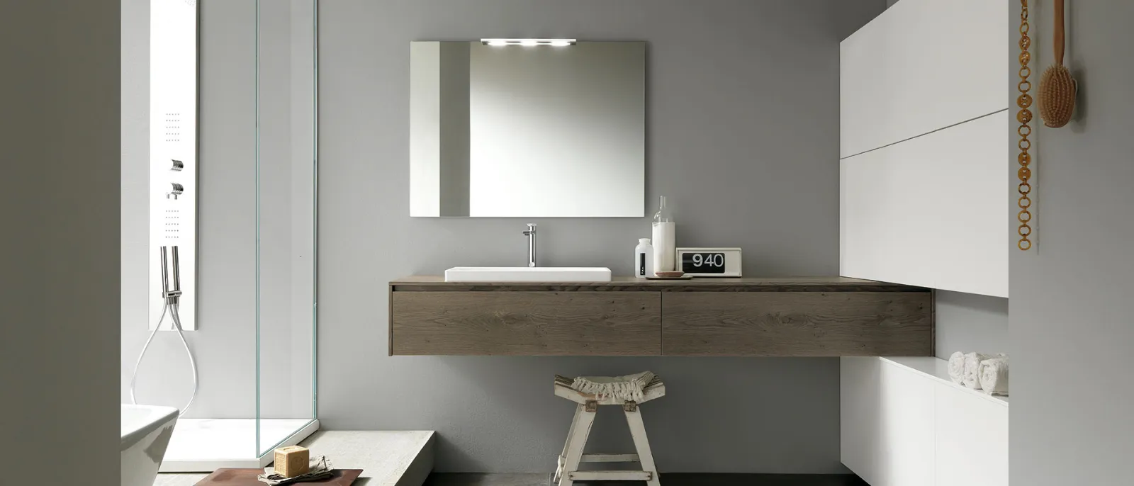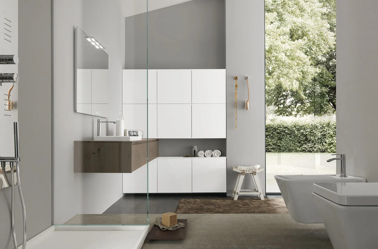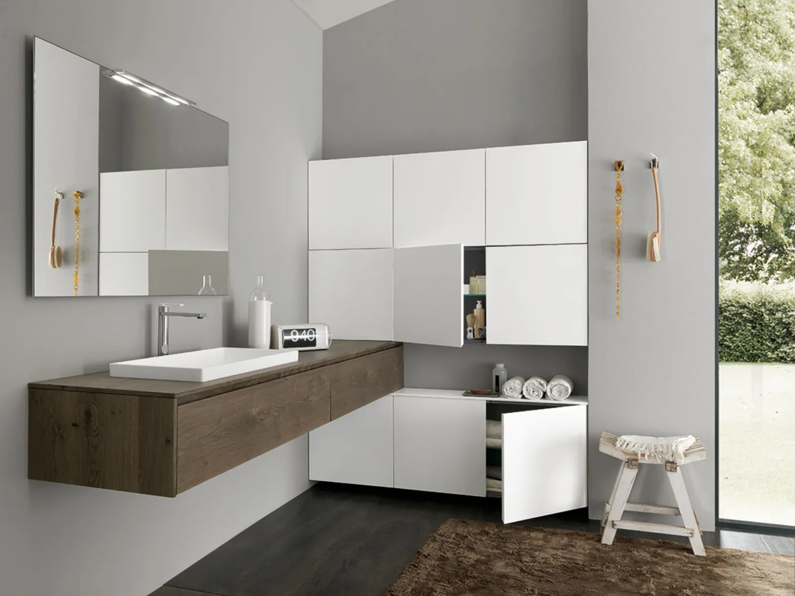 Nordico Caffe?, pensili laccati Bianco opaco, top Nordico Caffe? con lavabo in Tecnoril Regolo, specchio Filo.