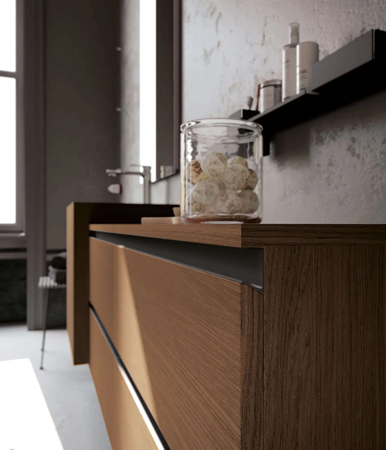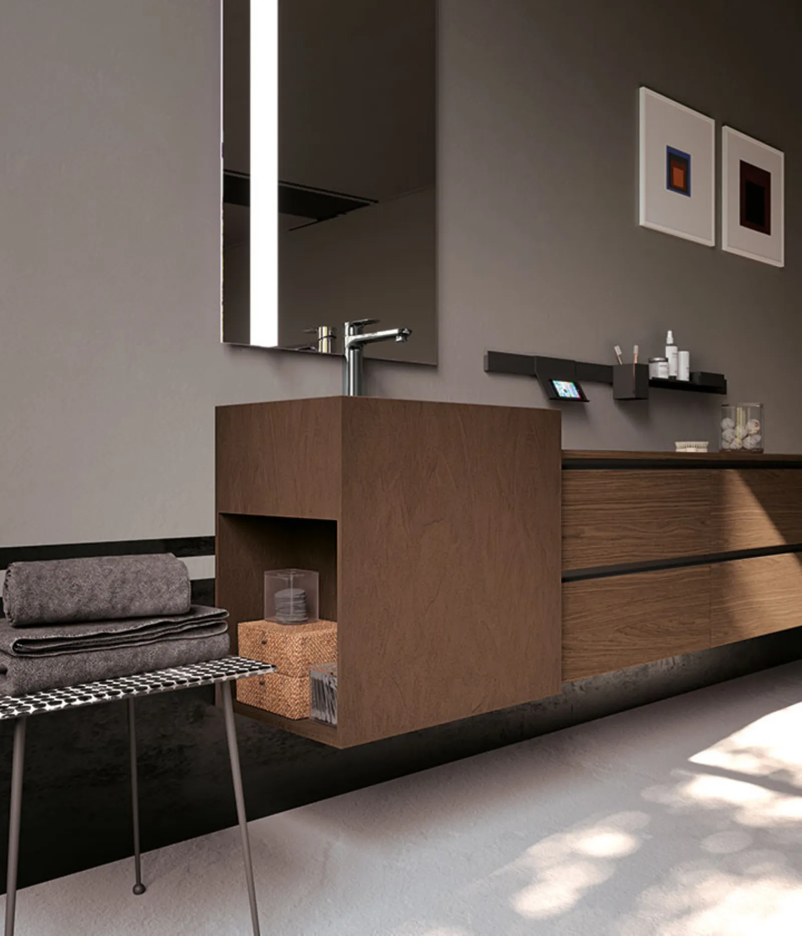 Impiallacciato Rovere Fiammato Castagna con maniglia Titanio. Lavabo sospeso muro-tre-r in Terre Ombra con vano a giorno laterale, specchio Modular.