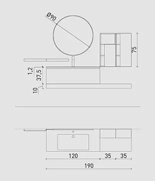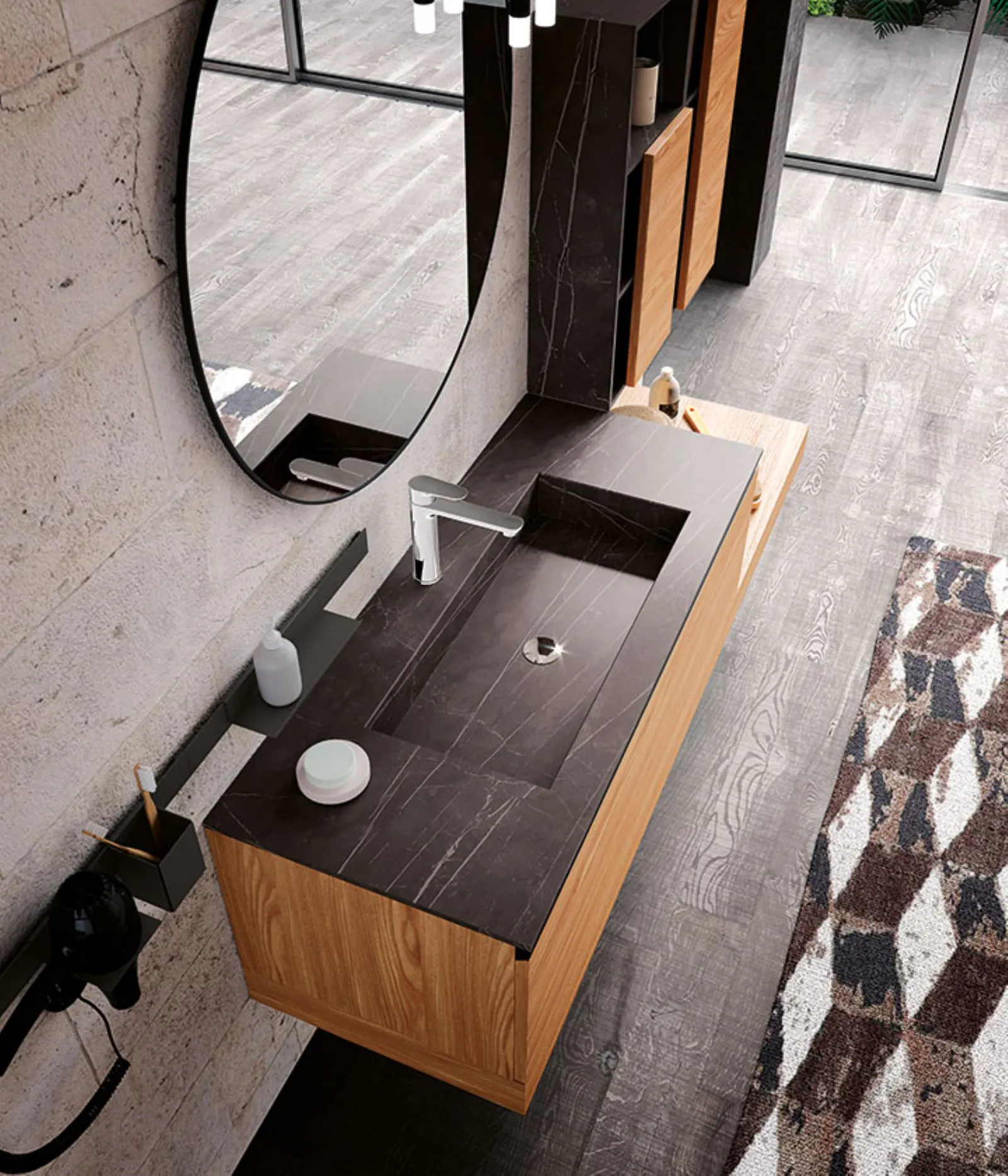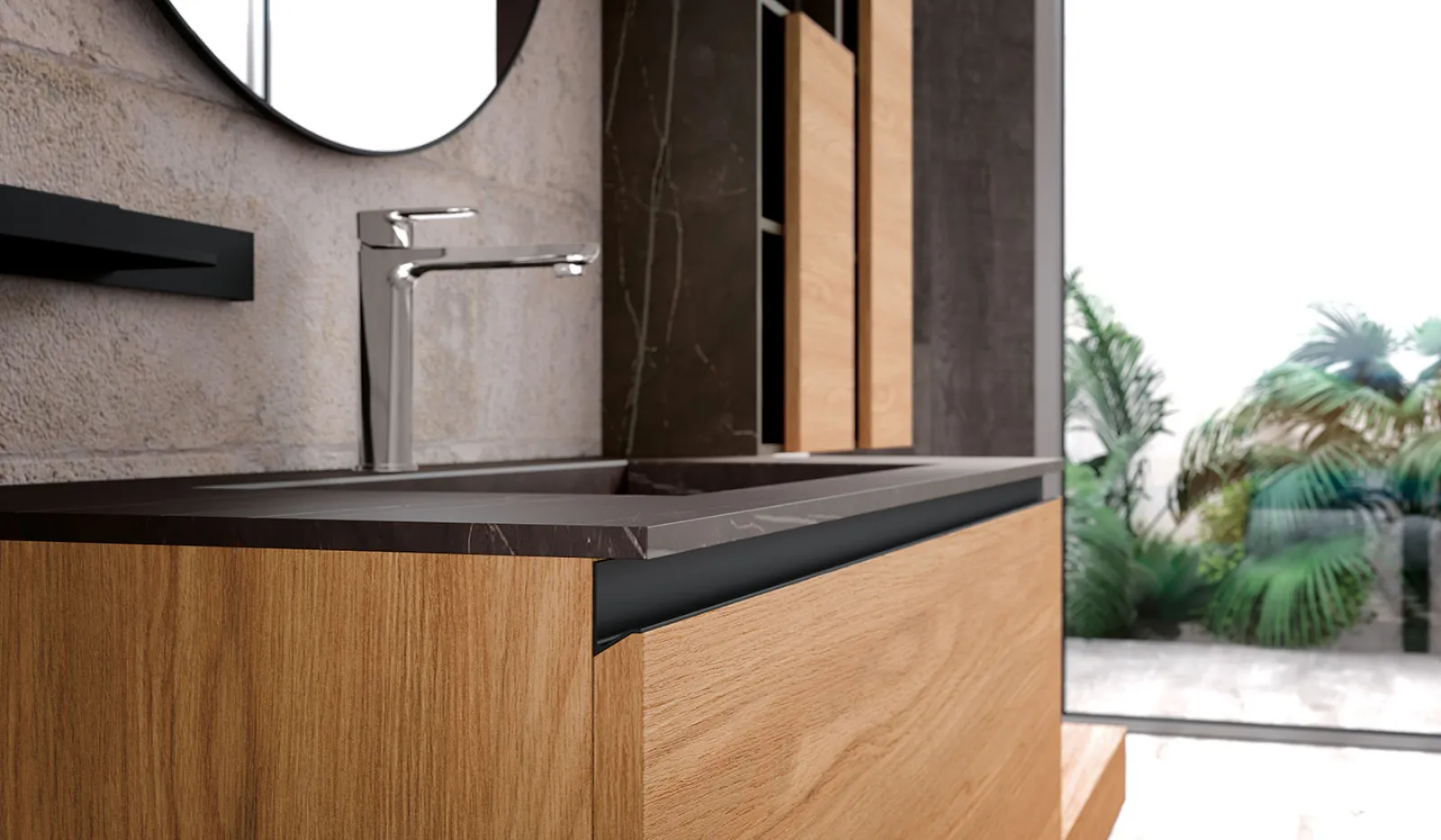 Impiallacciato Olmo con particolari Hpl Tobacco 440 e maniglia Titanio. Top Hpl Tobacco 440 con vasca integrata “HH”, specchio Gamma e lampade Tube in metallo nero