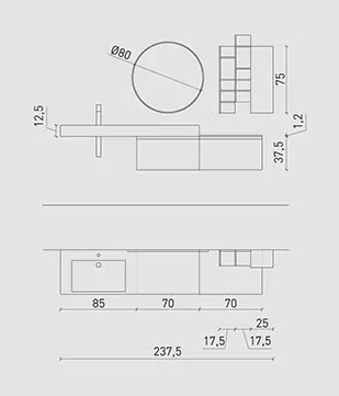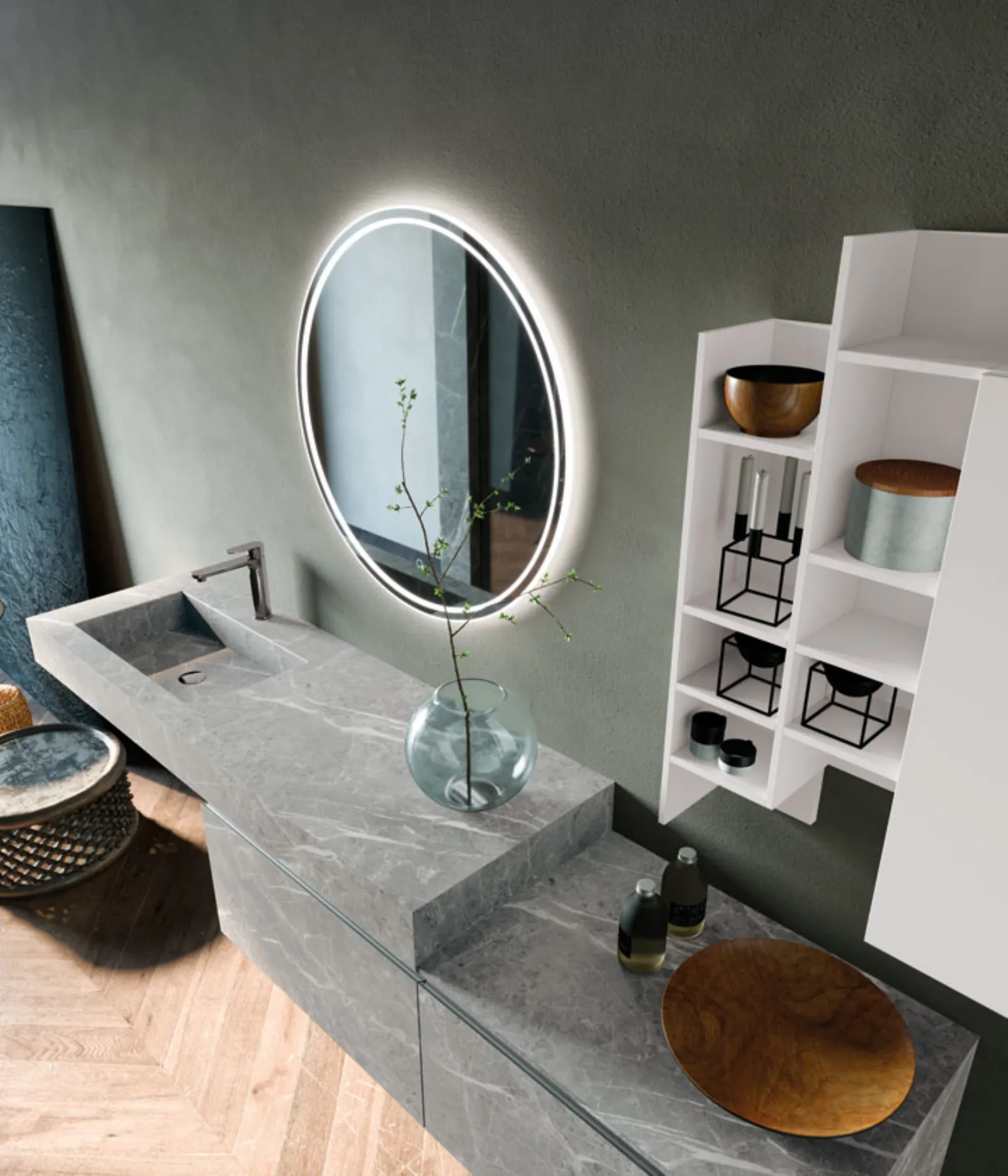 Hpl Antique, maniglia alluminio satinato, pensile ed elementi a giorno “Square” laccati Bianco Opaco. Top hpl Antique sp. 10 cm con vasca integrata “HF”, specchio Moon.