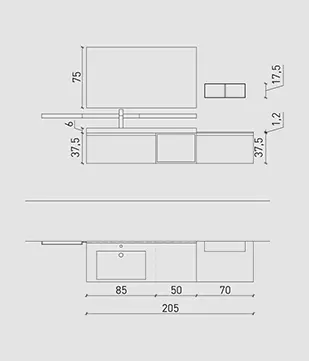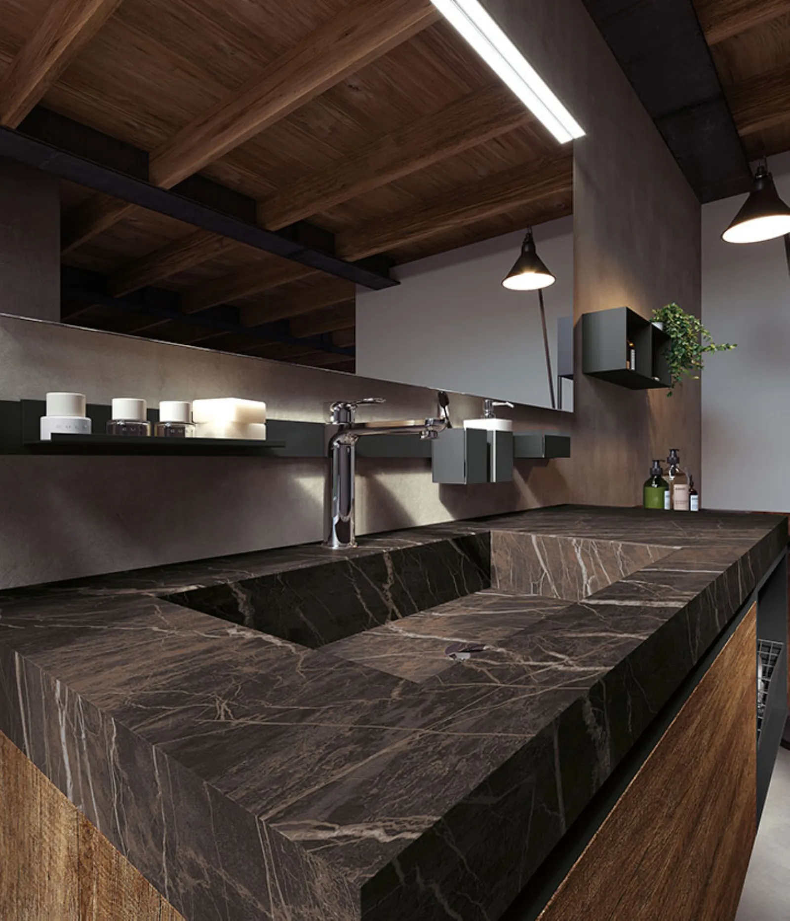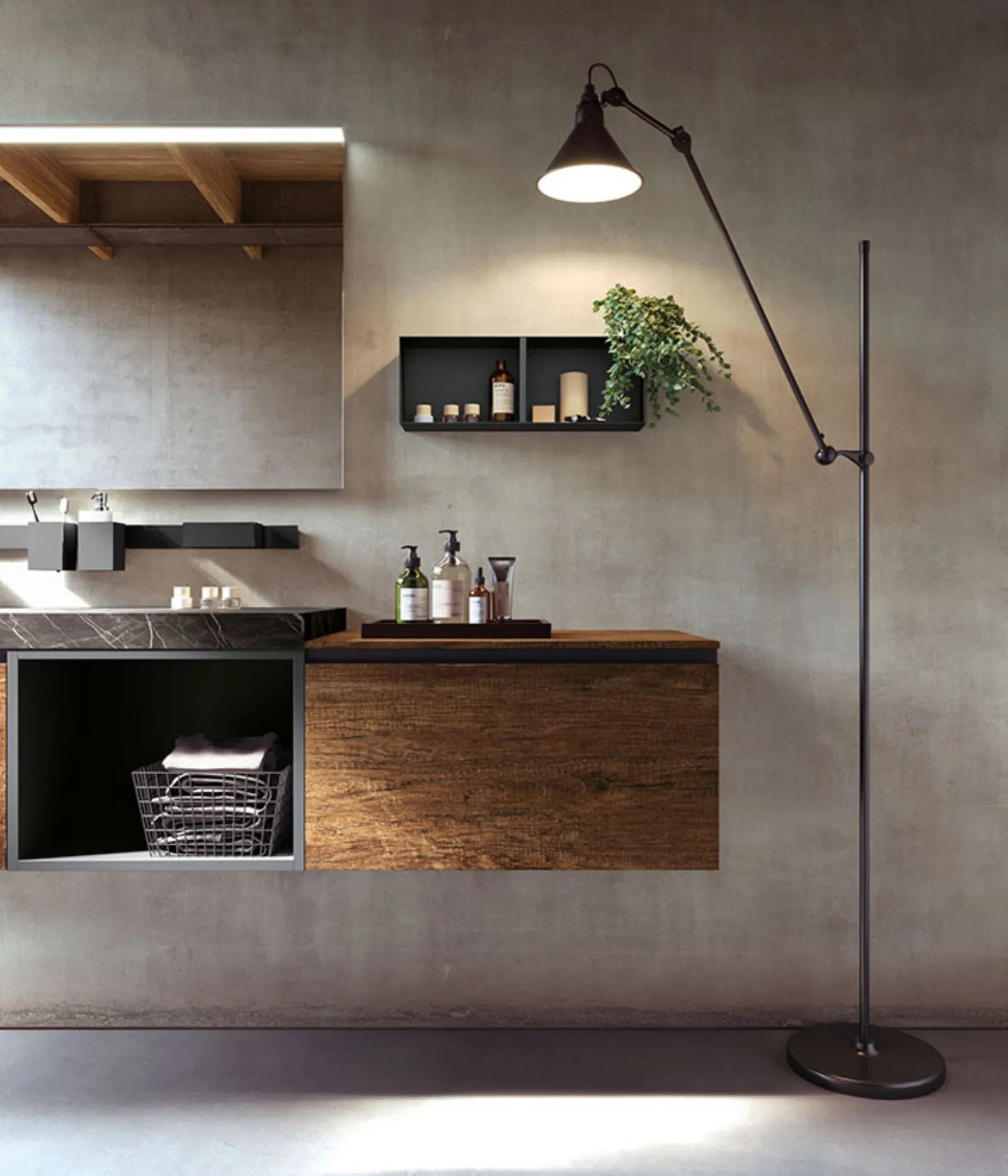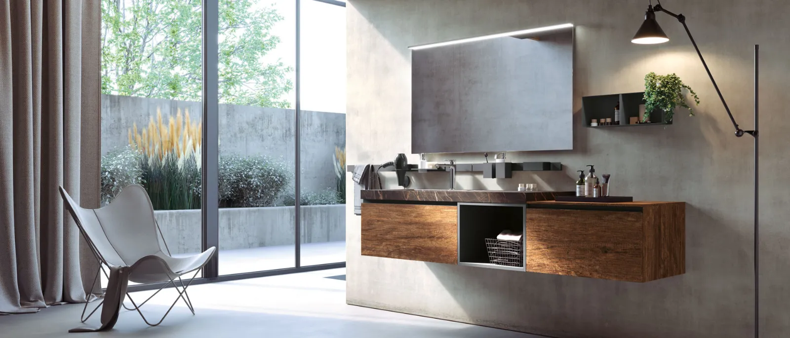 Nodato Canyon con particolari laccati Titanio e maniglia Titanio, top gres Noir Desir opaco sp. 6 cm con vasca integrata “gg”, specchio Filo con lampada Metro.