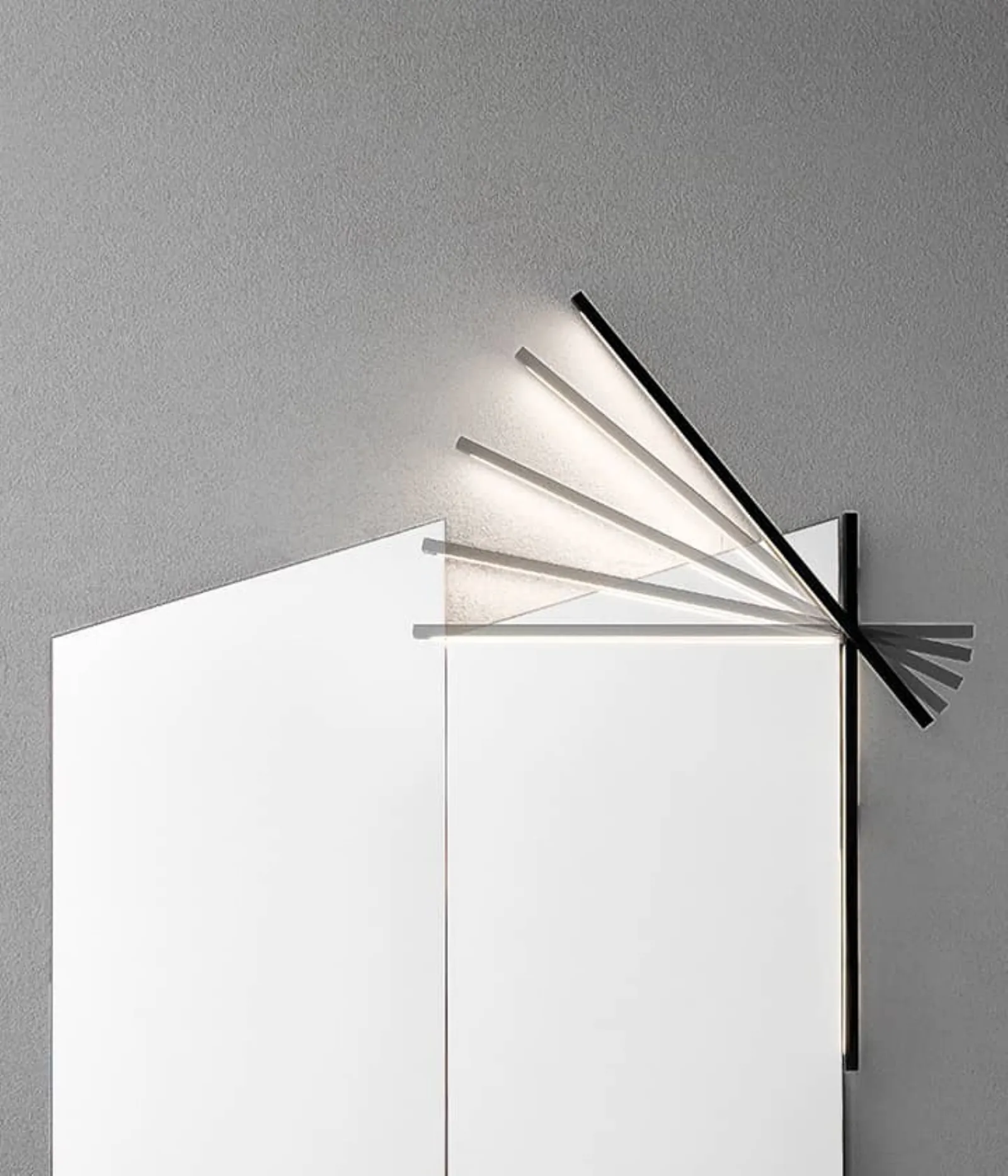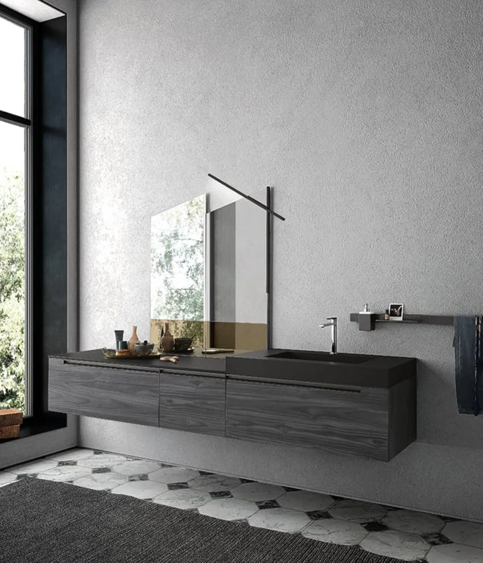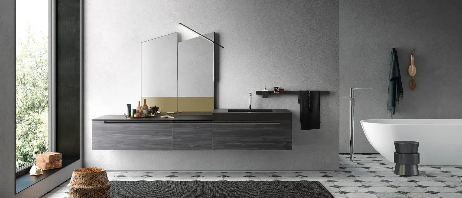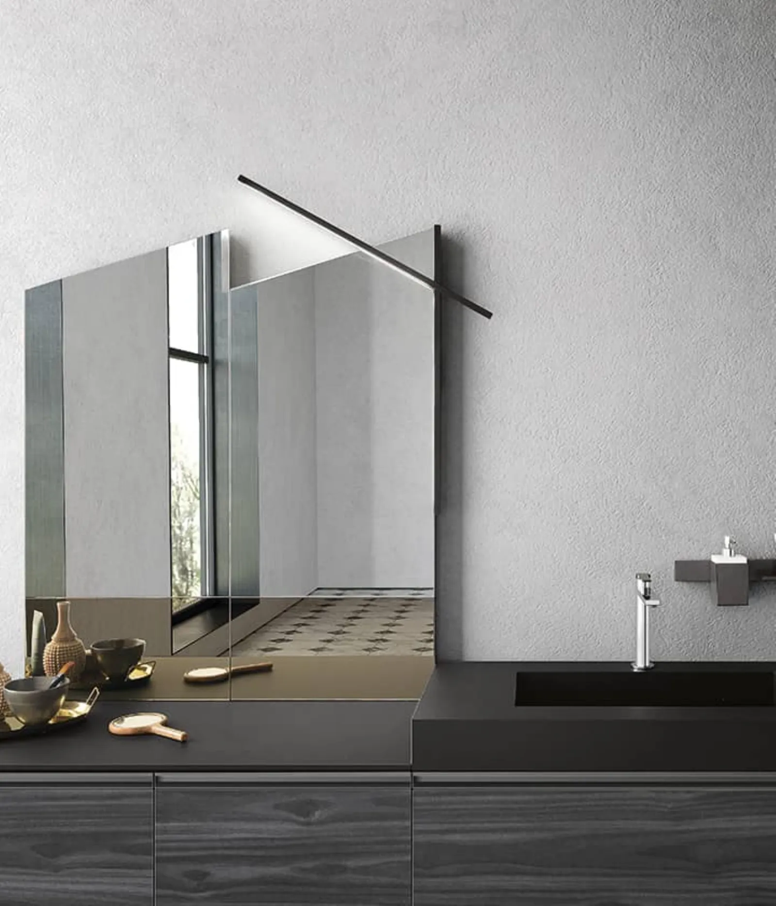 Bimelaminico Shibuya con maniglie titanio. Top in fenix nero 720 con vasca integrata HG. Specchi Line con lampada Compasso.