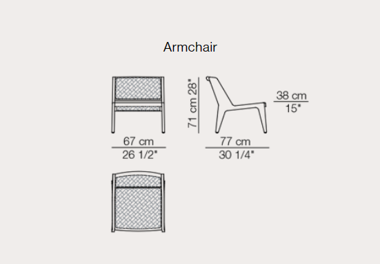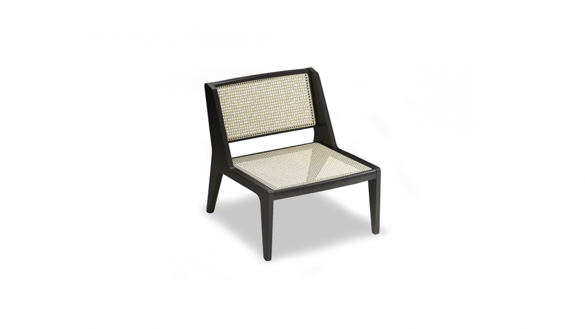 The Delta Vienna lounge chair is distinguished by the triangular, almost wing-like legs and the backrest sides. This distinctive silhouette, made from solid wood, contrasts with the seat and the backrest in “Paglia di Vienna” rattan.